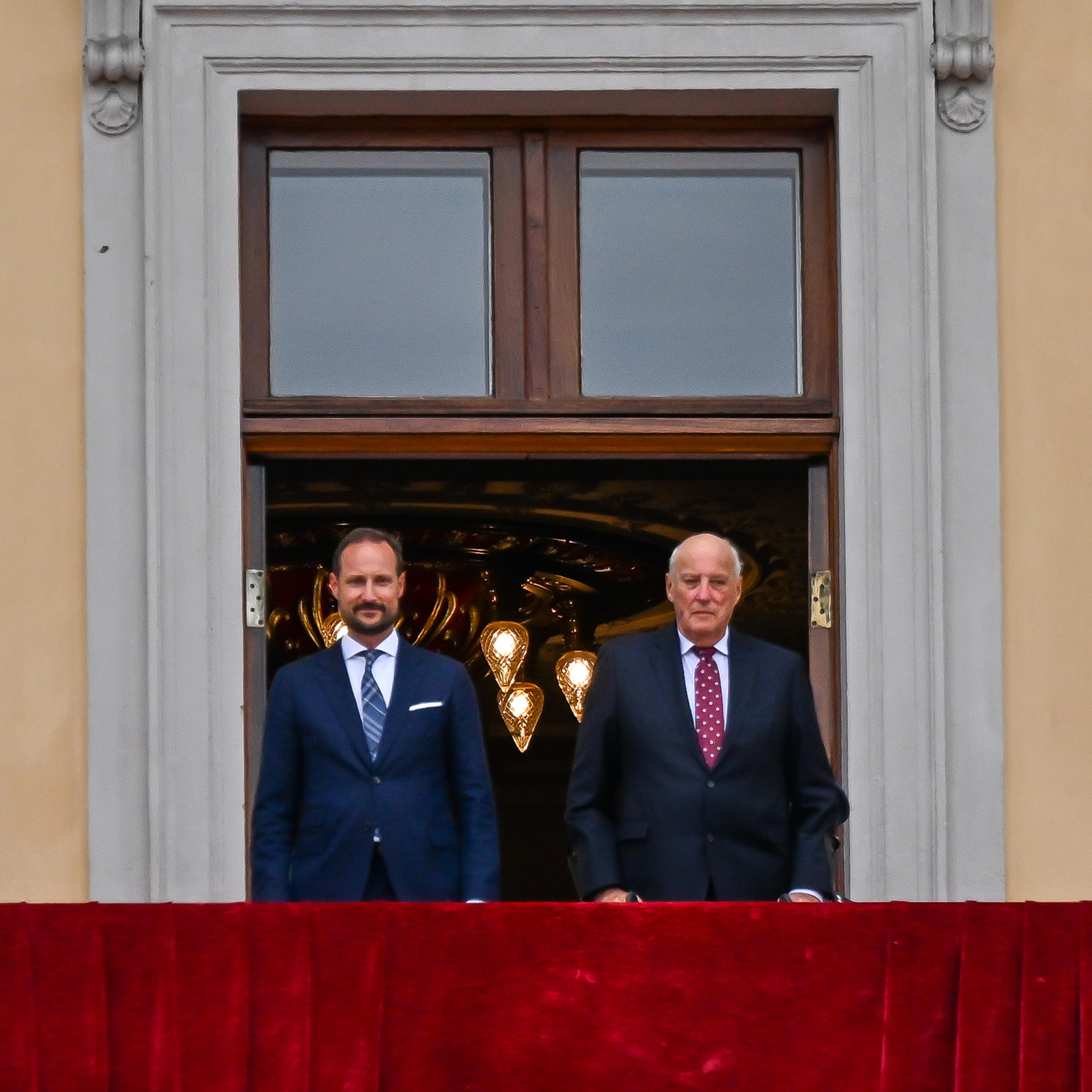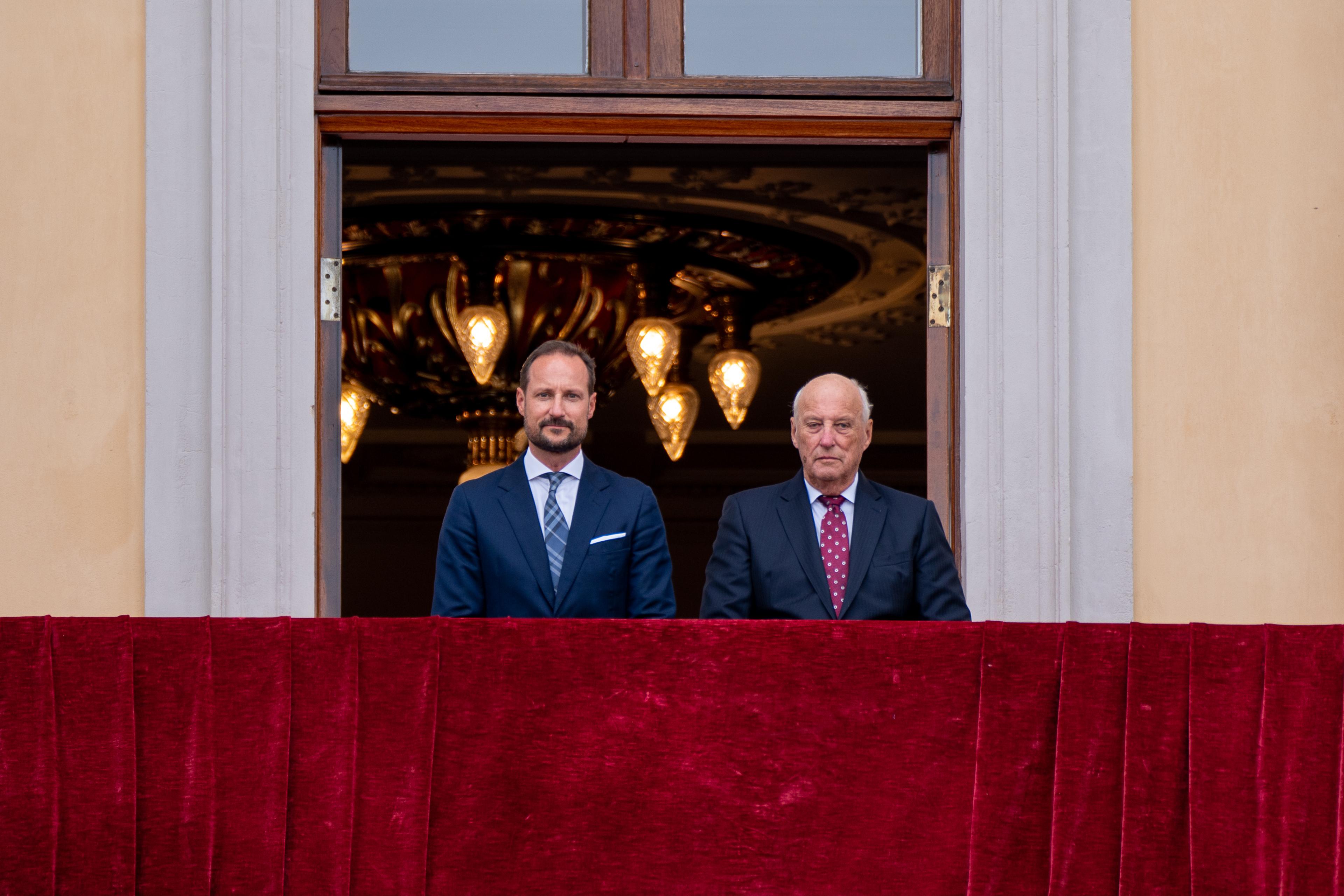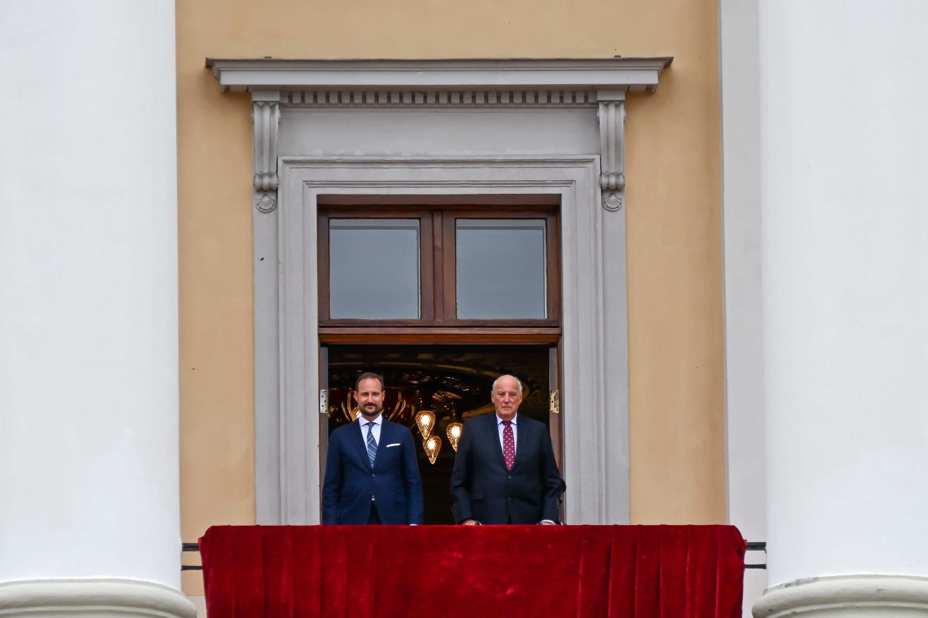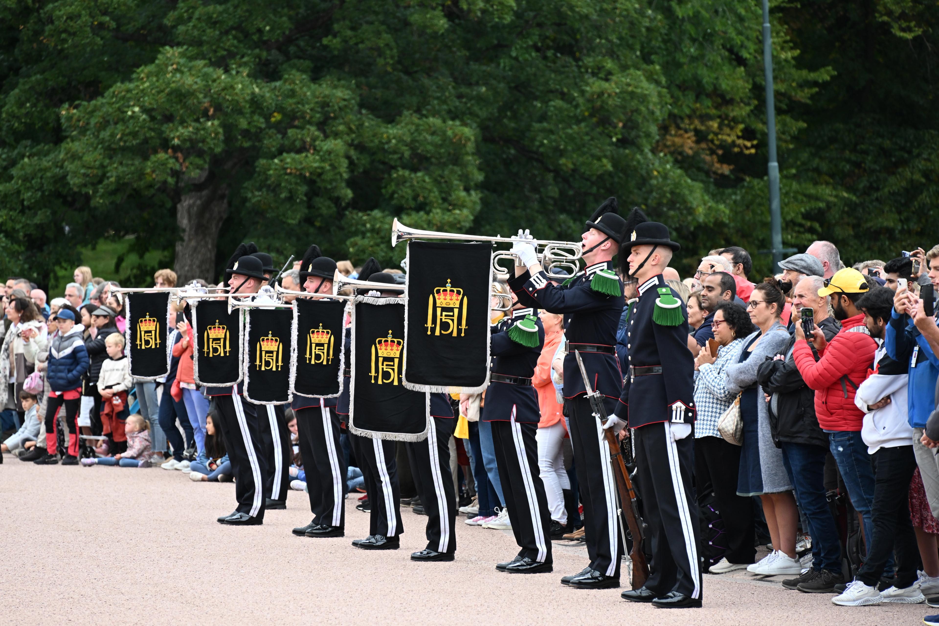 Hans Majestet Kongen og Den Høgvørde Kronprinsen overvar i ettermiddag drilloppvisninga til H.M. Kongens Garde på Slottsplassen.