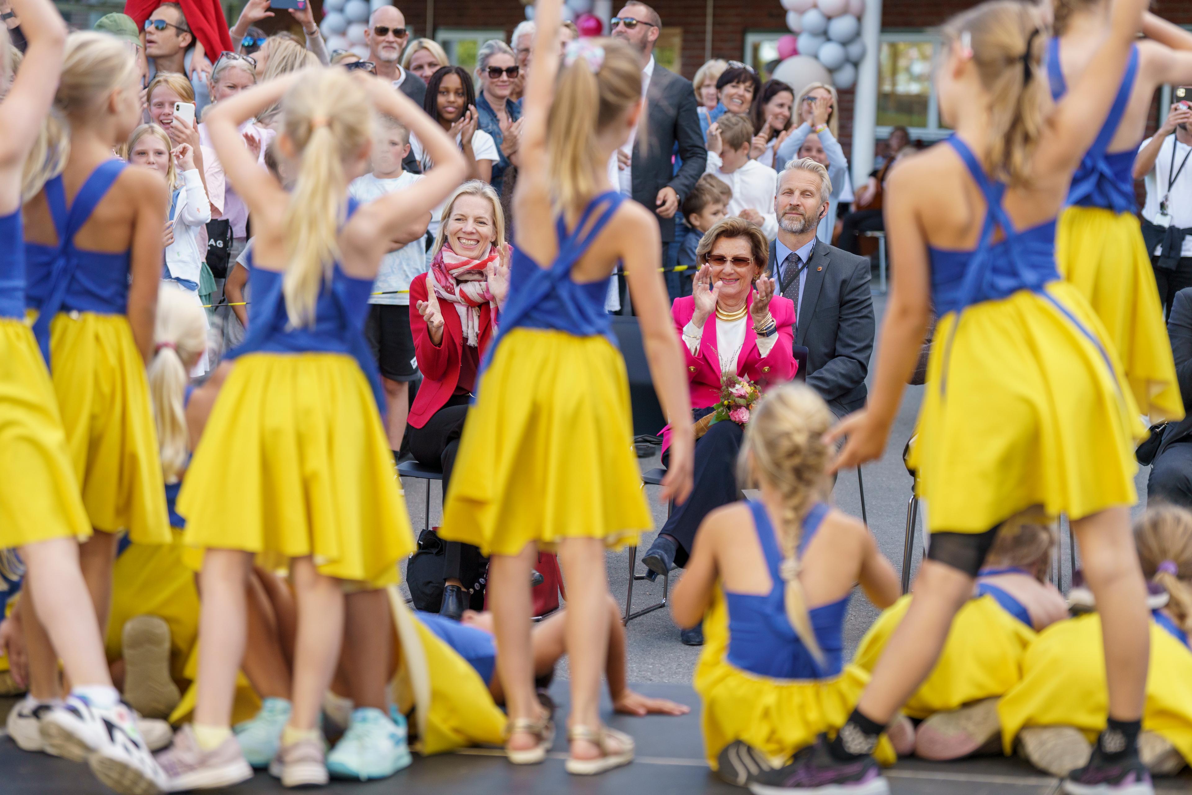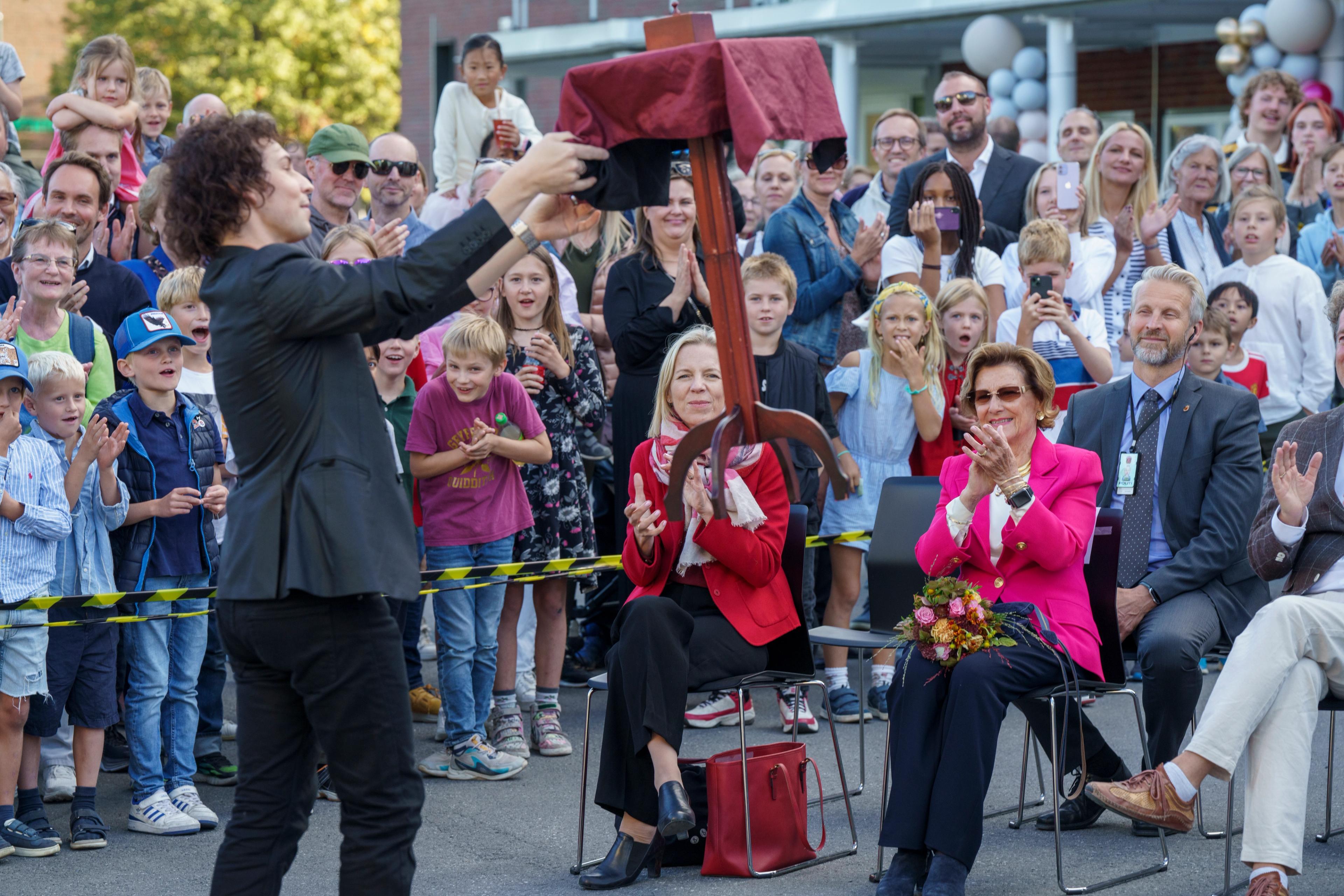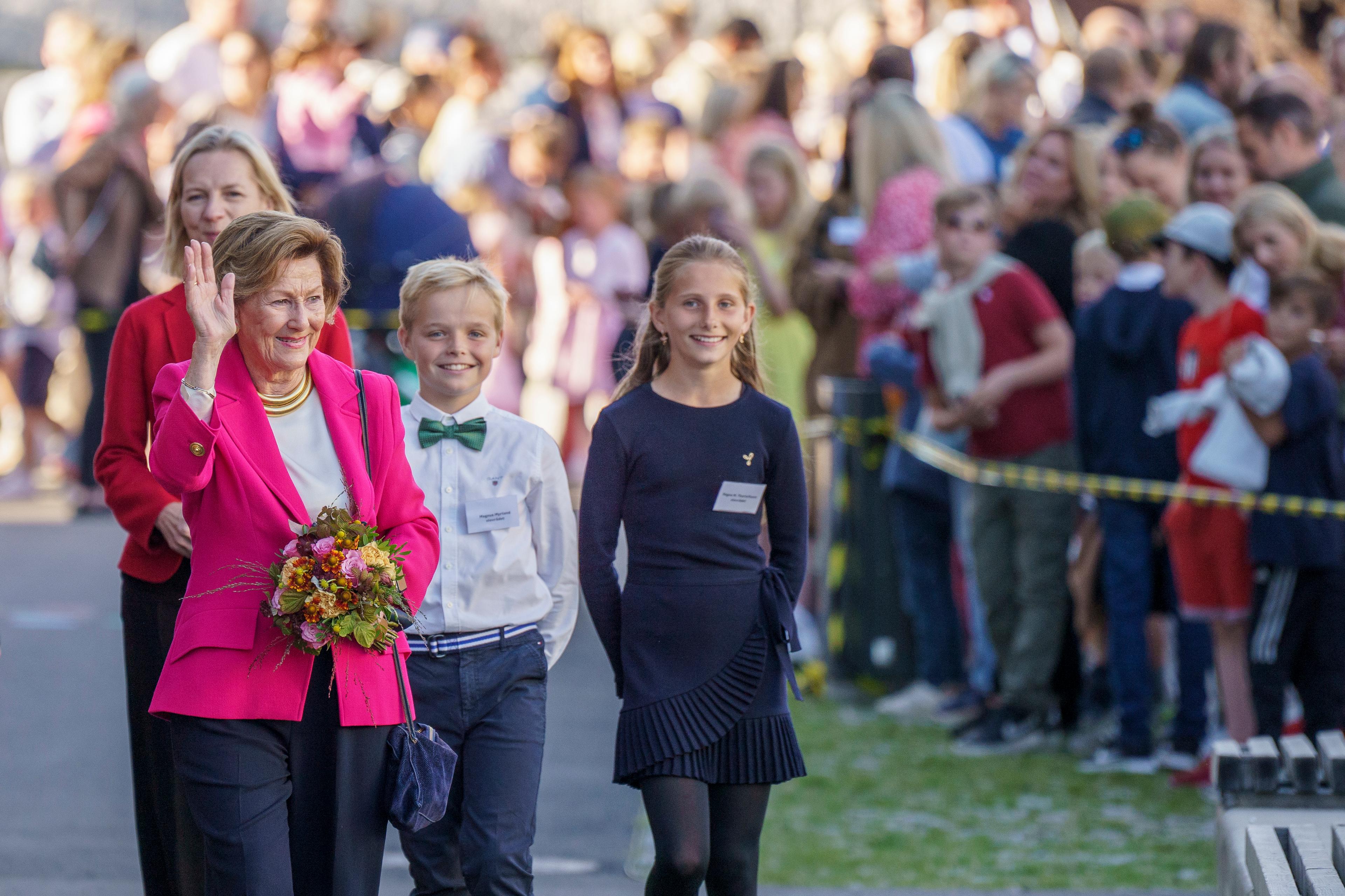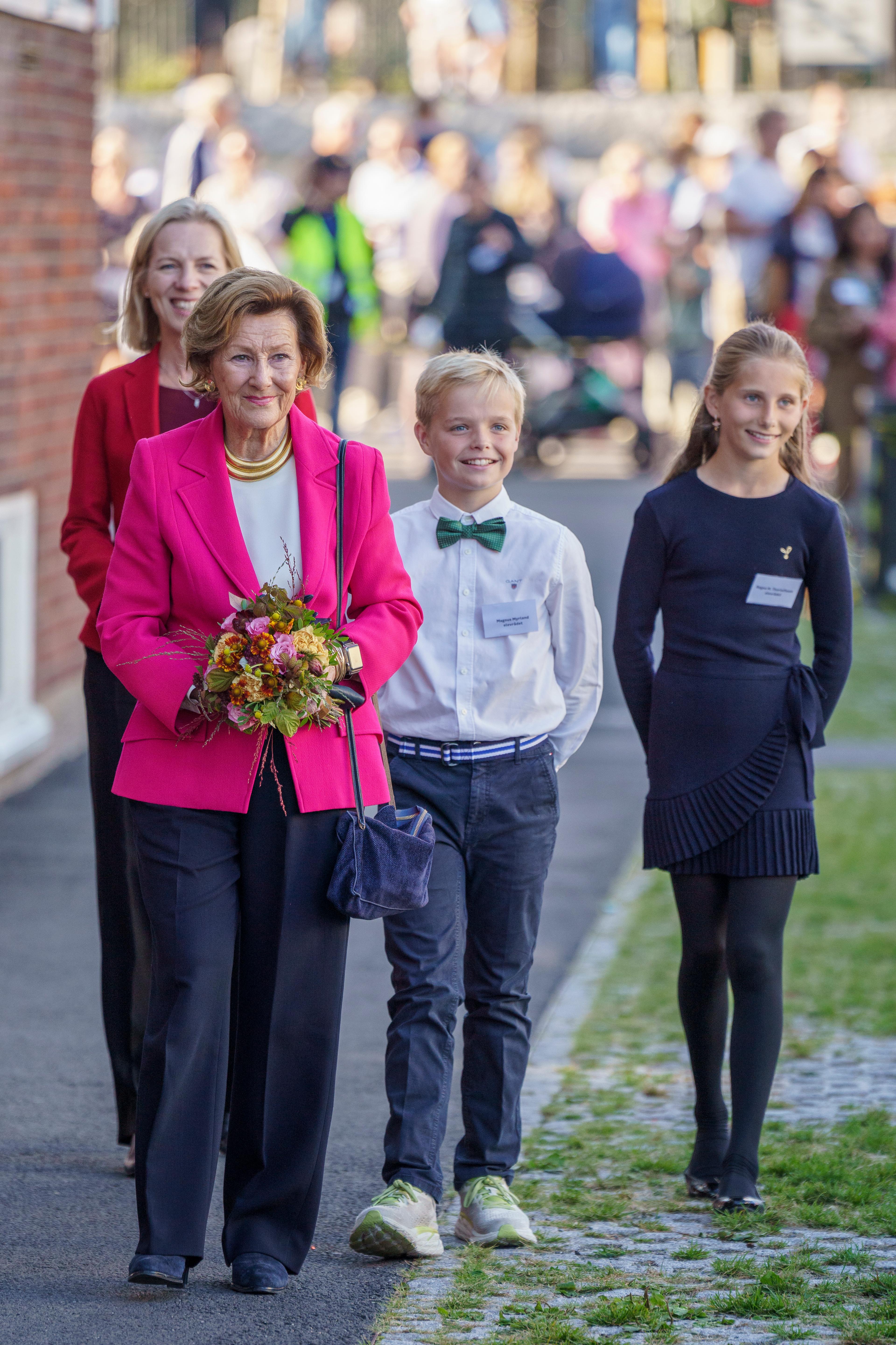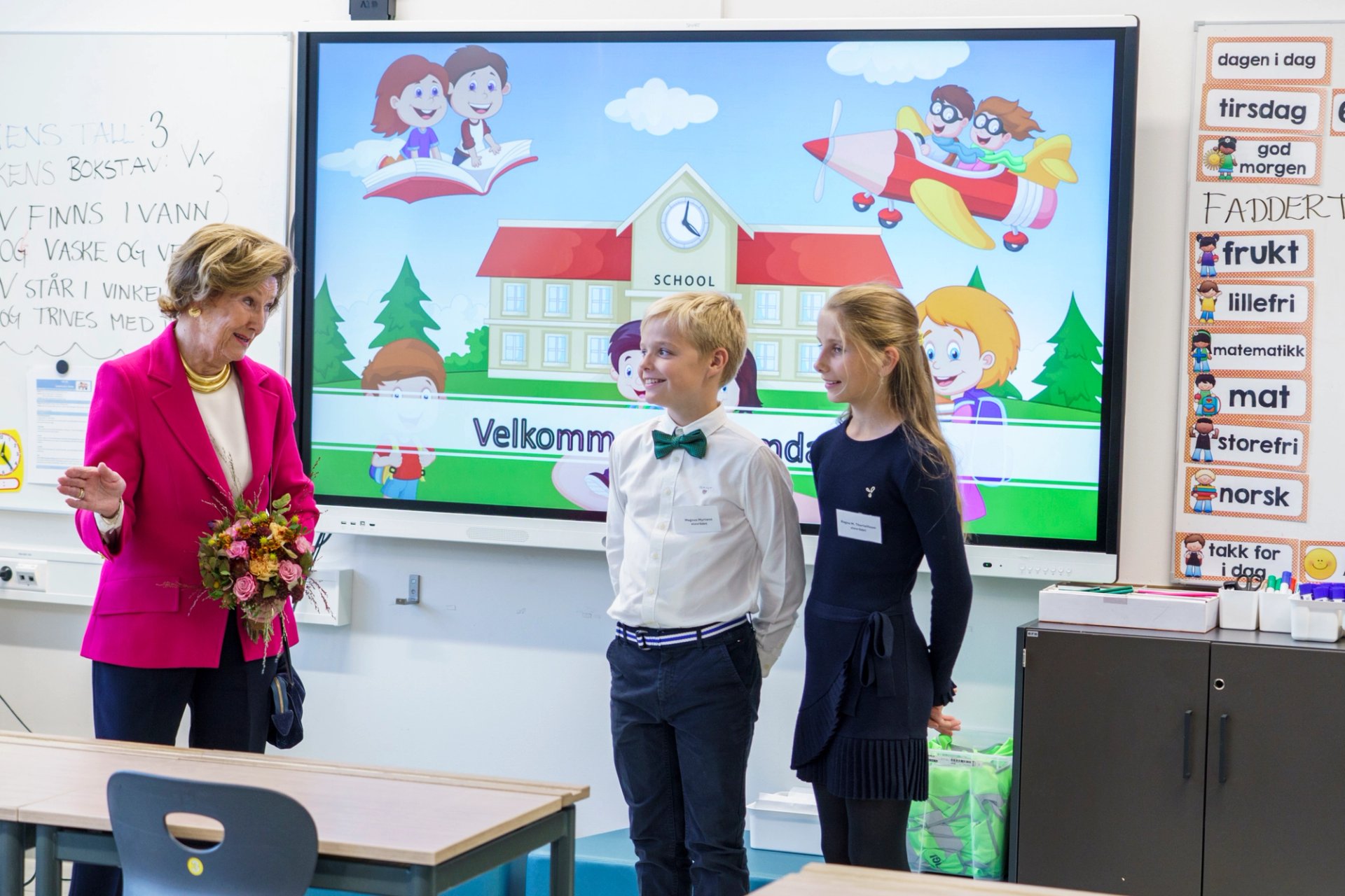 Hennes Majestet Dronningen var i ettermiddag til stede under markeringen av Slemdal skoles 100-årsjubileum i Oslo. Dronningen har selv vært elev ved barneskolen.