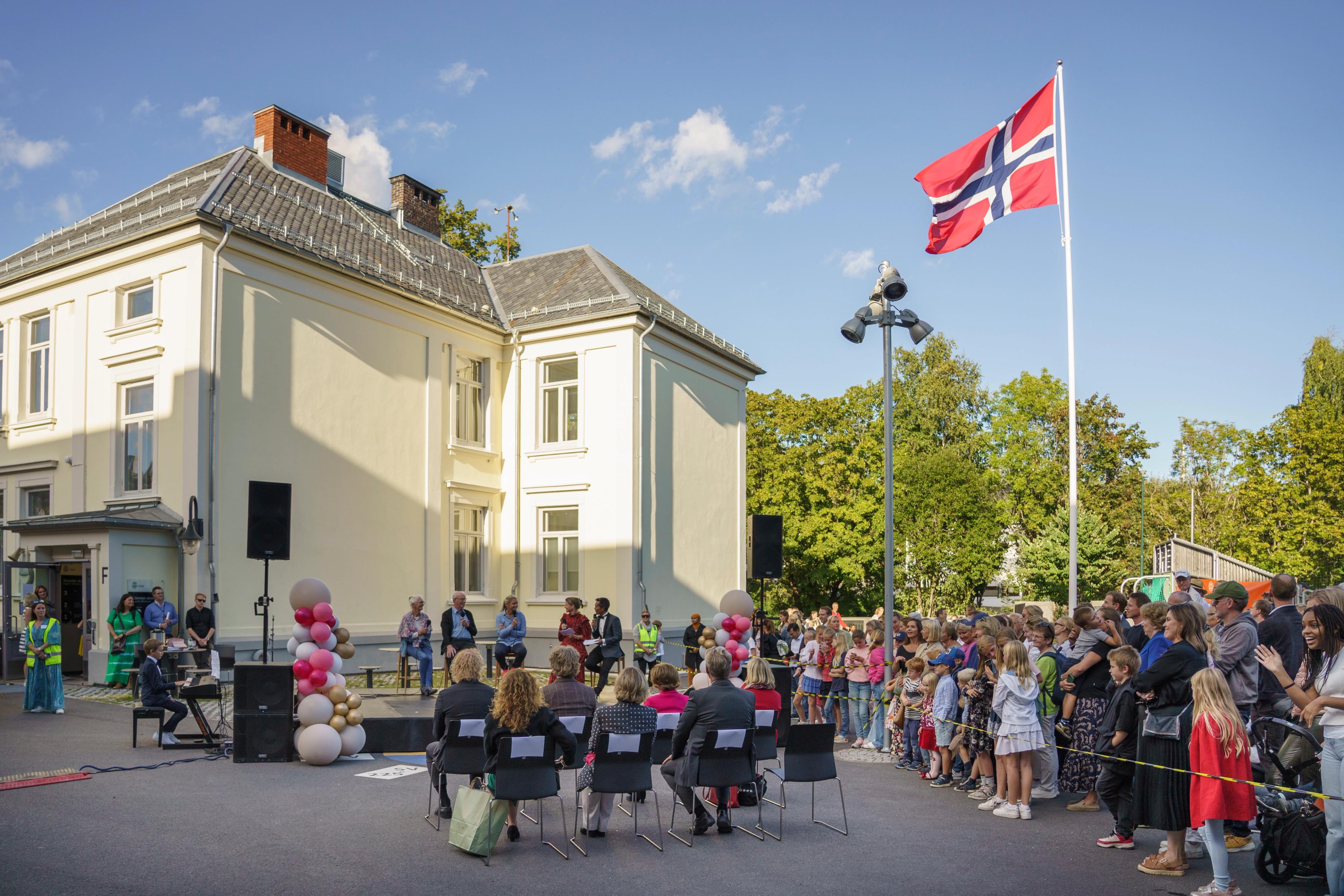 Skolegården på Slemdal var fylt opp av elever, lærere og foreldre som var samlet til stor feiring. Fra scenen i skolegården ønsket rektor Vegard Kjesbu velkommen til jubilumsmarkeringen.