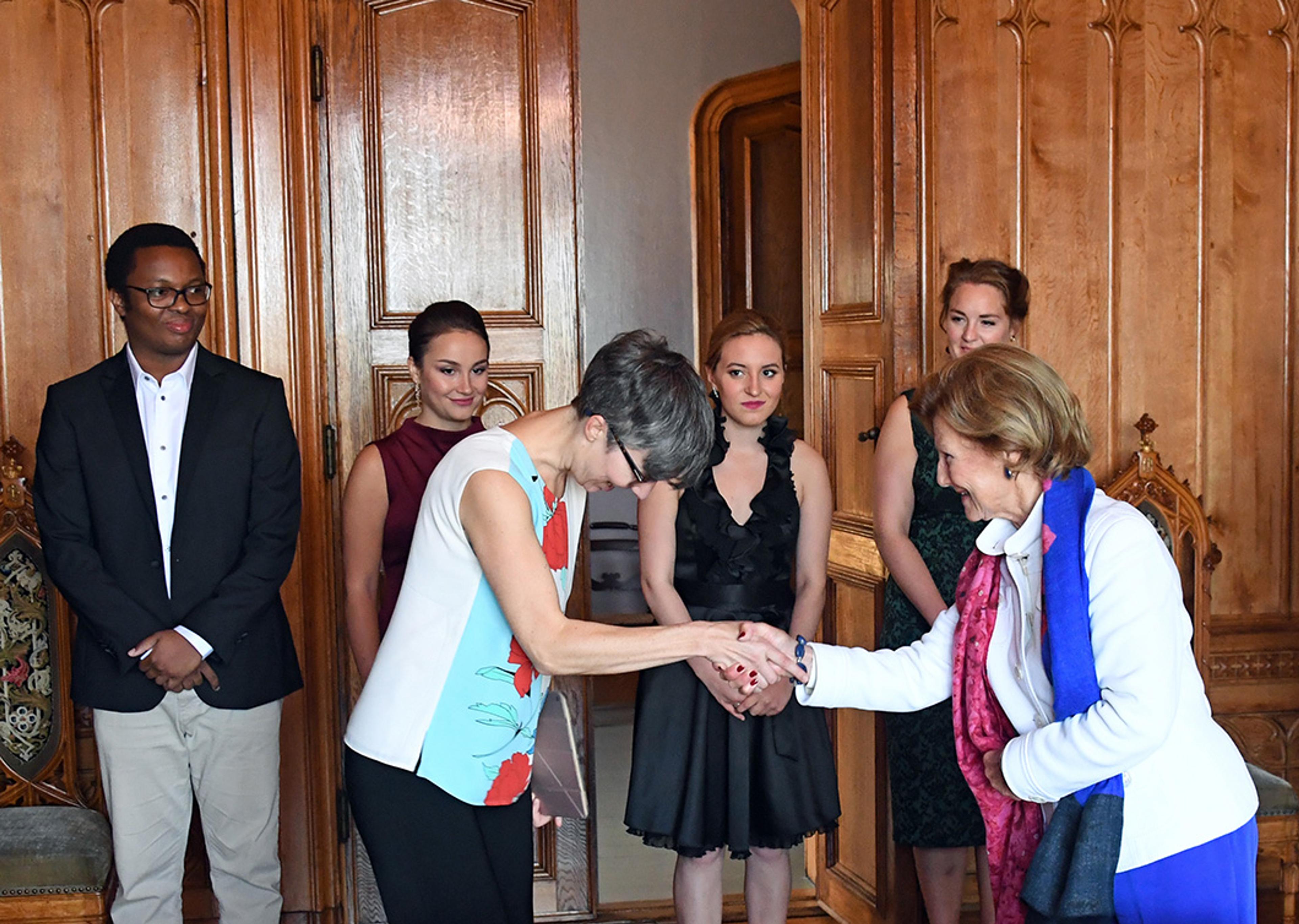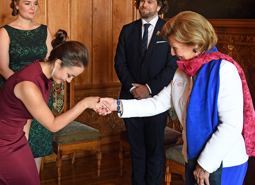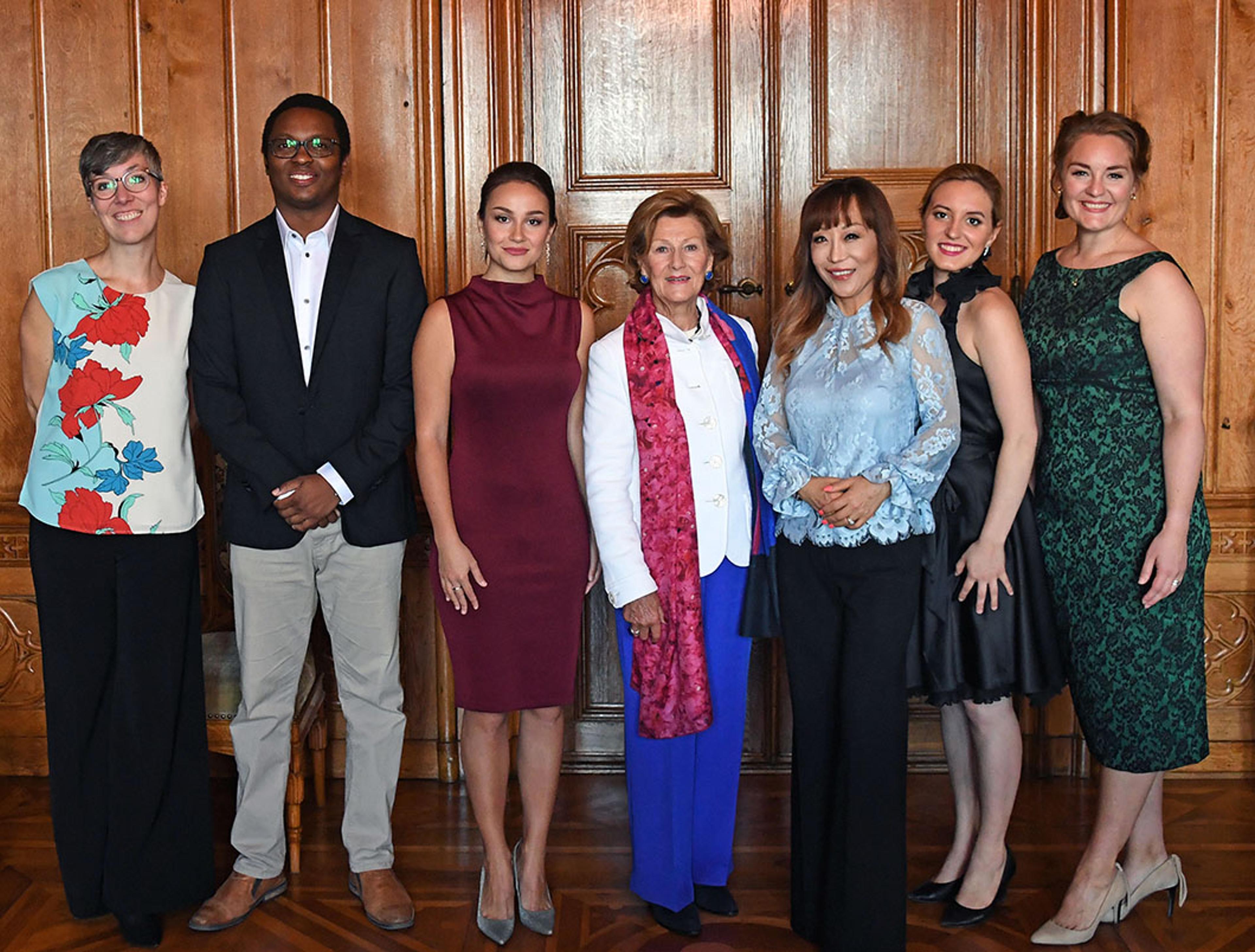 I forkant av meisterklassen møtte Dronninga Sumi Jo og dei fire semifinalistane som har delteke i årets musikkonkurranse.