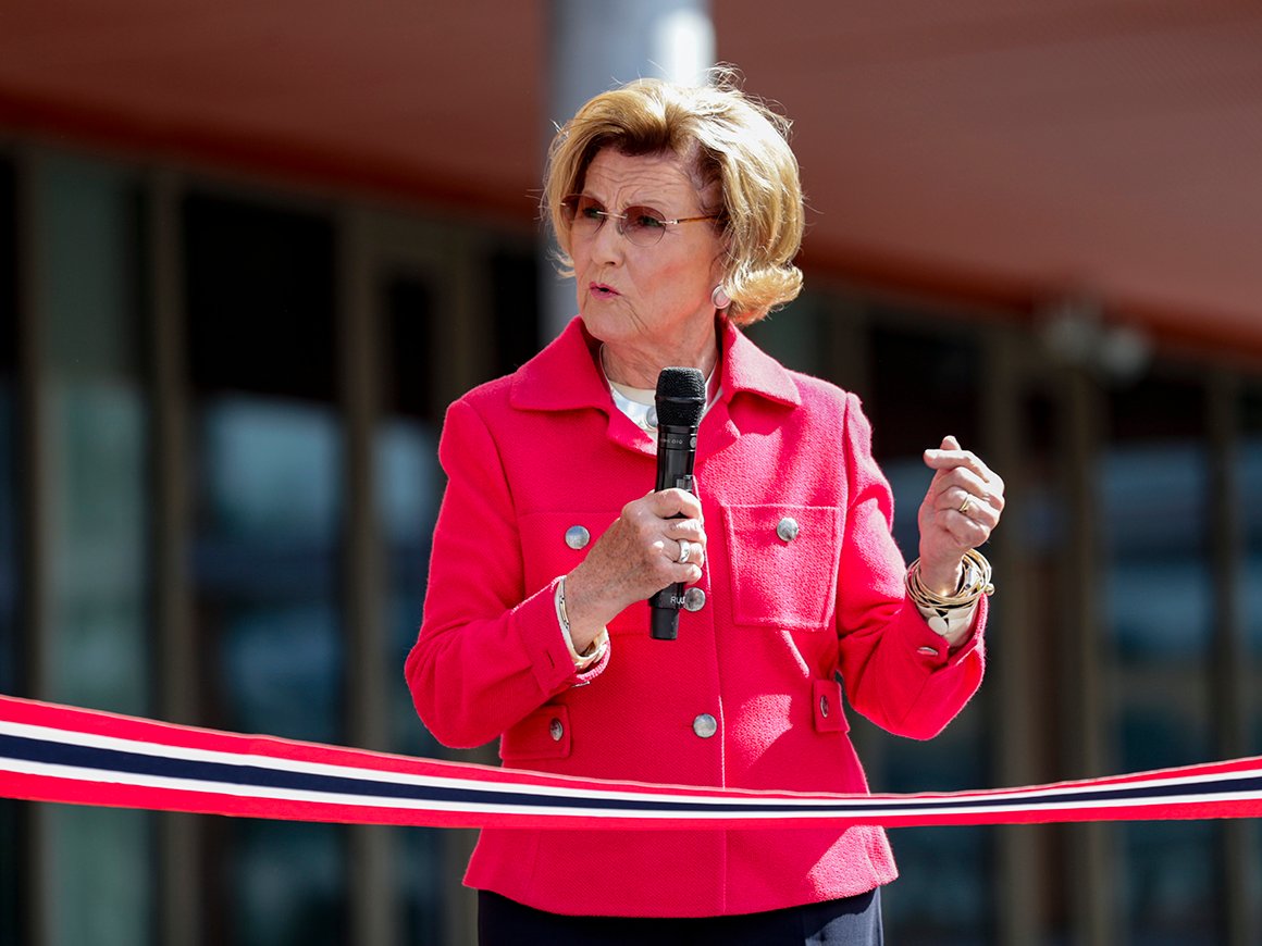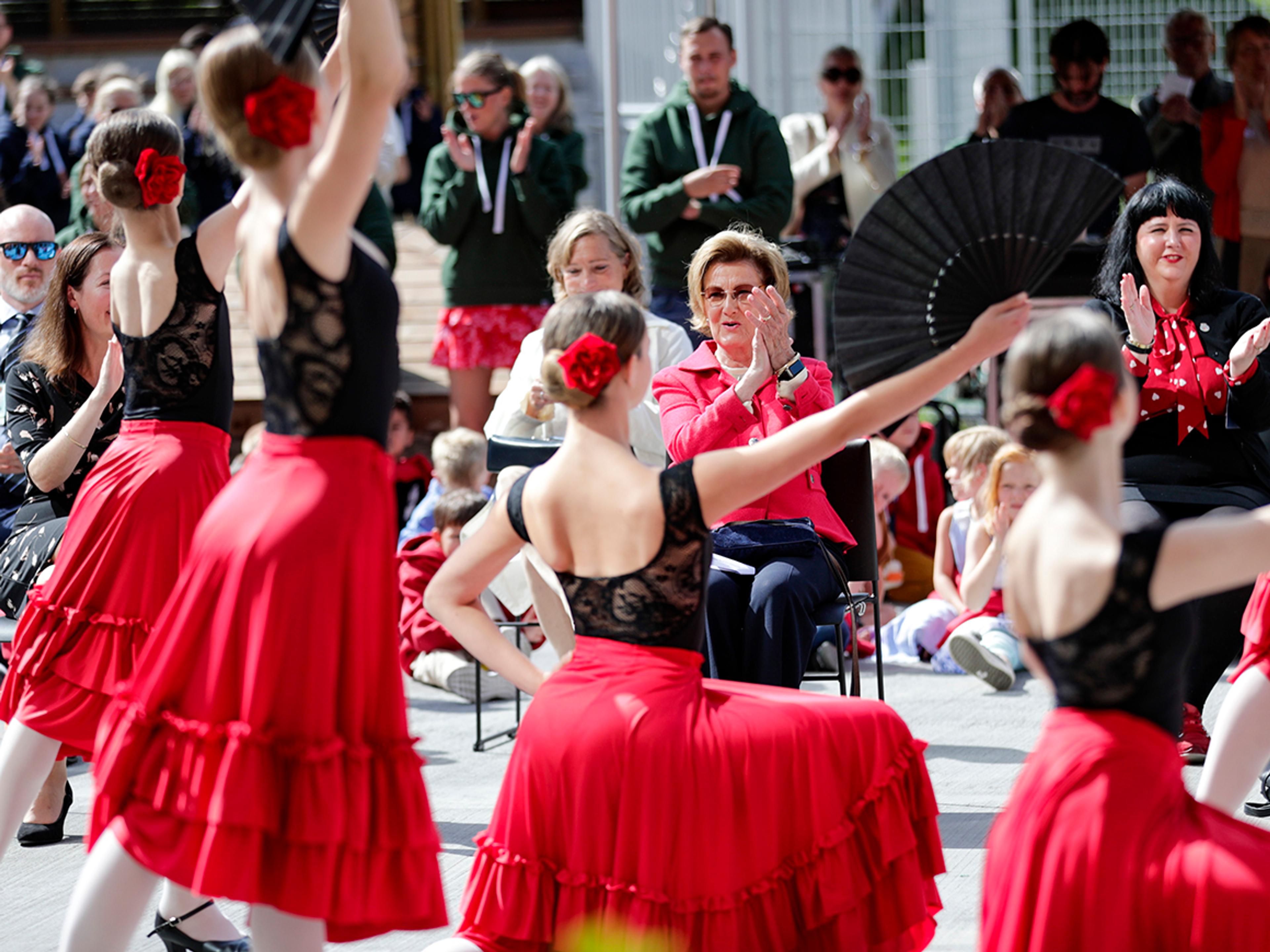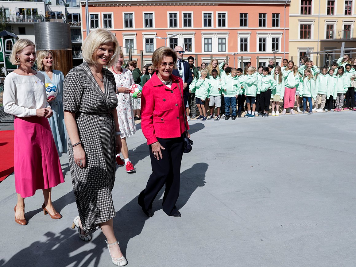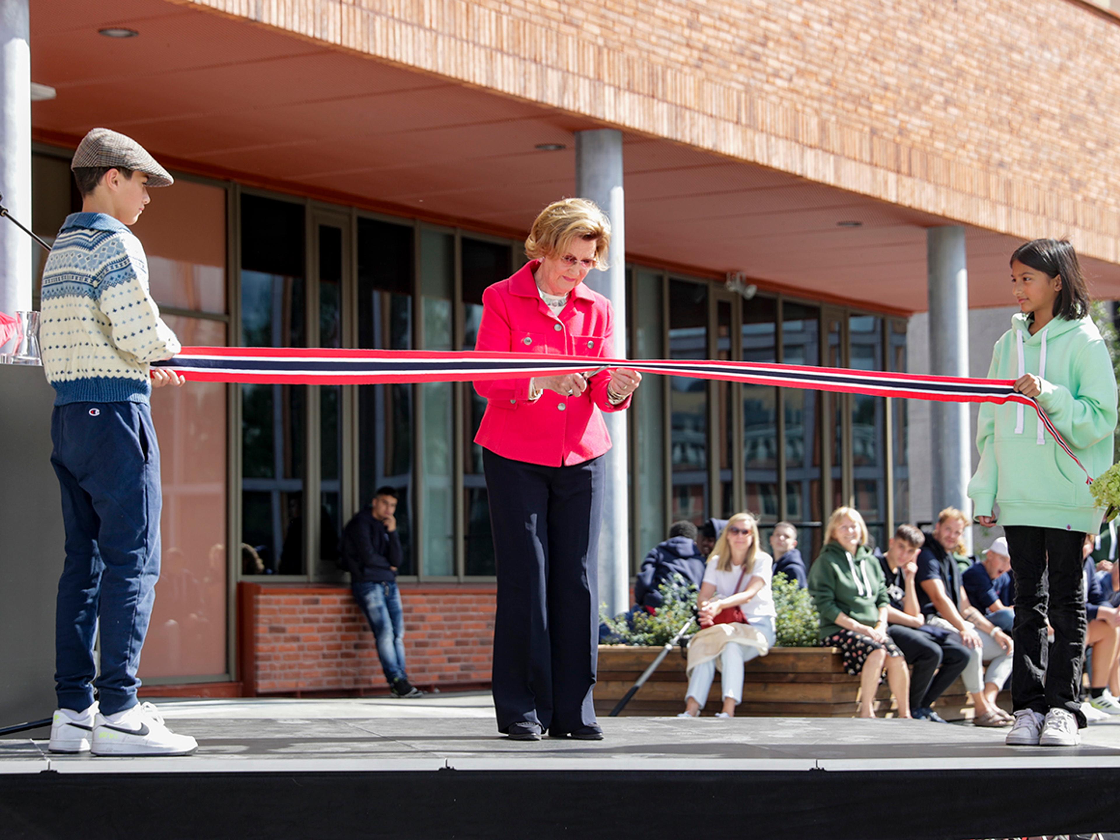 – Eg er heilt sikker på at de alle får godt utbytte av tilboda som finst i dette bygget, sa Hennar Majestet Dronning Sonja i ein spontan tale før ho klipte det offisielle bandet frå ein scene i skolegarden.