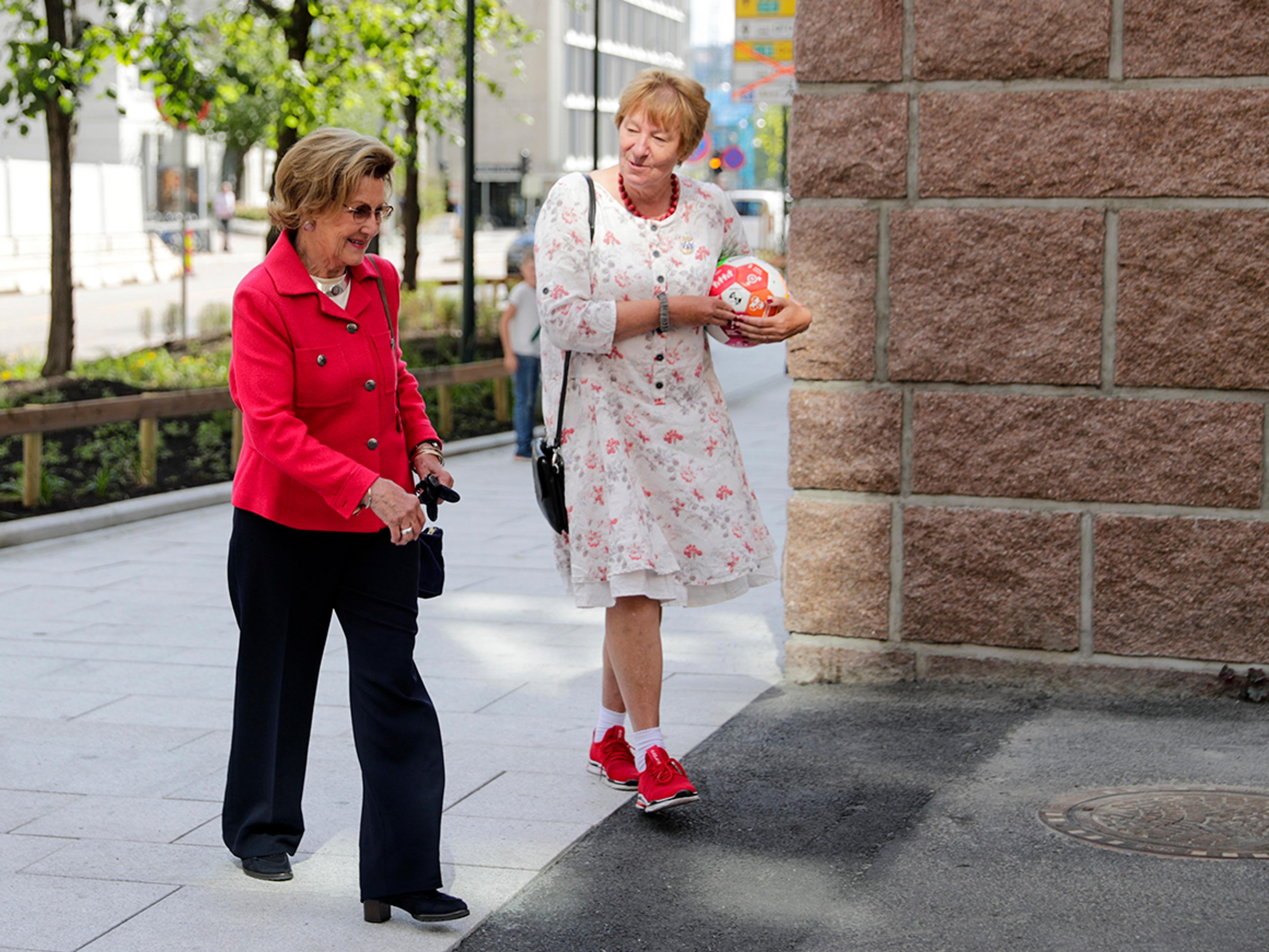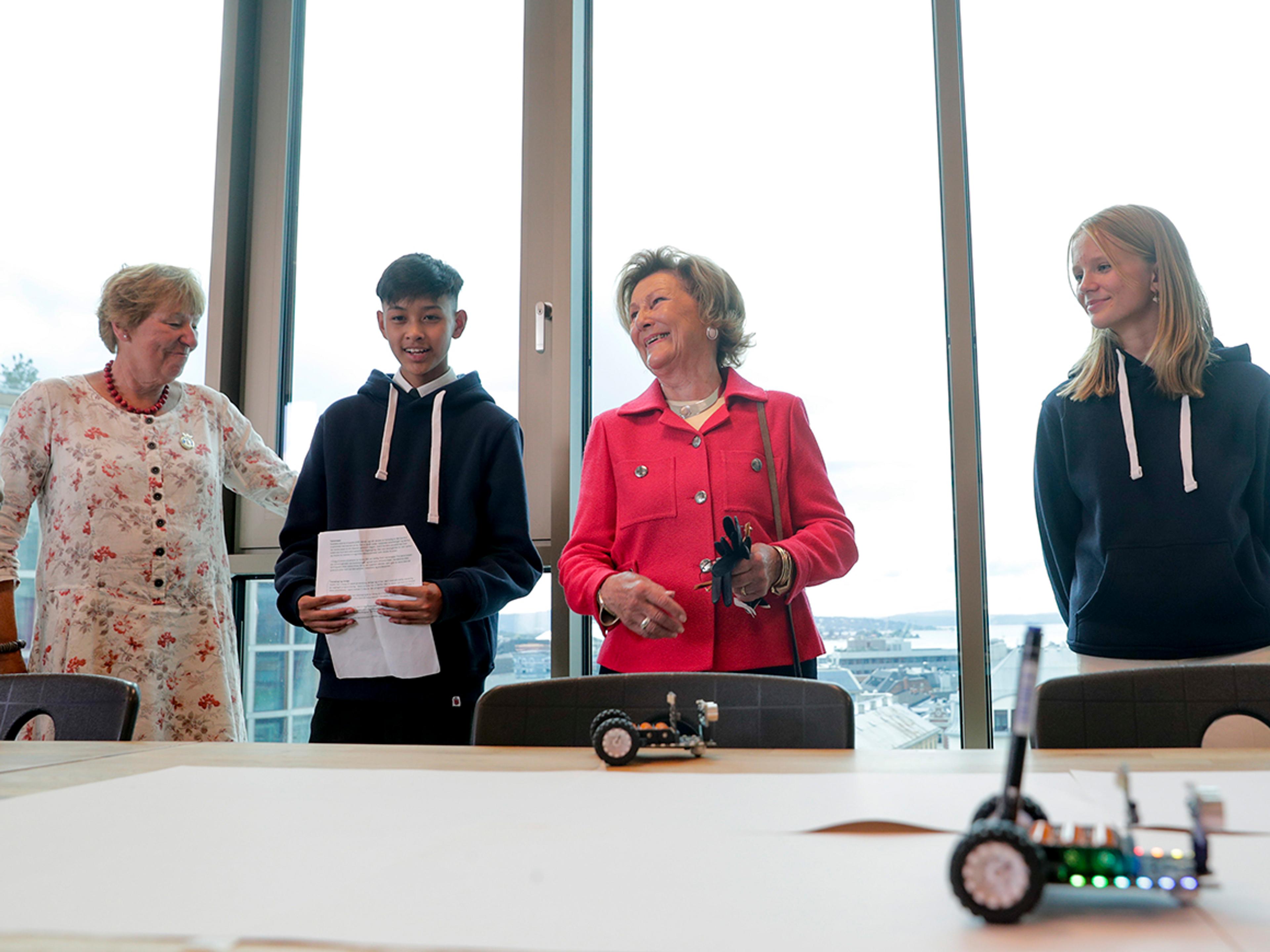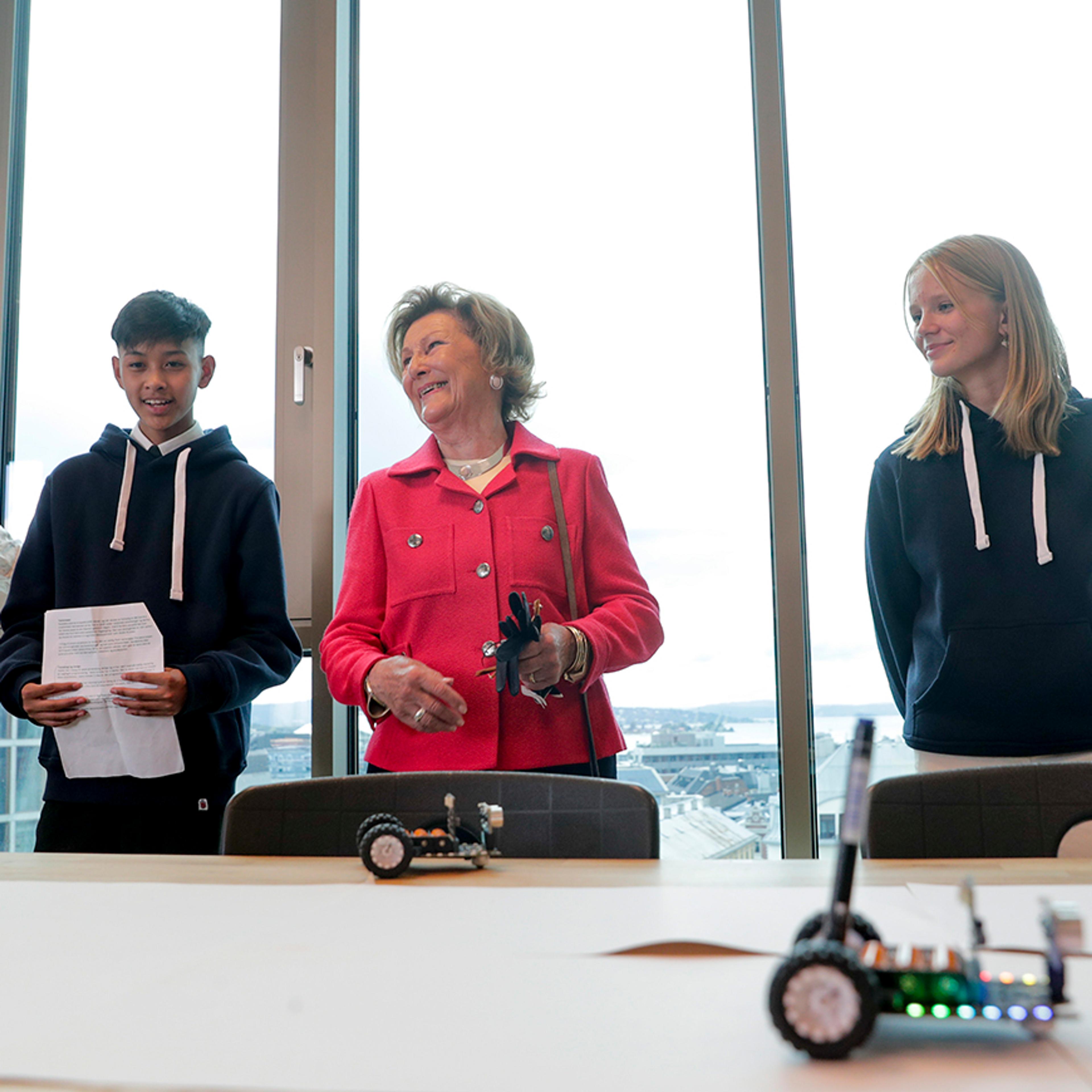 Dronning Sonja vart vist rundt på den nye skolen av tiandeklassingane Shawn Luke San Jose Baluyot og Christine Karin Wendel. Med i følgjet var rektor, ordførar og direktøren for utdanningsetaten. Elevar ved skolen har vore aktivt med i valet av alt frå kunst på veggene, leikeapparat og utforming.