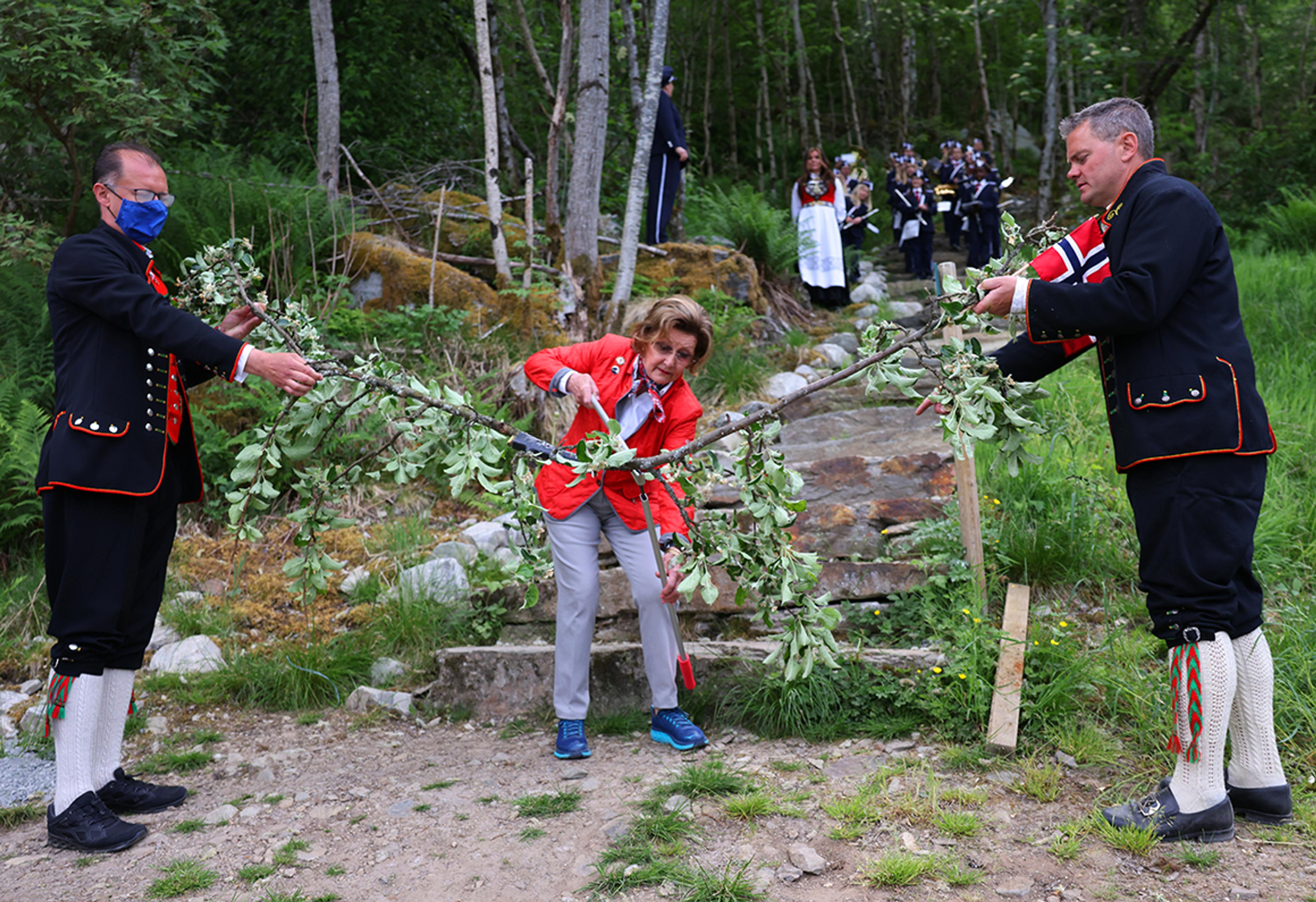 Dronninga klipte over ei lang grein frå eit epletre for å markere opninga av Kråkestien og grindabygget på Stuaset. Ordførar Roald Aga Haug og Harald Alvavoll frå Munketreppenes vener talte under opninga.