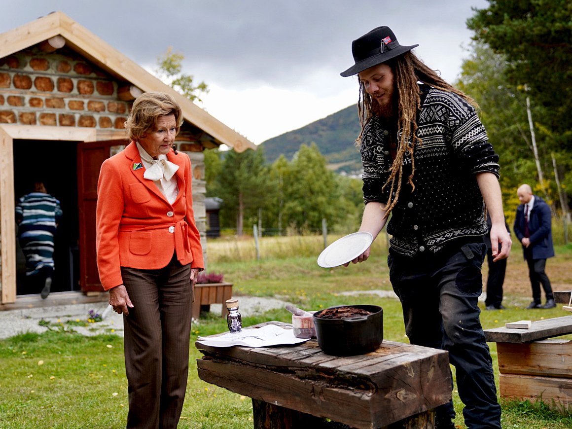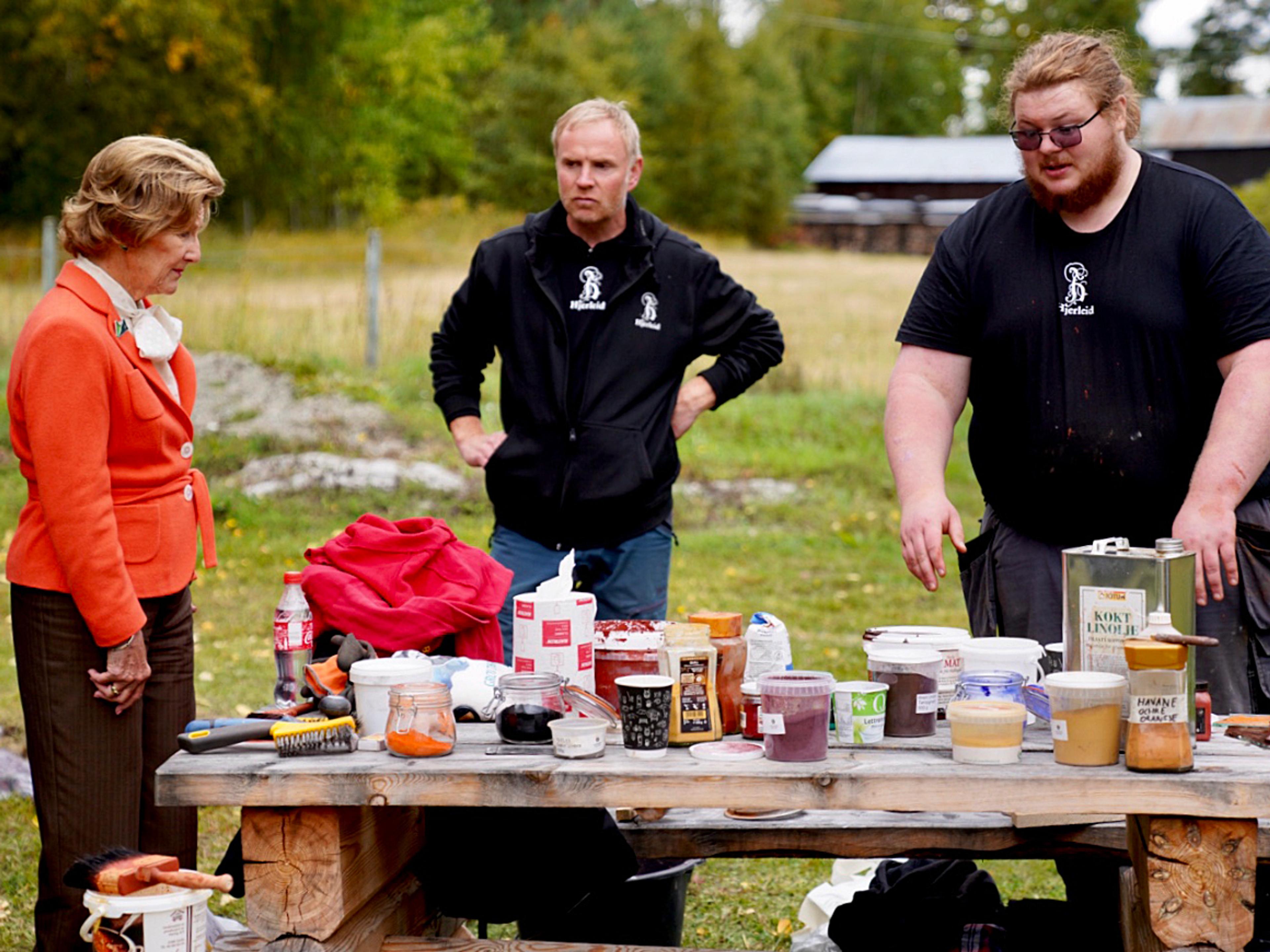 Ved Hjerleid handverksskole blir tradisjonshandverket halde høgt i hevd. I dag besøkte Hennar Majestet Dronninga smedar, treskjerarar og laftarar på Dovre.