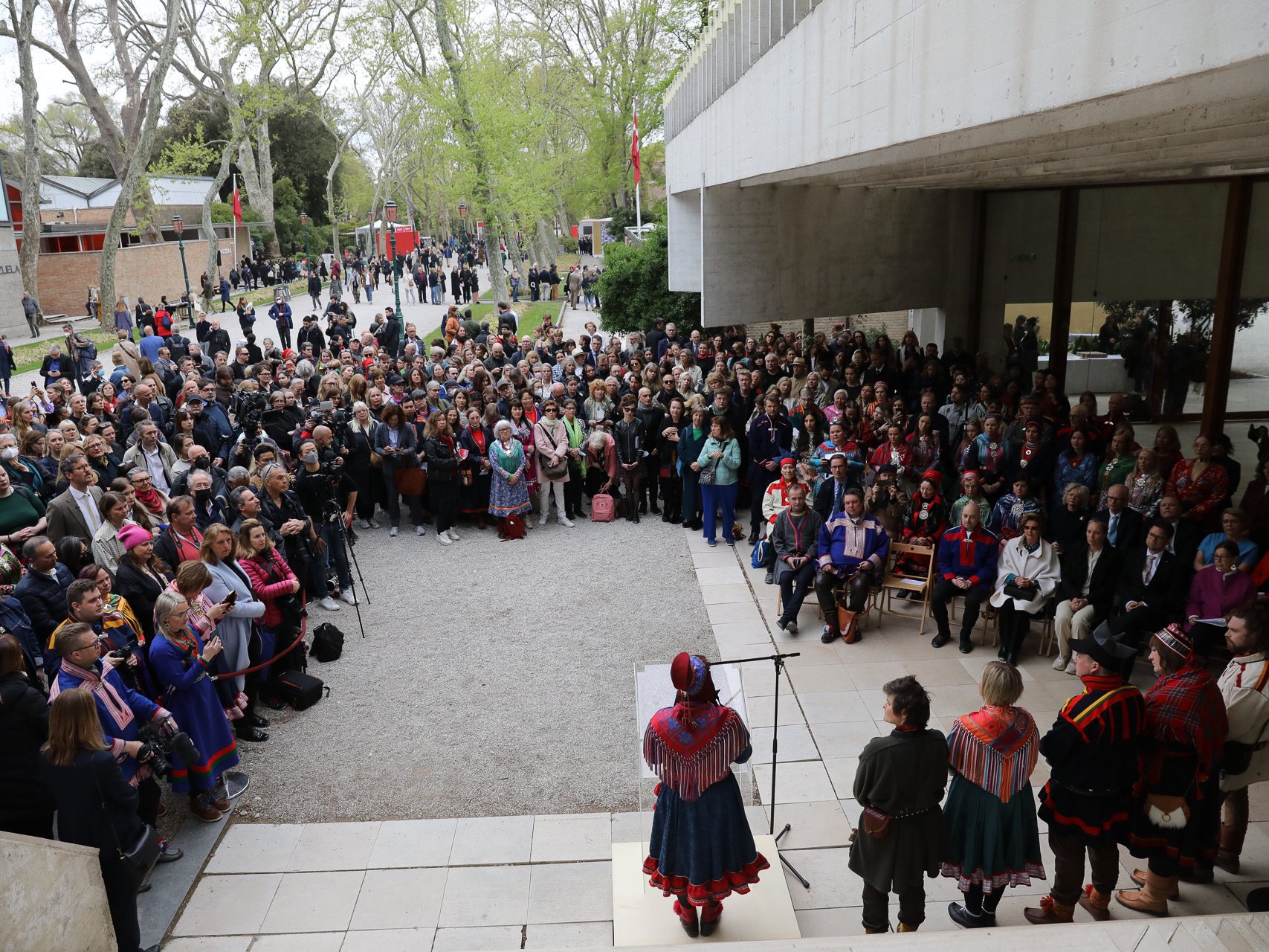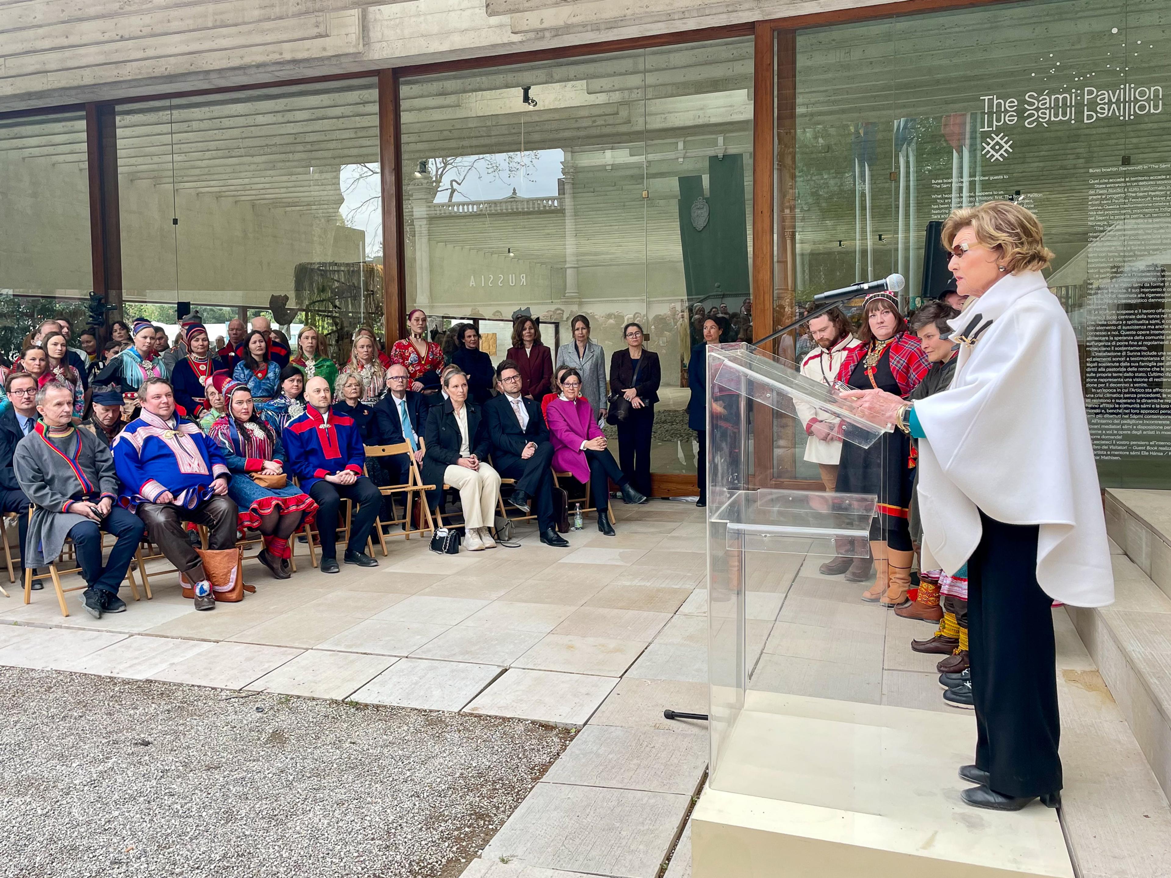 Hennes Majestet Dronningen åpnet torsdag den nordisk-samiske kunstutstillingen i den nordiske paviljongen ved den store markeringen av moderne kunst i Italia – Veneziabiennalen.