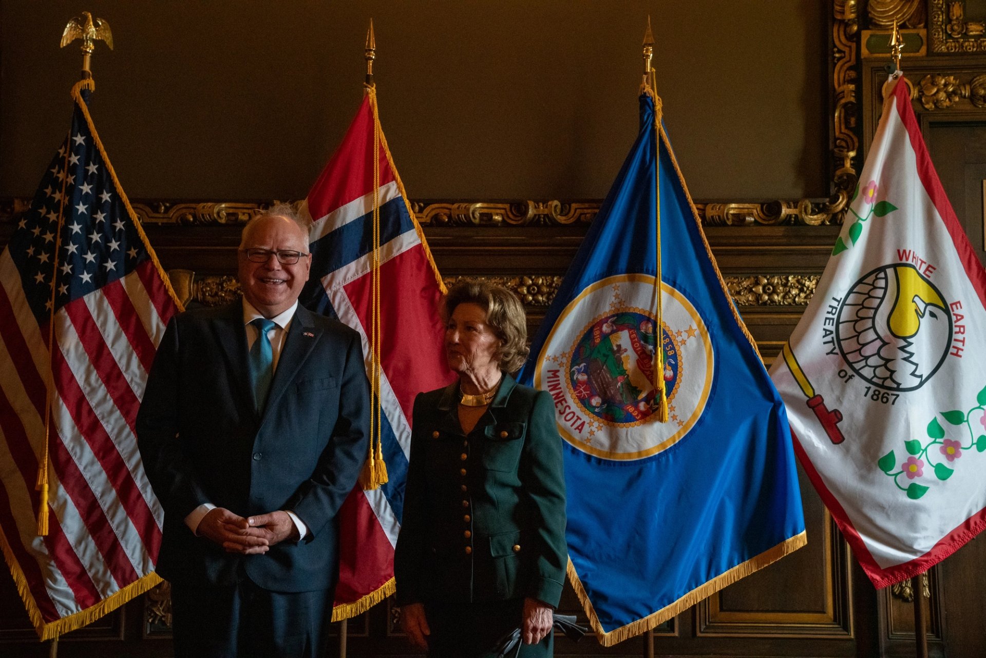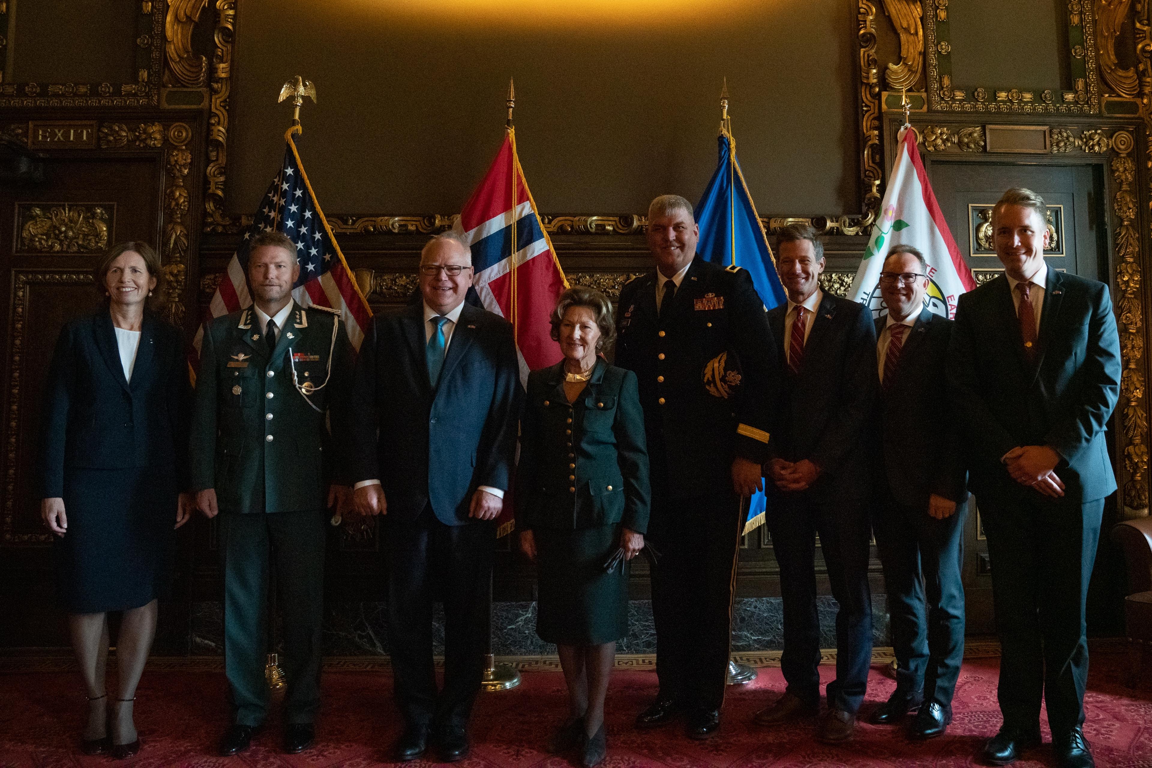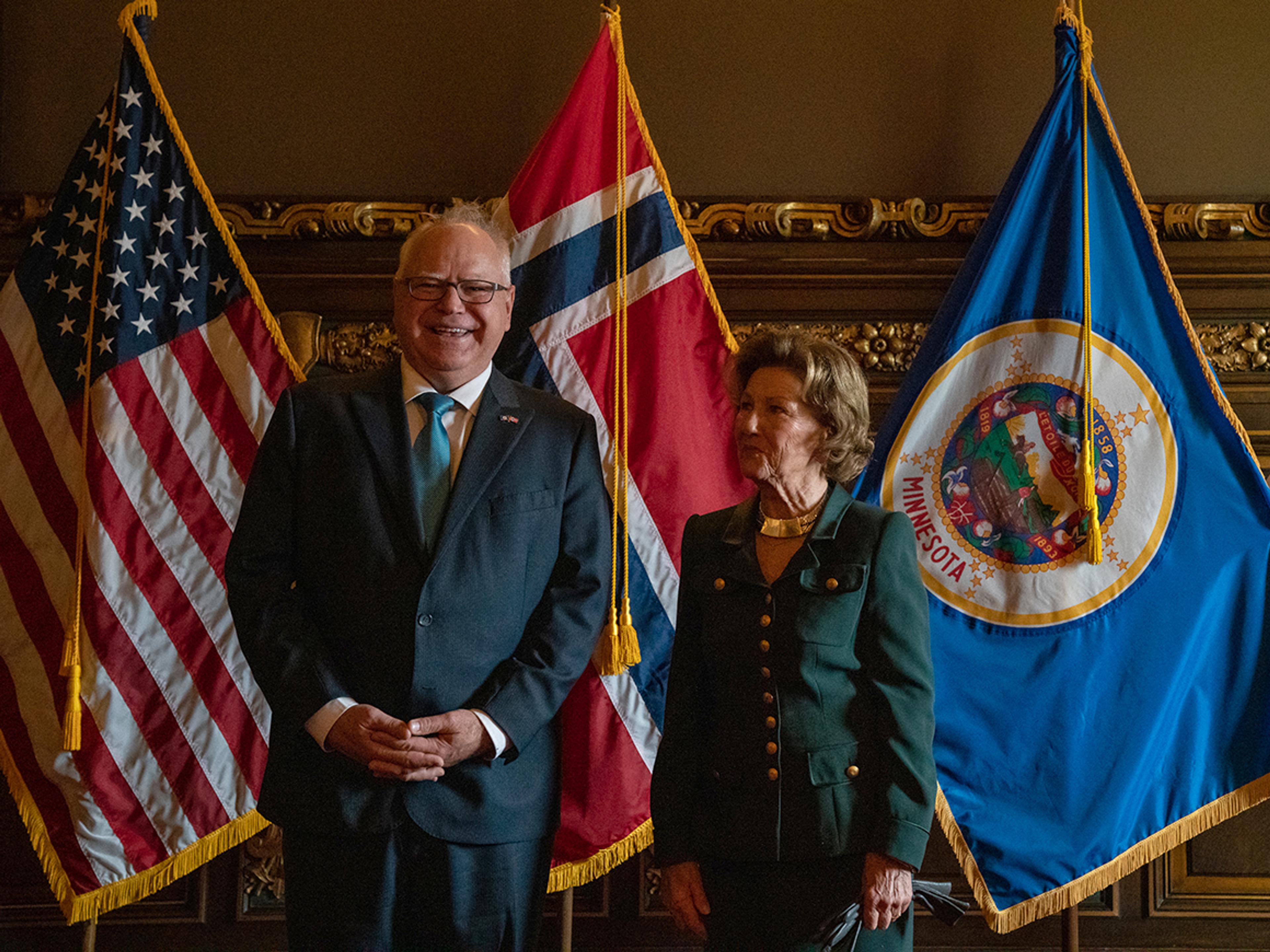 Hennes Majestet innledet det offisielle besøket torsdag da hun ble tatt imot av Minnesotas guvernør Tim Walz i State Capitol. Walz er Minnesotas 41. guvernør og representerer det demokratiske partiet.