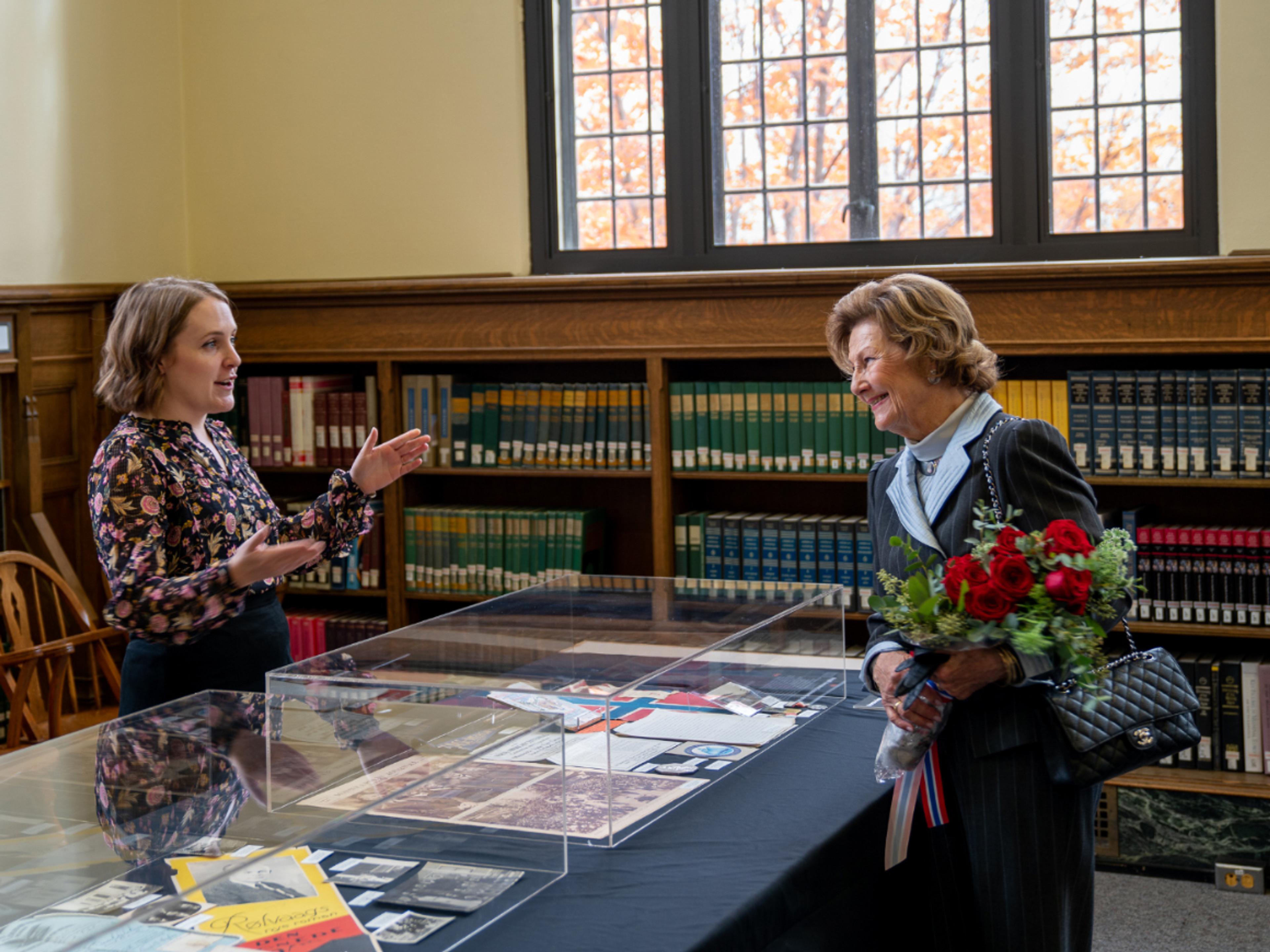 President David Anderson ga Dronningen en omvisning i arkivet og en liten utstilling av dokumenter relatert til etableringen av samlingen i 1925. Dronning Sonja fikk også høre om noe av arbeidet som gjøres i forbindelse med den planlagte feiringen av tohundreårsjubileet for innvandringen i 2025.
