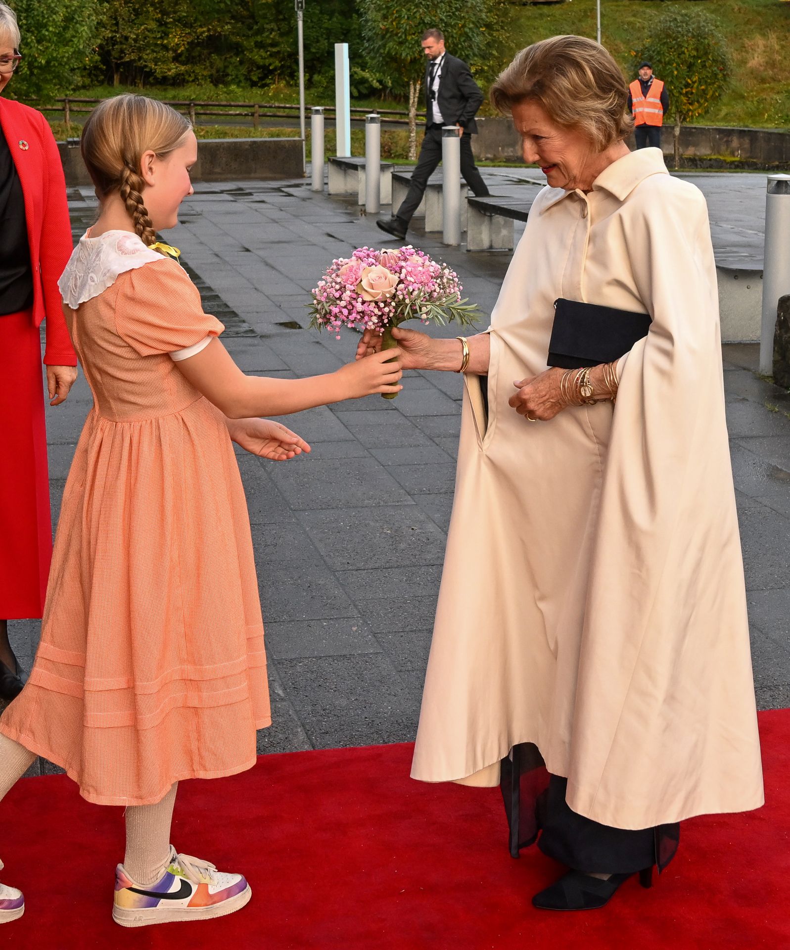 Ved ankomsten til operahuset ble Dronningen ønsket velkommen av musikalens yngste deltager – ti år gamle Agnes Kayser-Husbyn. Hun ga Dronningen blomster, før jenta måtte skynde seg bak scenen for å gjøre seg klar til rollen som unge Sol Emilie. Styreleder Randi Nyhammer-Taklo og operasjef Kari Standal Pavelich ledsaget Dronningen inn i salen.
