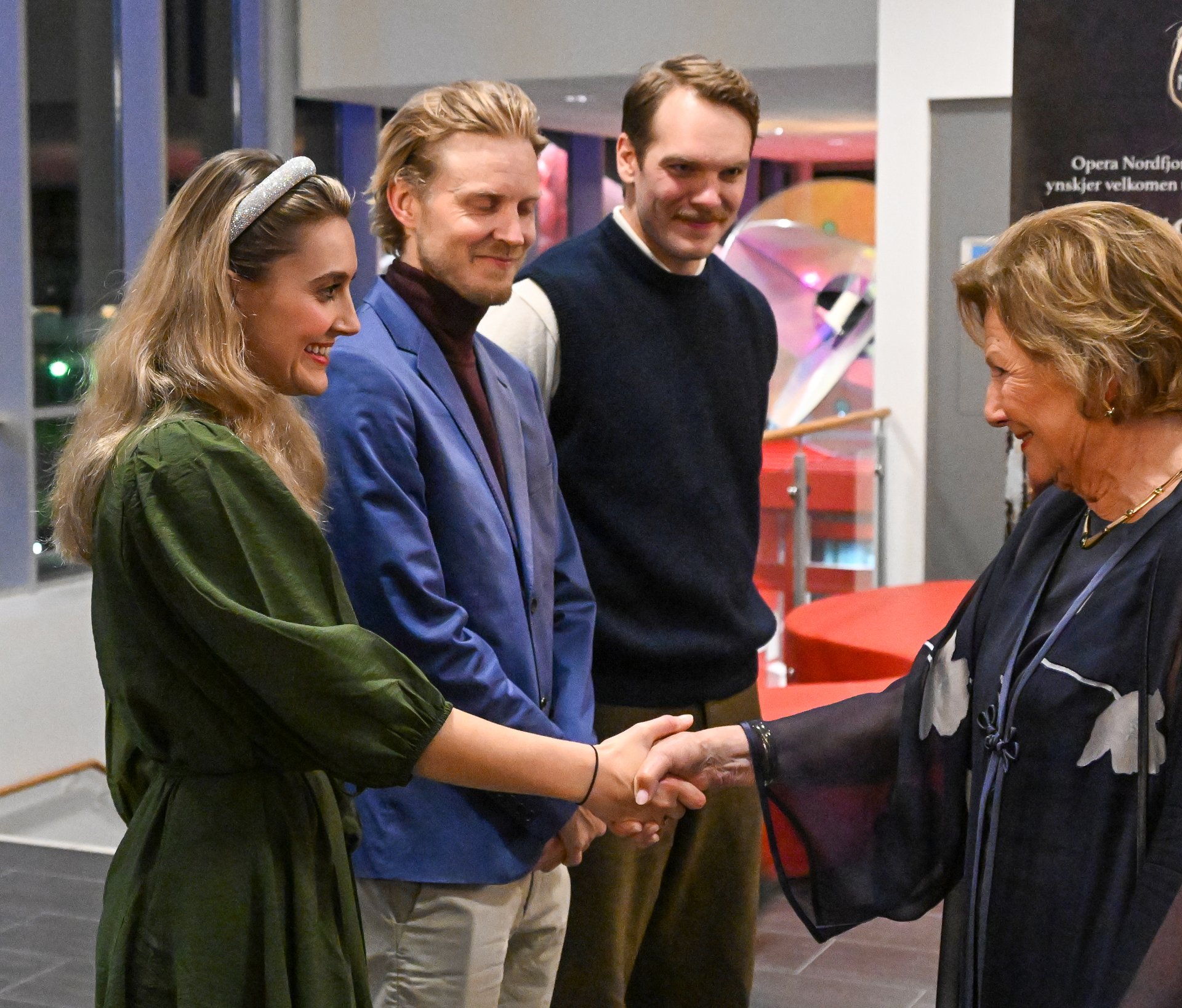 Etter forestillingen hilste Dronningen på flere av skuespillerne og andre som hadde bidratt til oppsetningen av musikalen.