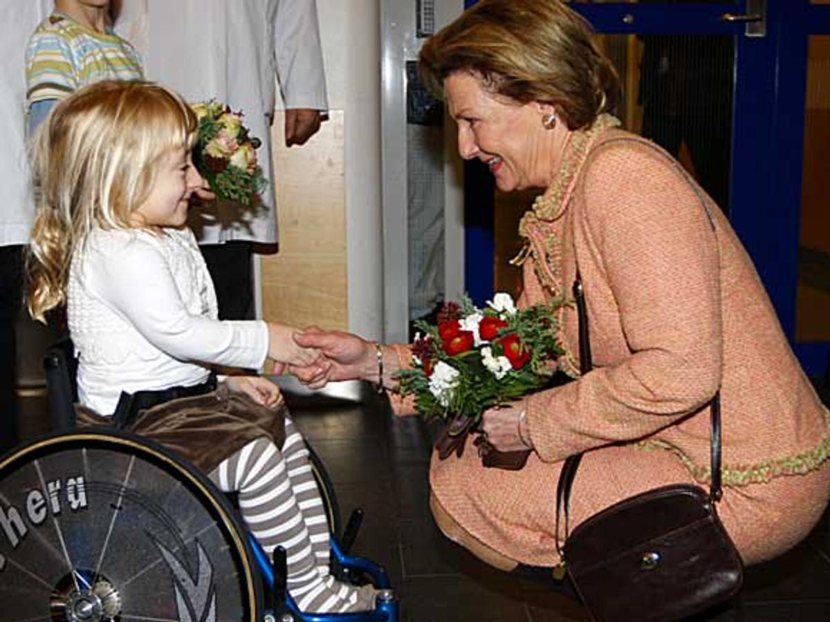 Dronning Sonja ble tatt i mot av sykehusdirektør Tove Strand og ledelsen ved Barneklinikken. Første del av besøket gikk til skolerommet, hvor Dronningen hilste på barn som hadde undervisning der.
