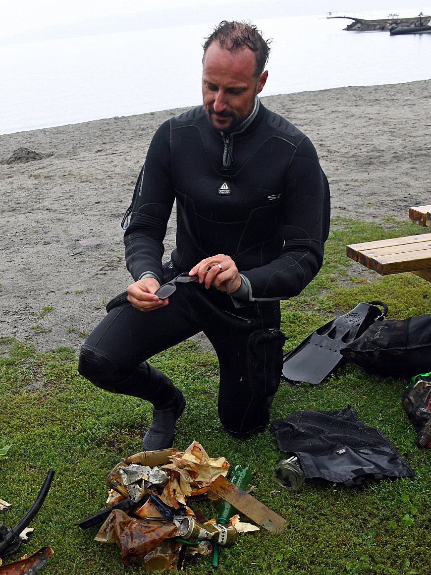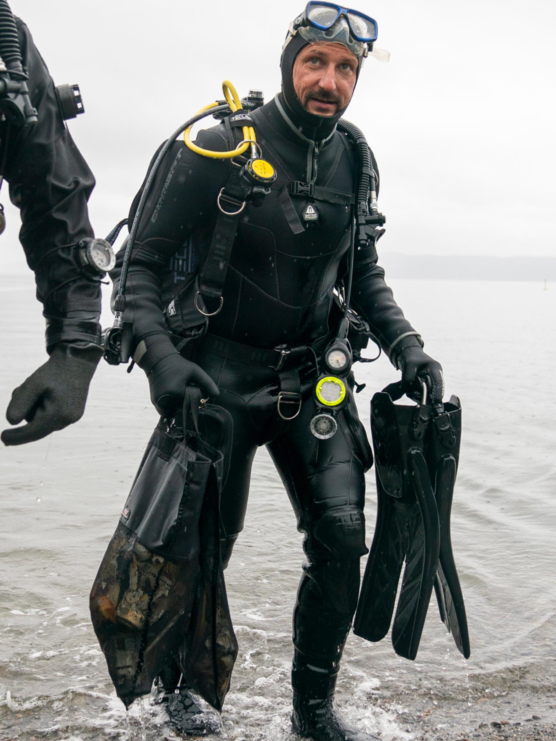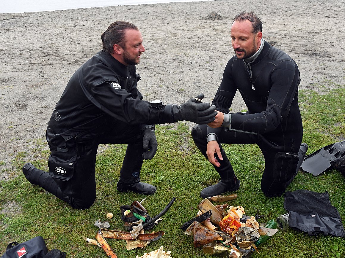 I øsende regn tok Kronprinsen og resten av dykkerteamet på seg dykkerutstyr og gikk ut i vannet. Her gjennomførte de et dykk som varte i 38 minutter, og når de kom opp igjen hadde de med seg to store poser med plastsøppel de hadde plukket med seg. De to fant både solbriller, ishockeypuck og golfballer på bunnen - i tillegg til rester av poser, plastflasker og liknende.