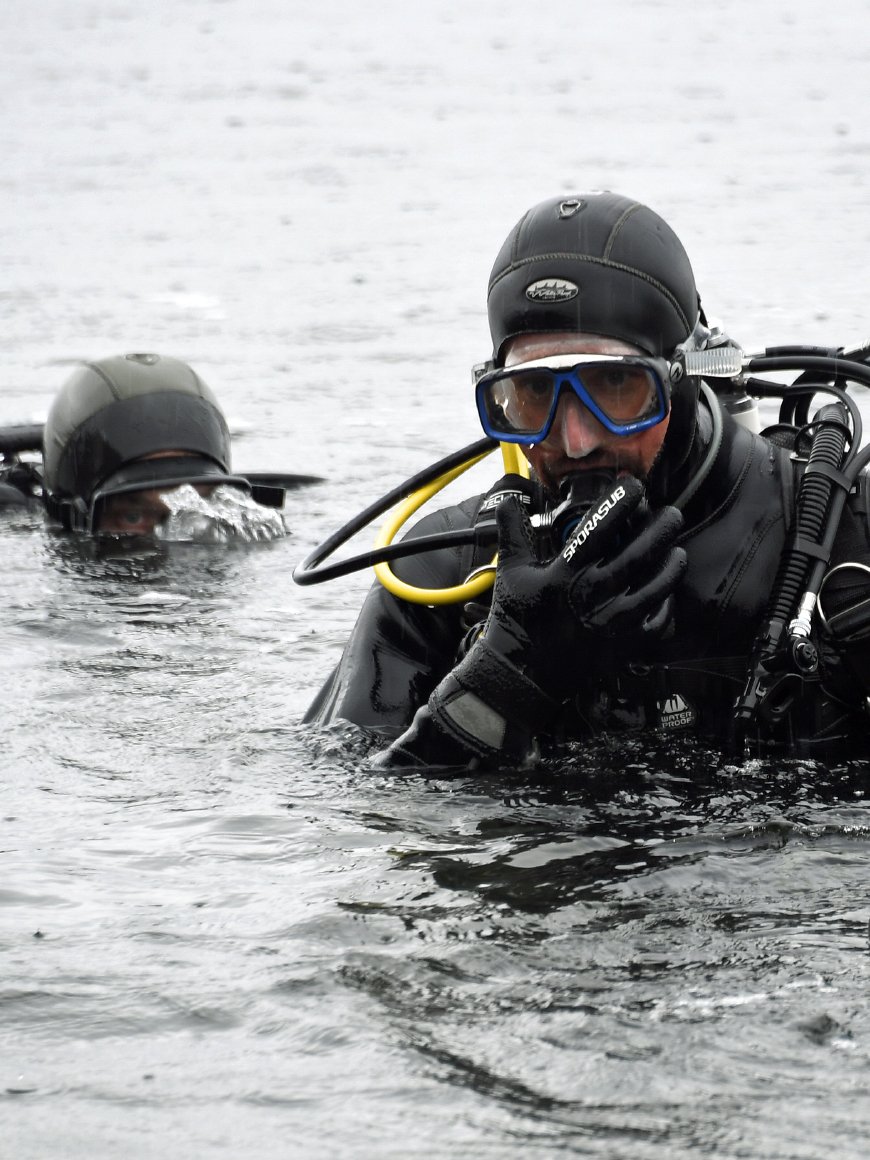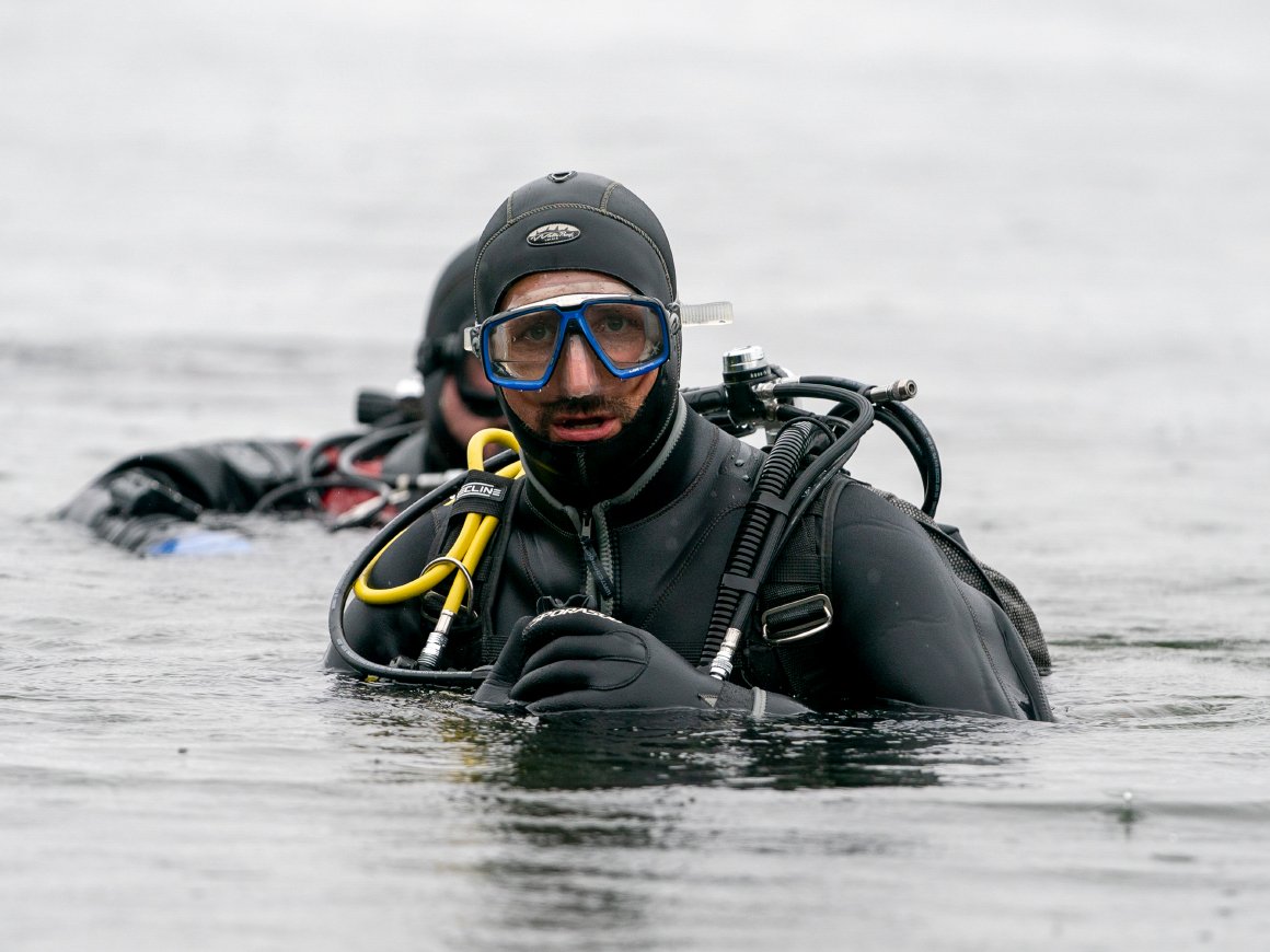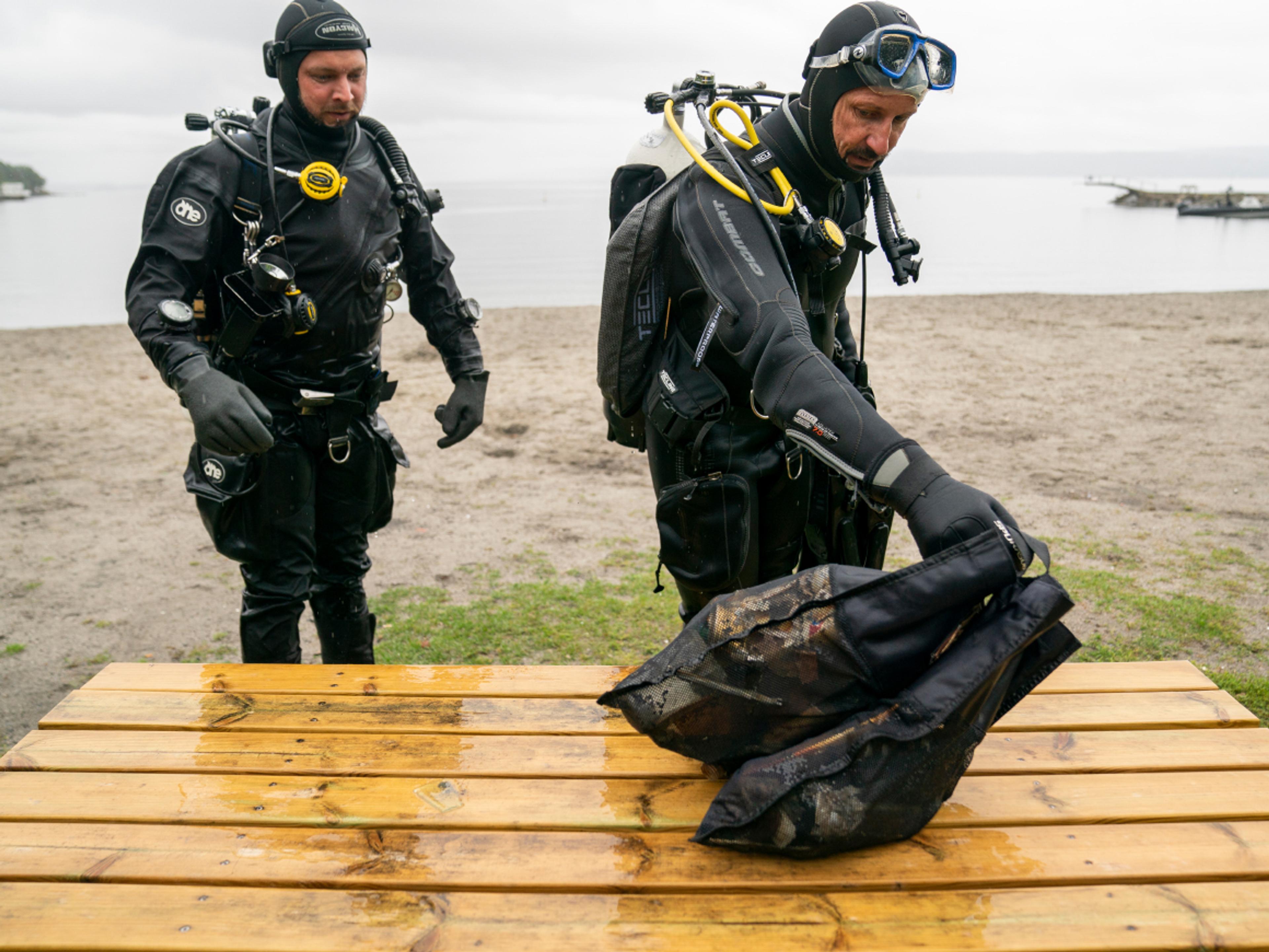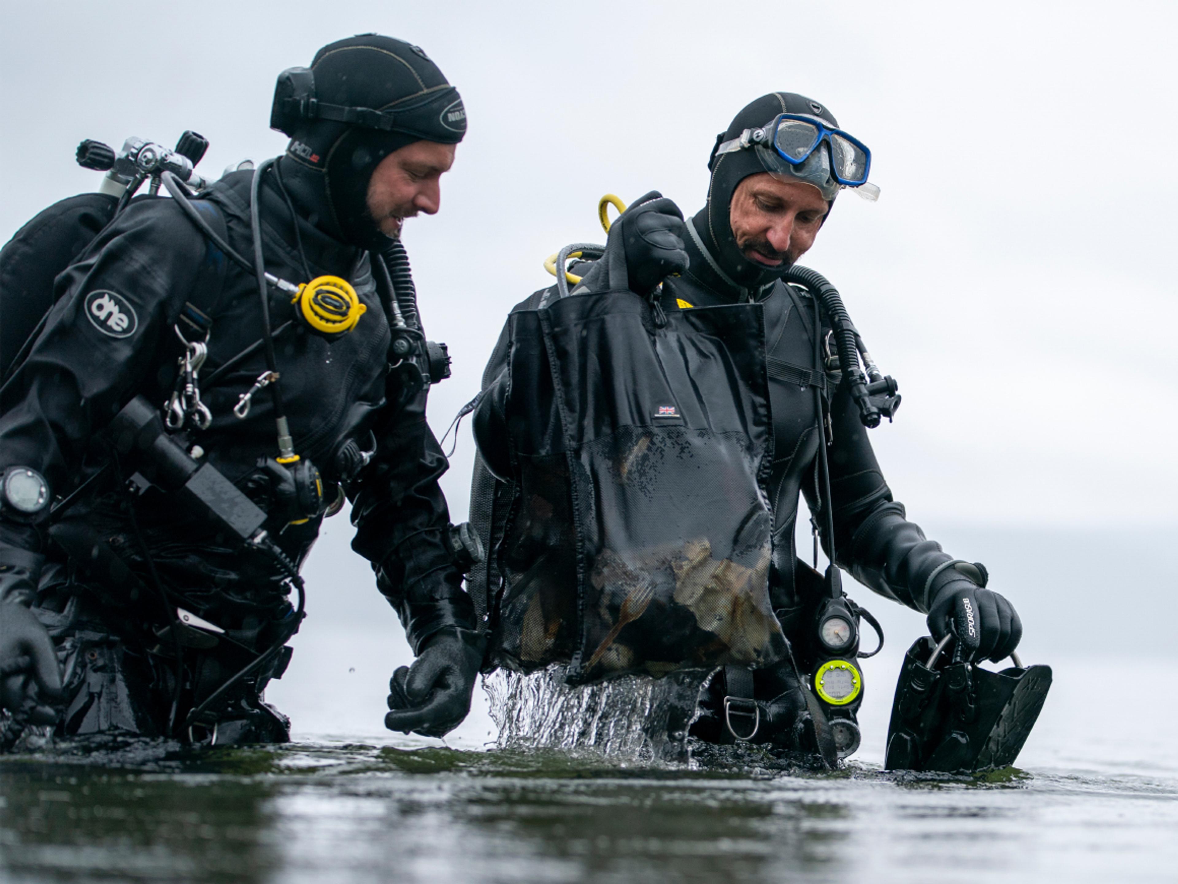 I øsende regn tok Kronprinsen og resten av dykkerteamet på seg dykkerutstyr og gikk ut i vannet. Her gjennomførte de et dykk som varte i 38 minutter, og når de kom opp igjen hadde de med seg to store poser med plastsøppel de hadde plukket med seg. De to fant både solbriller, ishockeypuck og golfballer på bunnen - i tillegg til rester av poser, plastflasker og liknende.