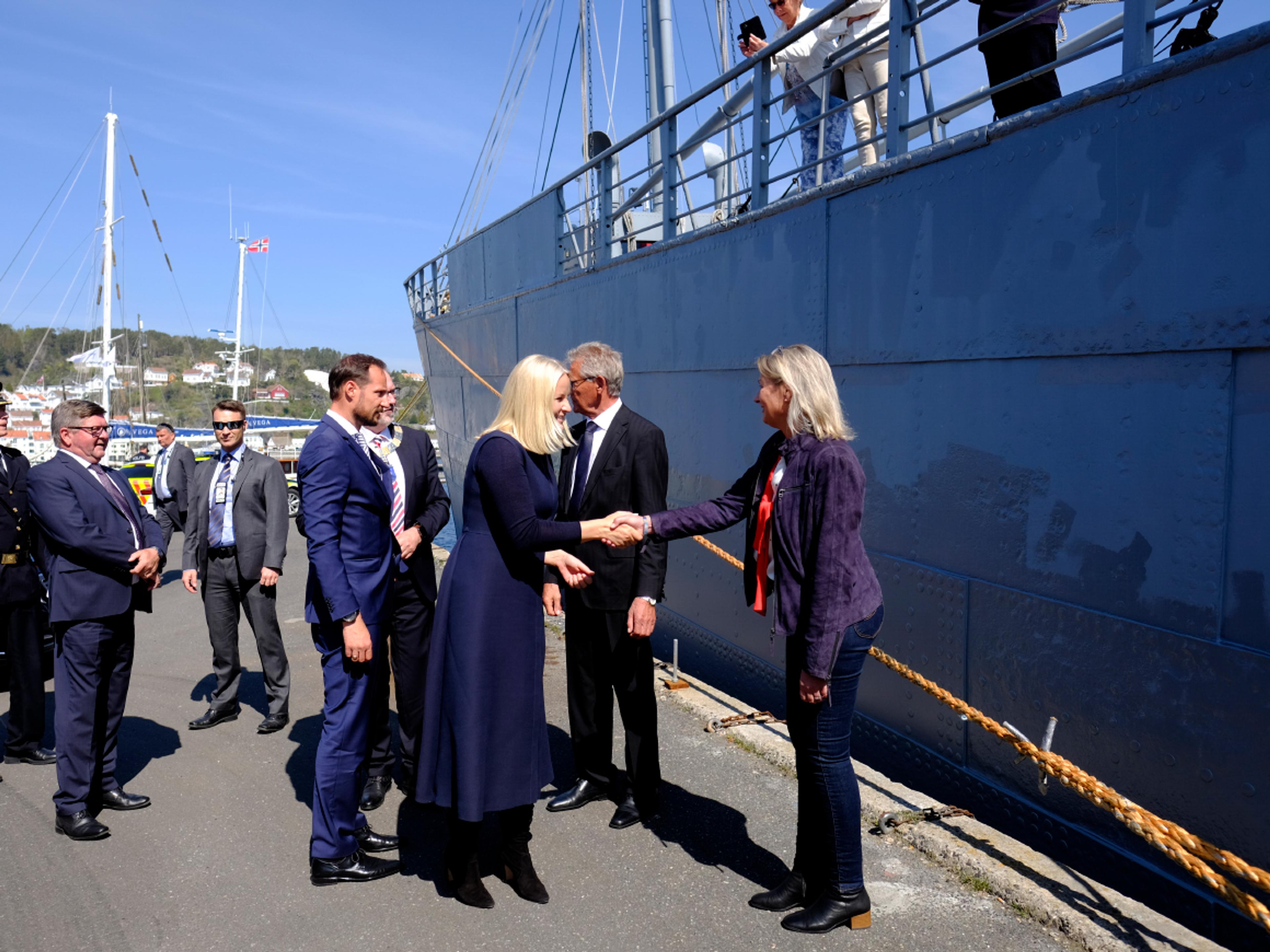 Kronprinsparet besøkte også museumsskipet D/S Hestmanden som lå til kai i Risør - det eneste bevarte skipet fra Nortraships store flåte under andre verdenskrig.