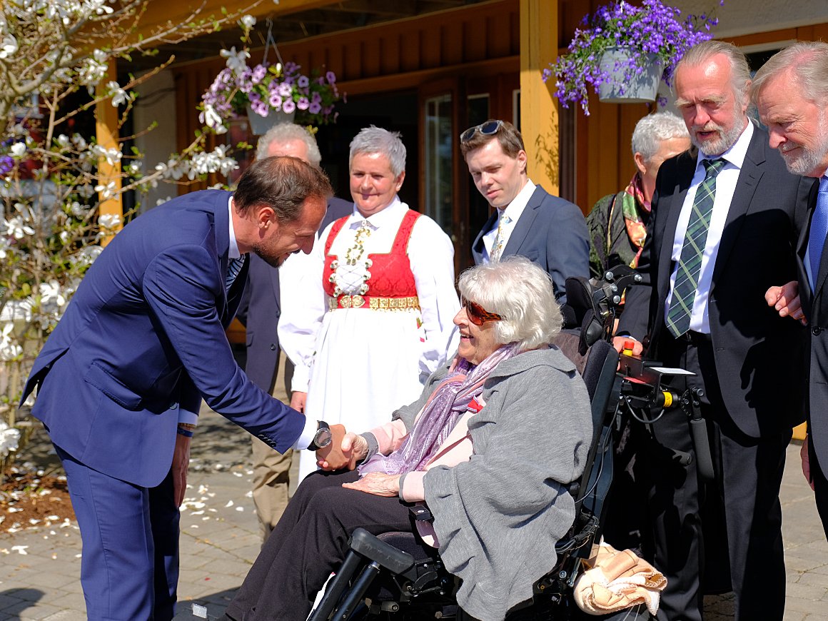 Like i forkant av seremonien hadde hun hilst på Kronprinsparet foran bestyrerboligen – på samme sted som Kong Olav hadde møtt mannen hennes Leif Heimstad 50 år tidligere.