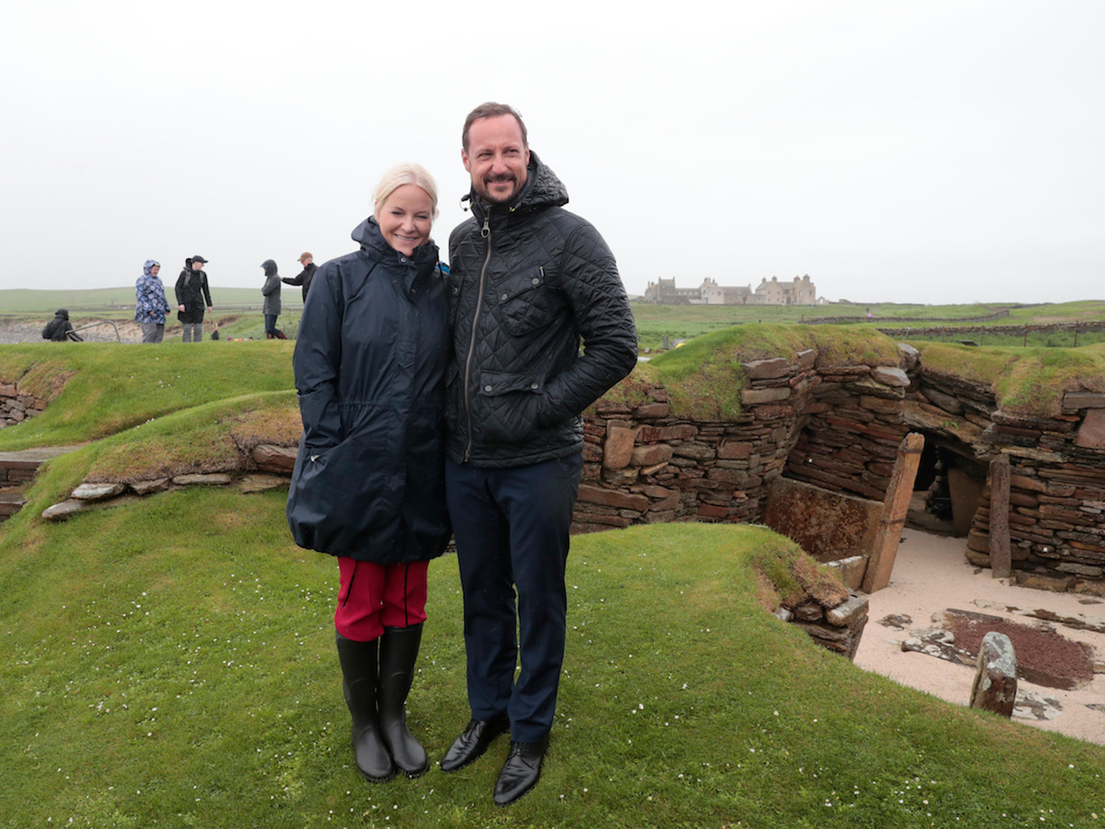 Deres Kongelige Høyheter Kronprinsen og Kronprinsessen kom til Skara Brae i formiddag. Der fikk de bli med på en reise som går 5 000 år tilbake i tid. Sammen med De stående steiner ved Stenness og steinsettingen Brodgar fikk Skara Brae plass på UNESCOs verdensarvliste i 1999.