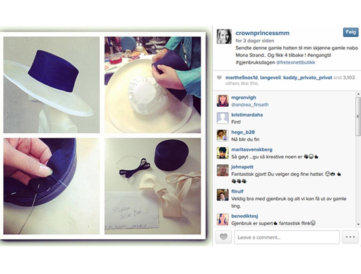 Som en oppkjøring til Gjenbruksdagen sendte Kronprinsesse Mette-Marit en av sine hatter for å bli redesignet. Bilder av prosess og resultat publiserte Kronprinsessen på sin Instagram.