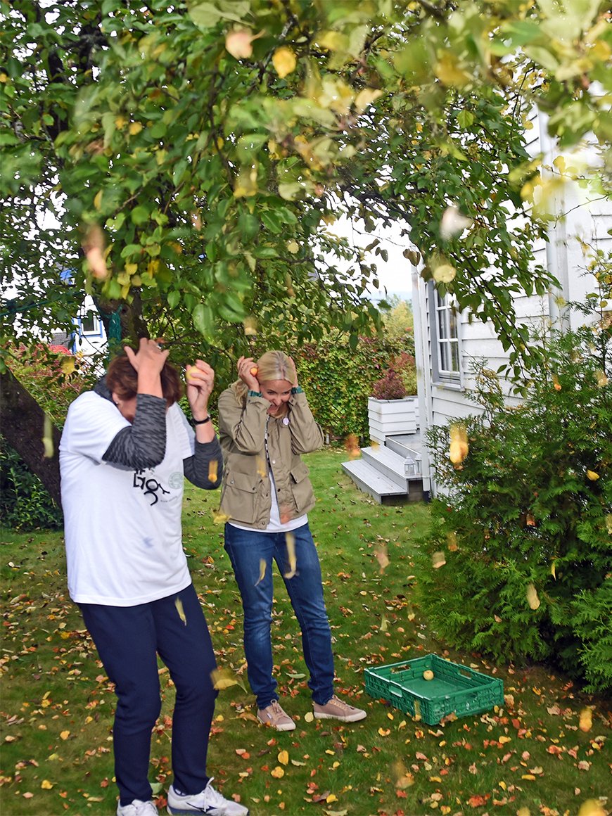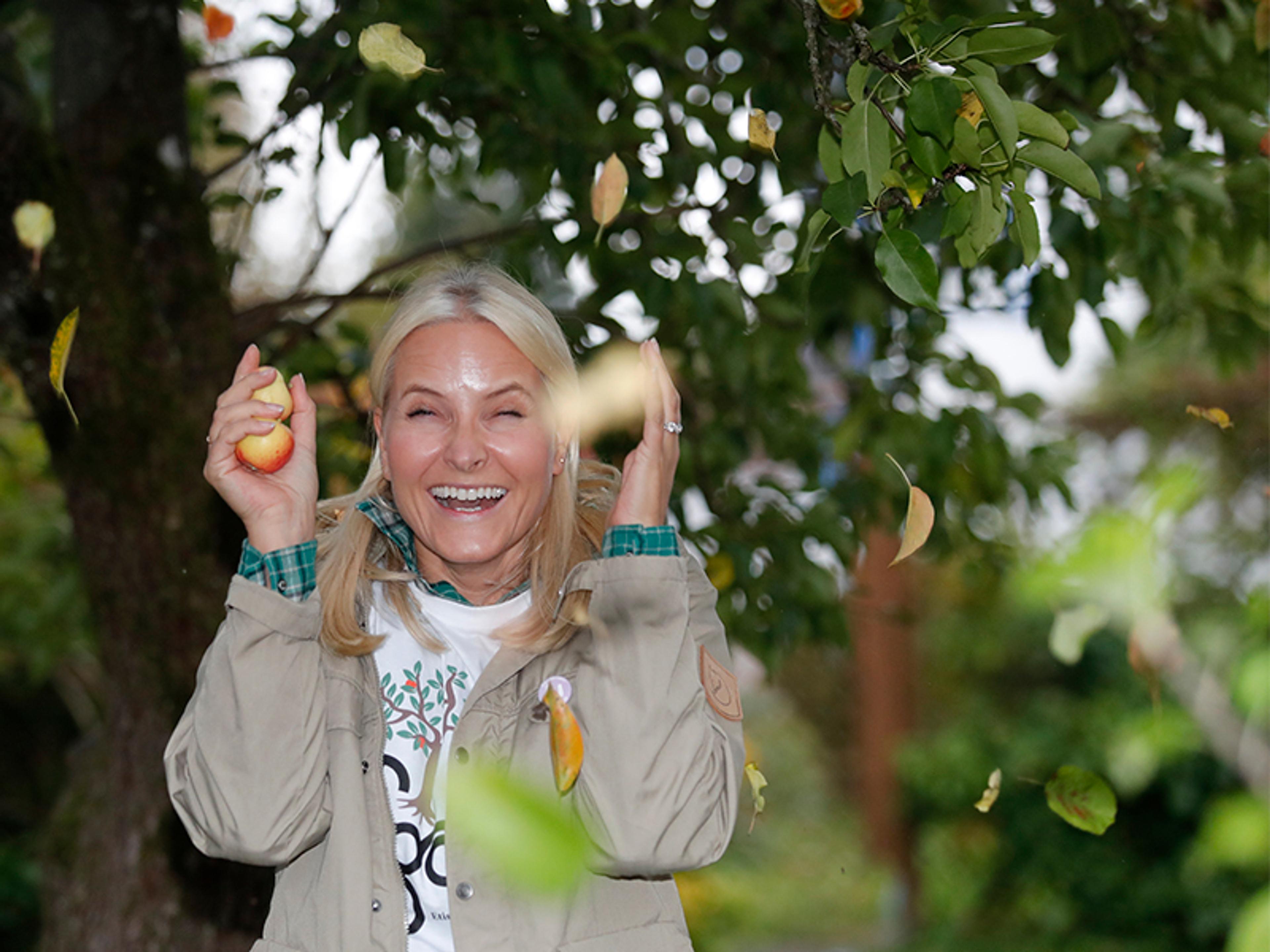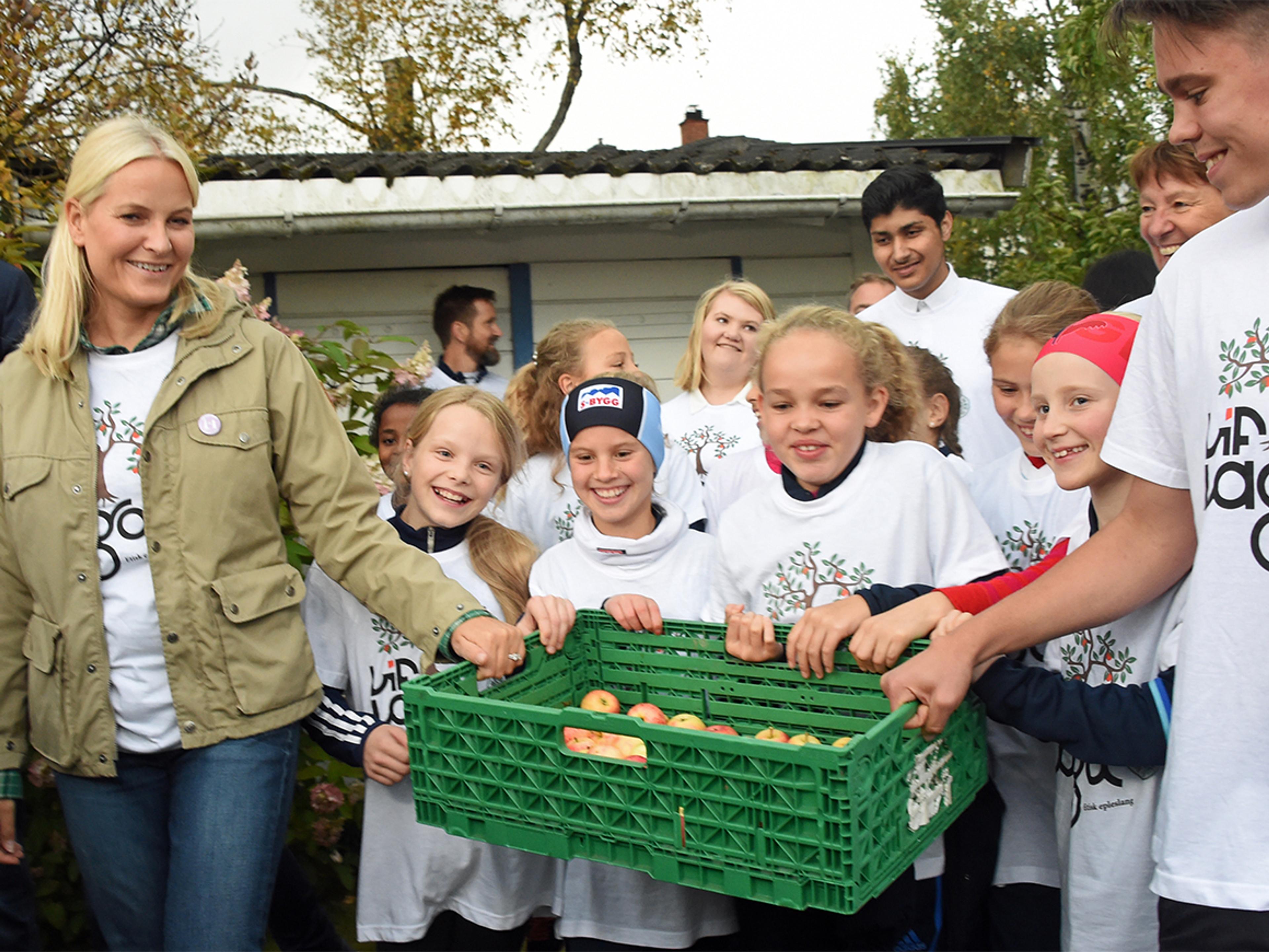 Hennes Kongelige Høyhet Kronprinsessen deltok i eplehøstingen sammen med prosjektet Lif Laga på Stovner i Oslo i dag. Frukt som ellers ville gått til spille blir eplesaft til inntekt for Redd Barna.