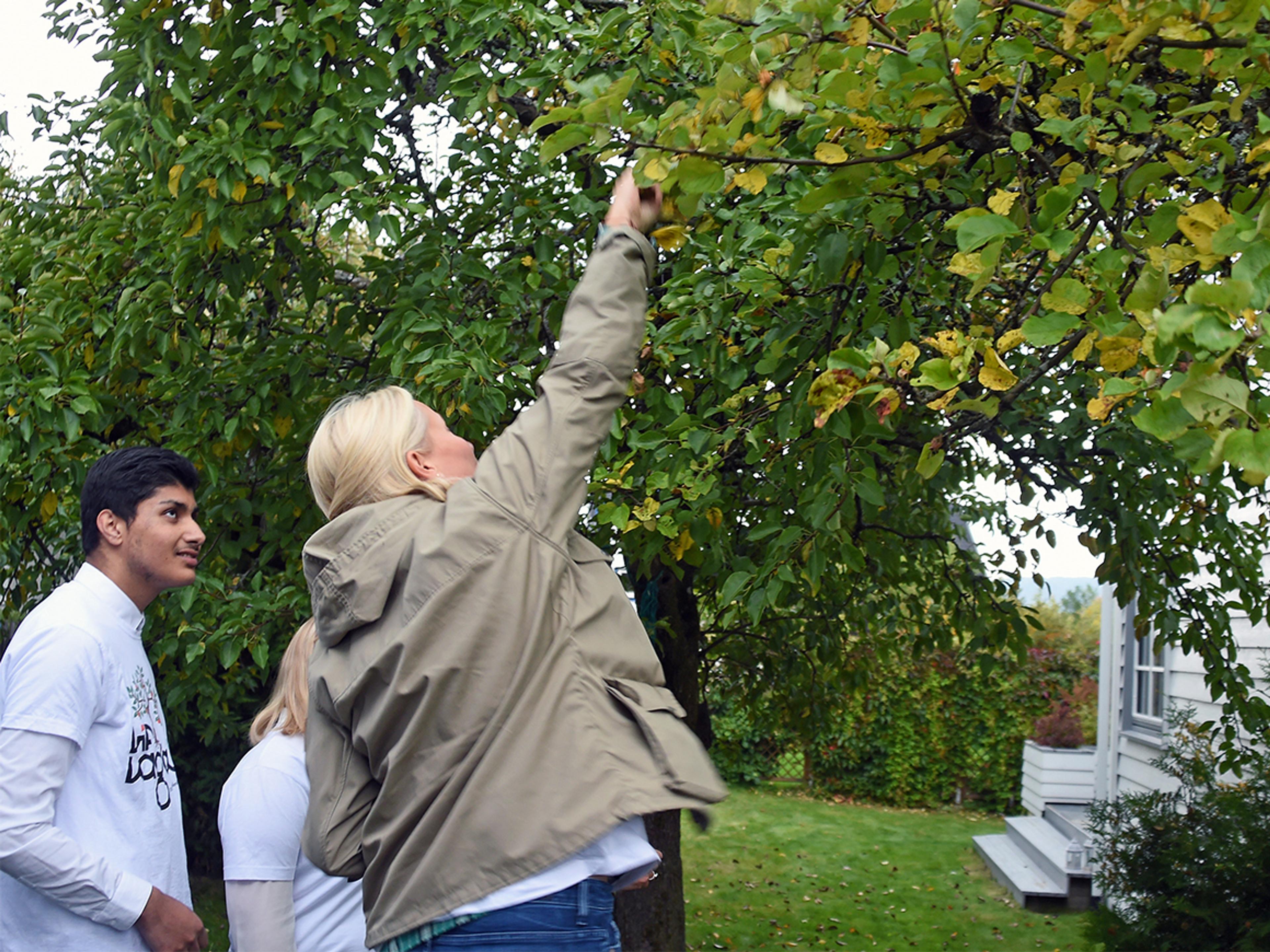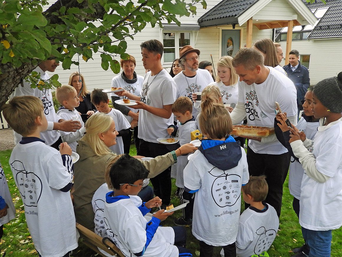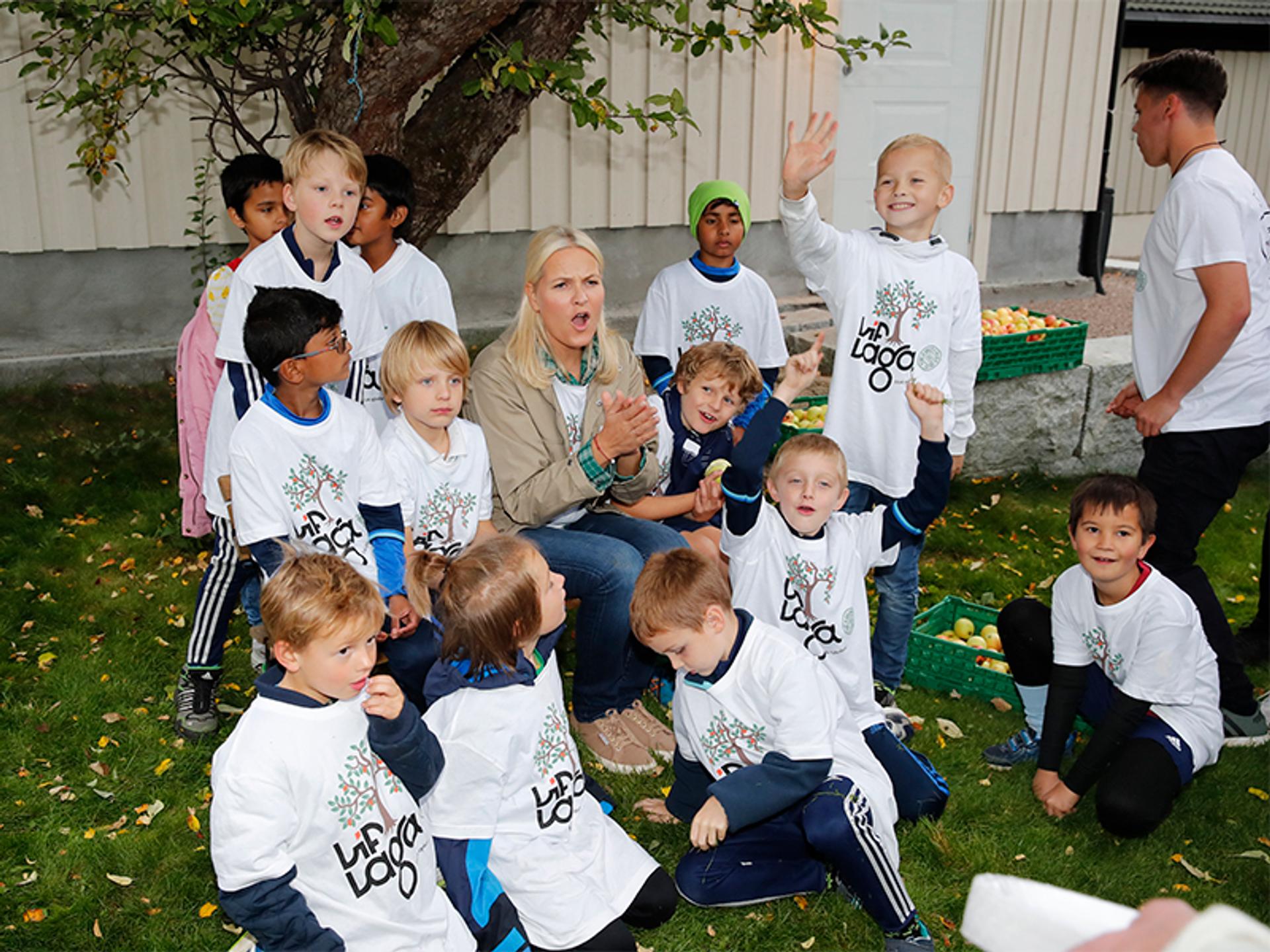 Hennes Kongelige Høyhet Kronprinsessen deltok i eplehøstingen sammen med prosjektet Lif Laga på Stovner i Oslo i dag. Frukt som ellers ville gått til spille blir eplesaft til inntekt for Redd Barna.