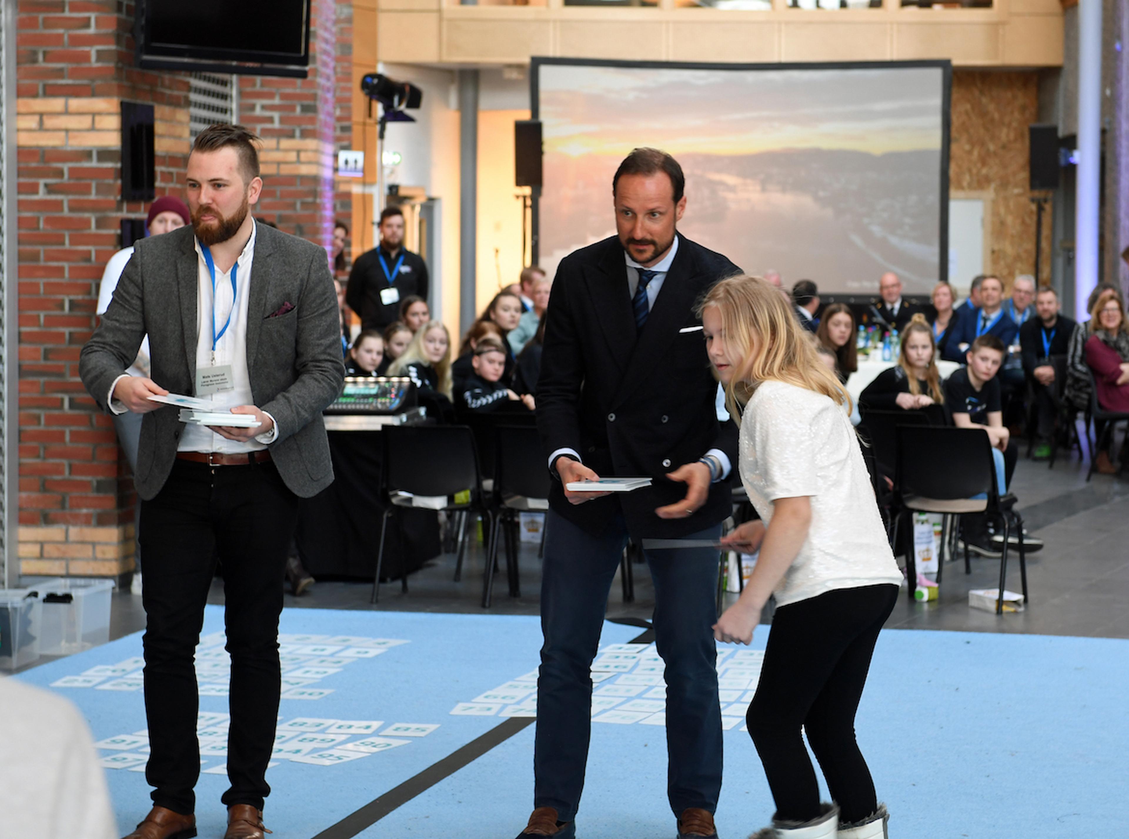 Lek og læring med tall var siste post på programmet i senteret. Sammen med elever fra Myrene skole deltok Kronprinsregenten i fysisk aktivitet med regnestykker. Besøket ble avsluttet ved en utendørs omvisning på byggeplassen for det nye idrettsbygget.