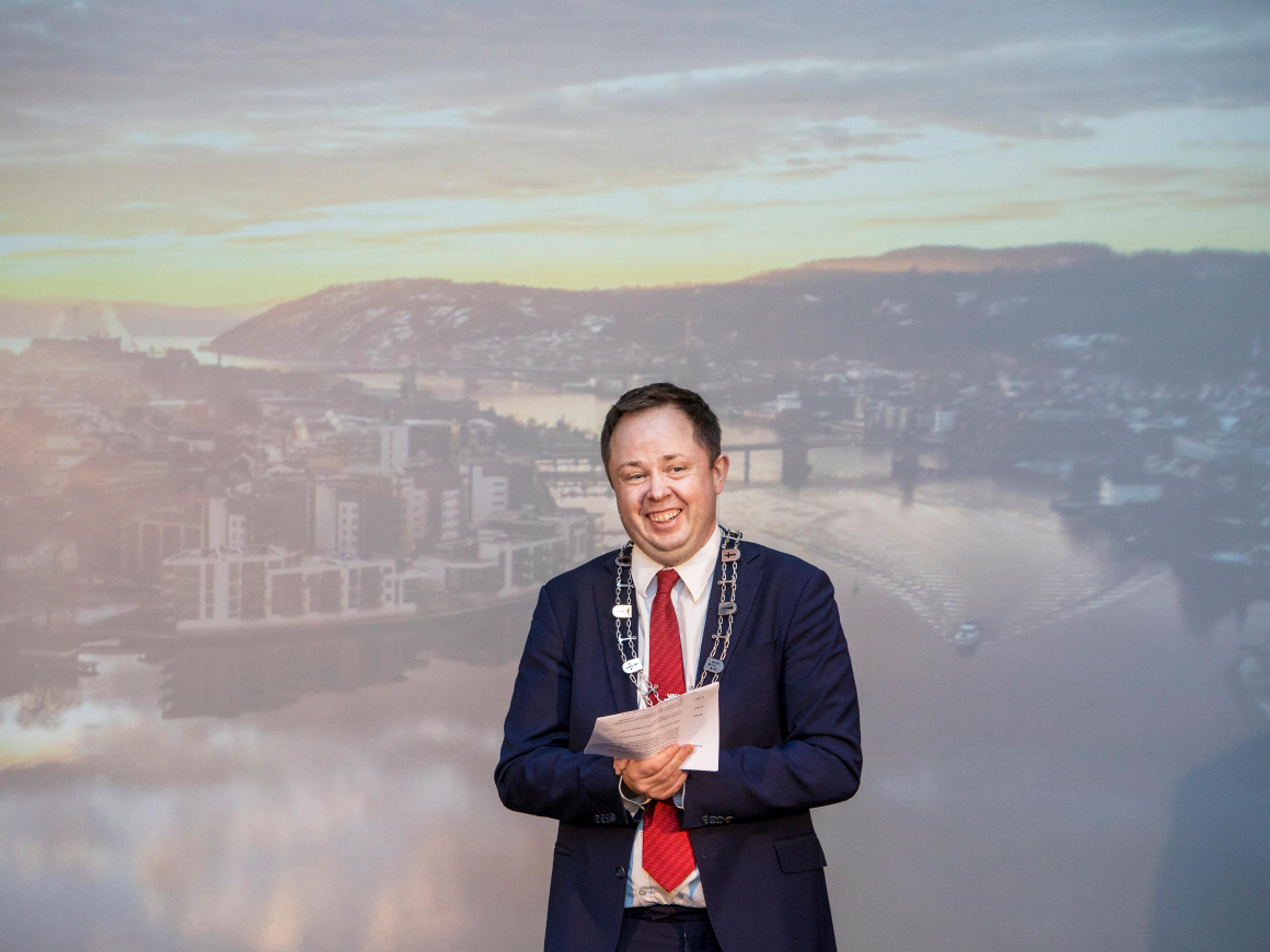 Sammen med kommunens varaordfører Janicke Andreassen fortalte ordfører Robin Kåss om Porsgrunn, Kjølnes og den nye idrettshallen som er under bygging.