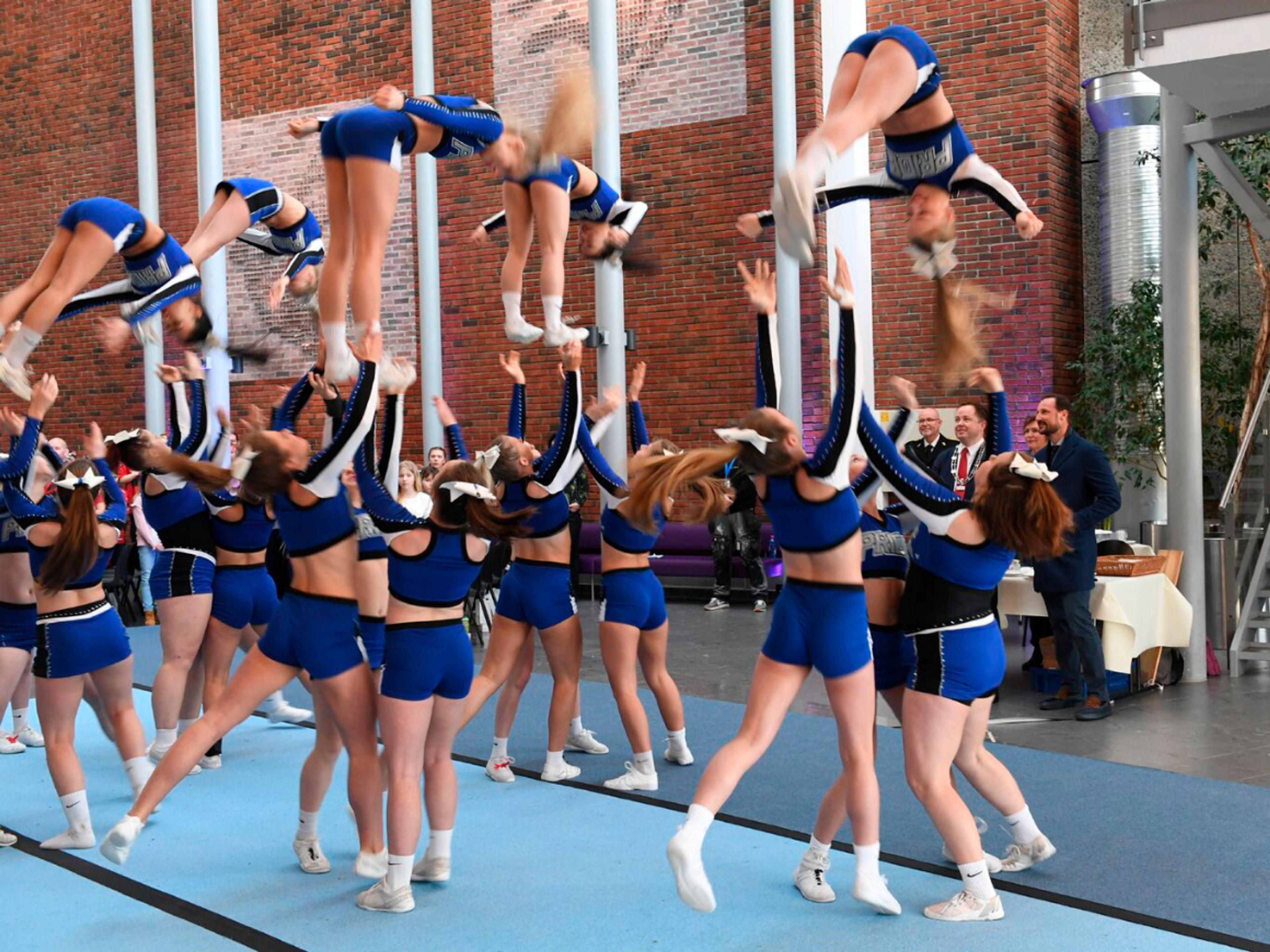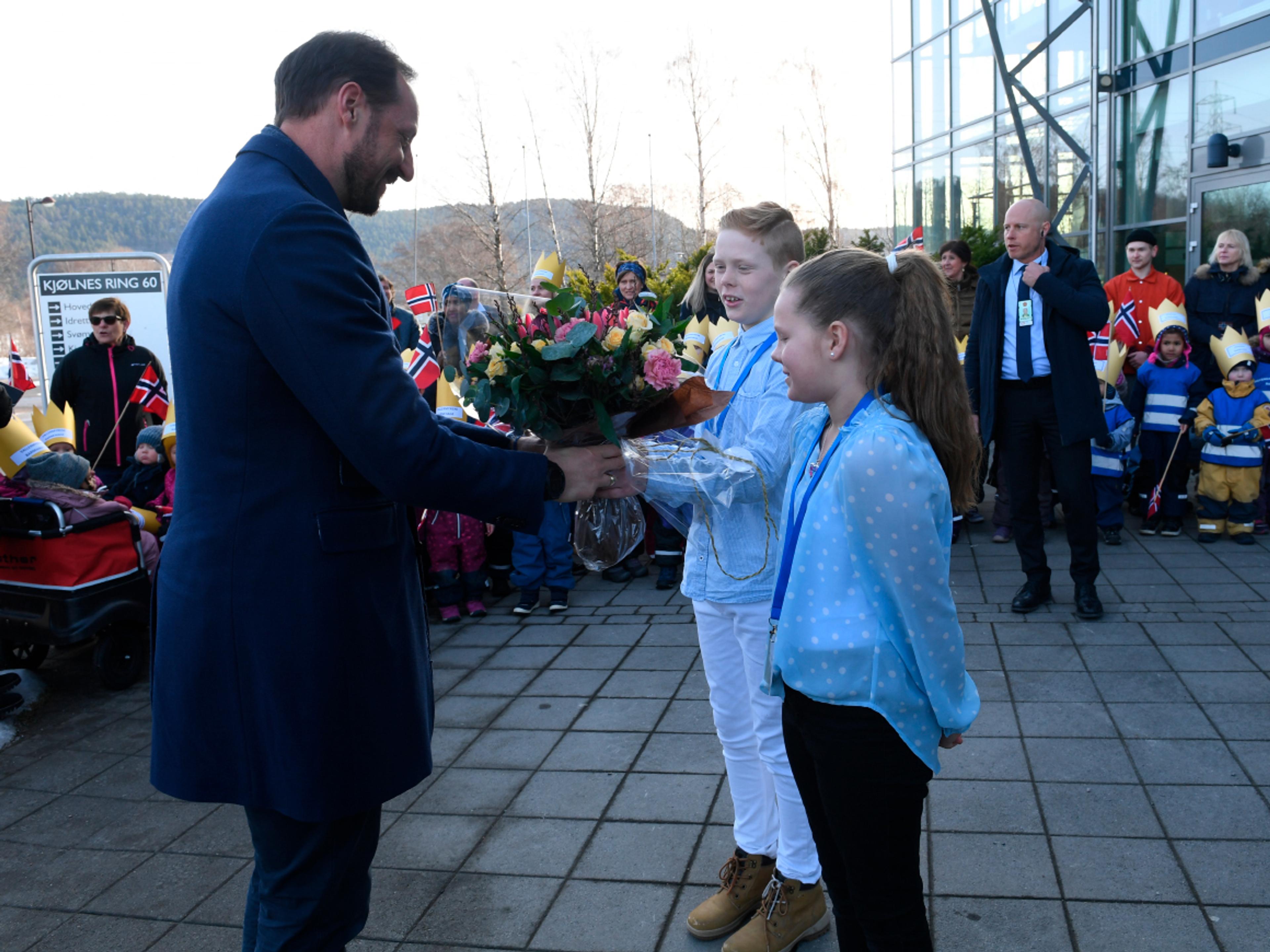 Ti-åringene Eskil Bjørnstad og Ella Bøe Bjønnes hadde vunnet loddtrekningen om hvem som skulle få ønske Kronprinsregenten velkommen til Porsgrunn, og ventet spent på å få overrekke blomster. Inne i hallen på Frisklivssenteret ga utøverne fra Pors Pride Cheerleading en spektakulær oppvisning.