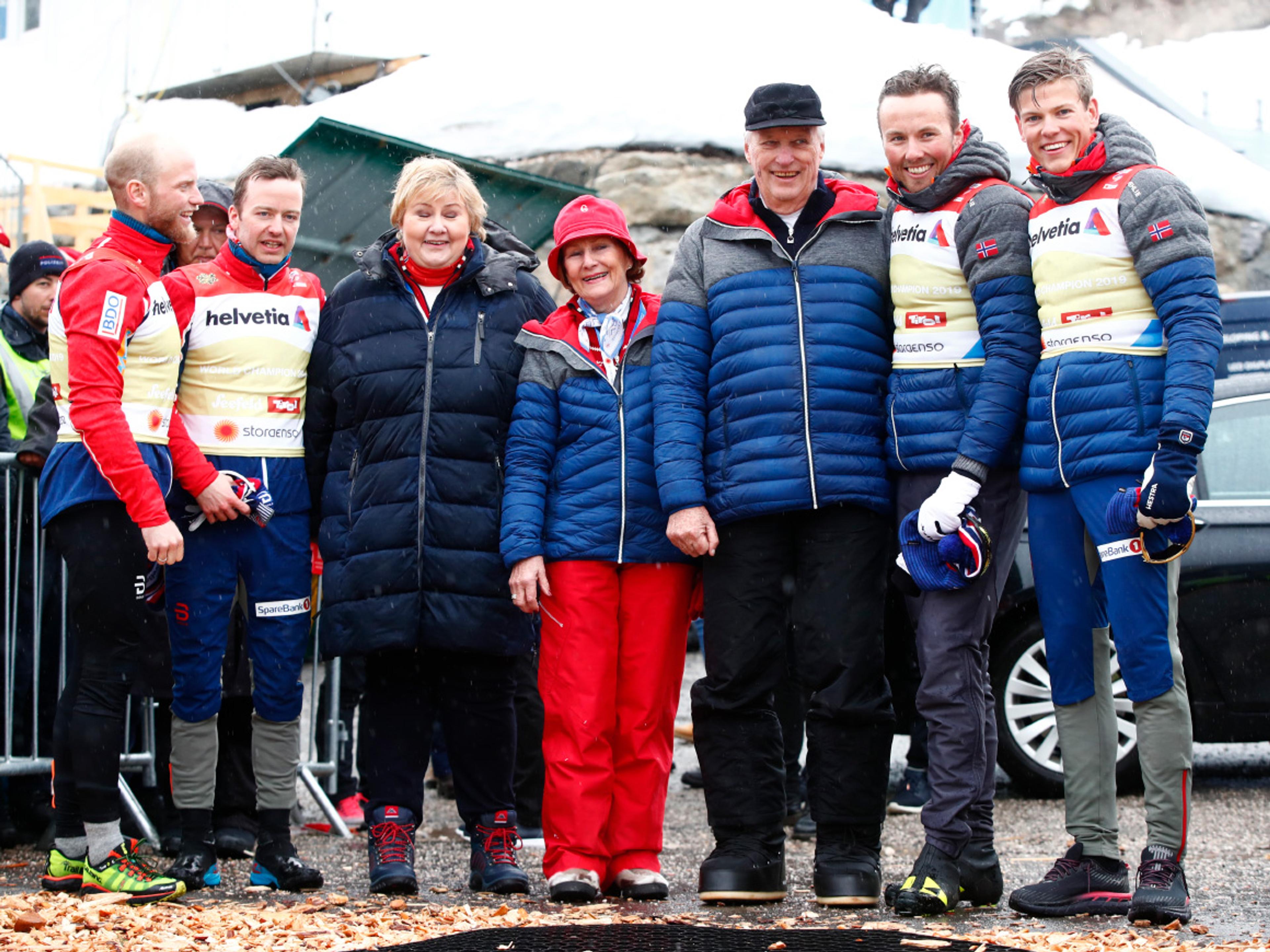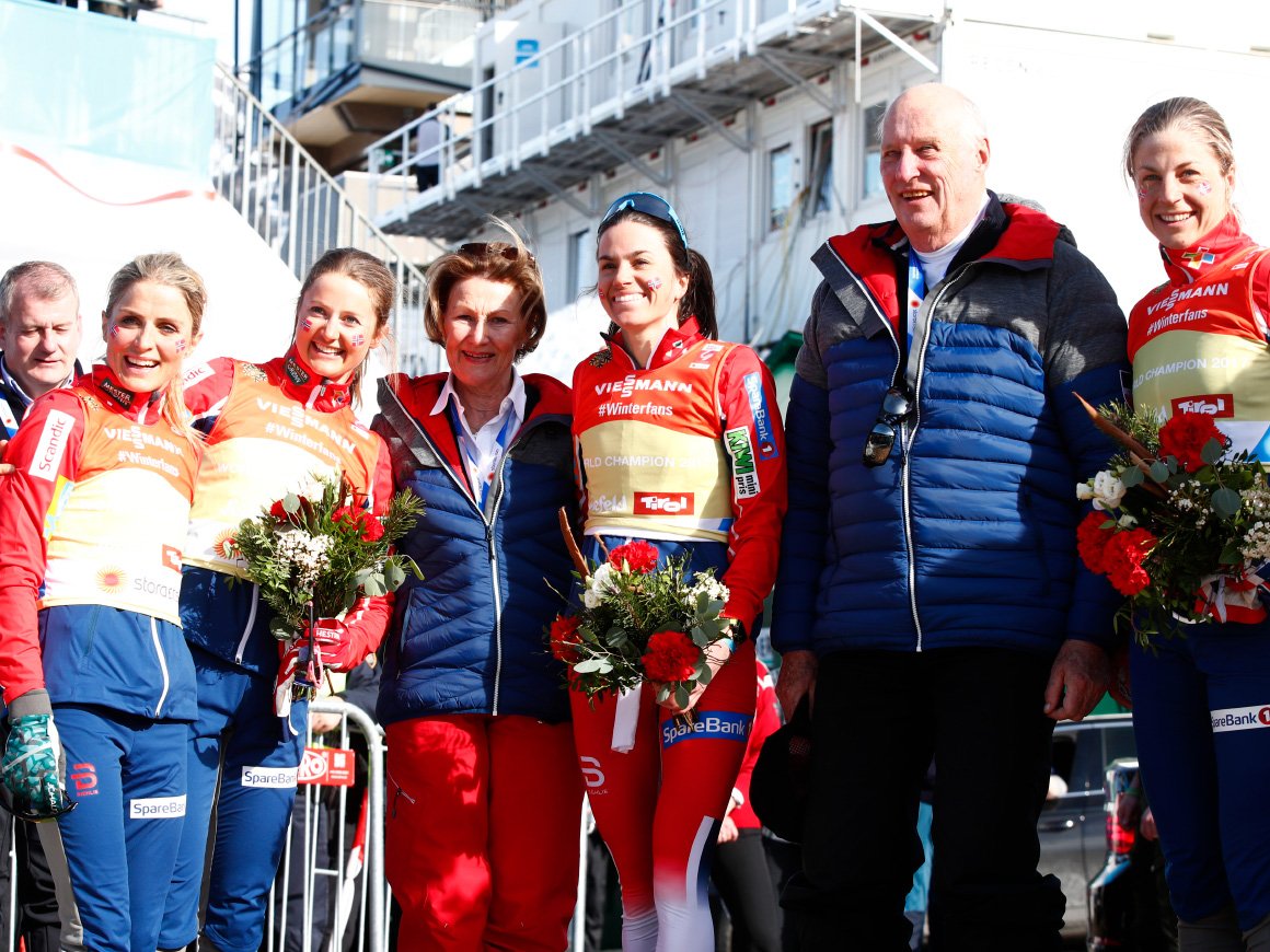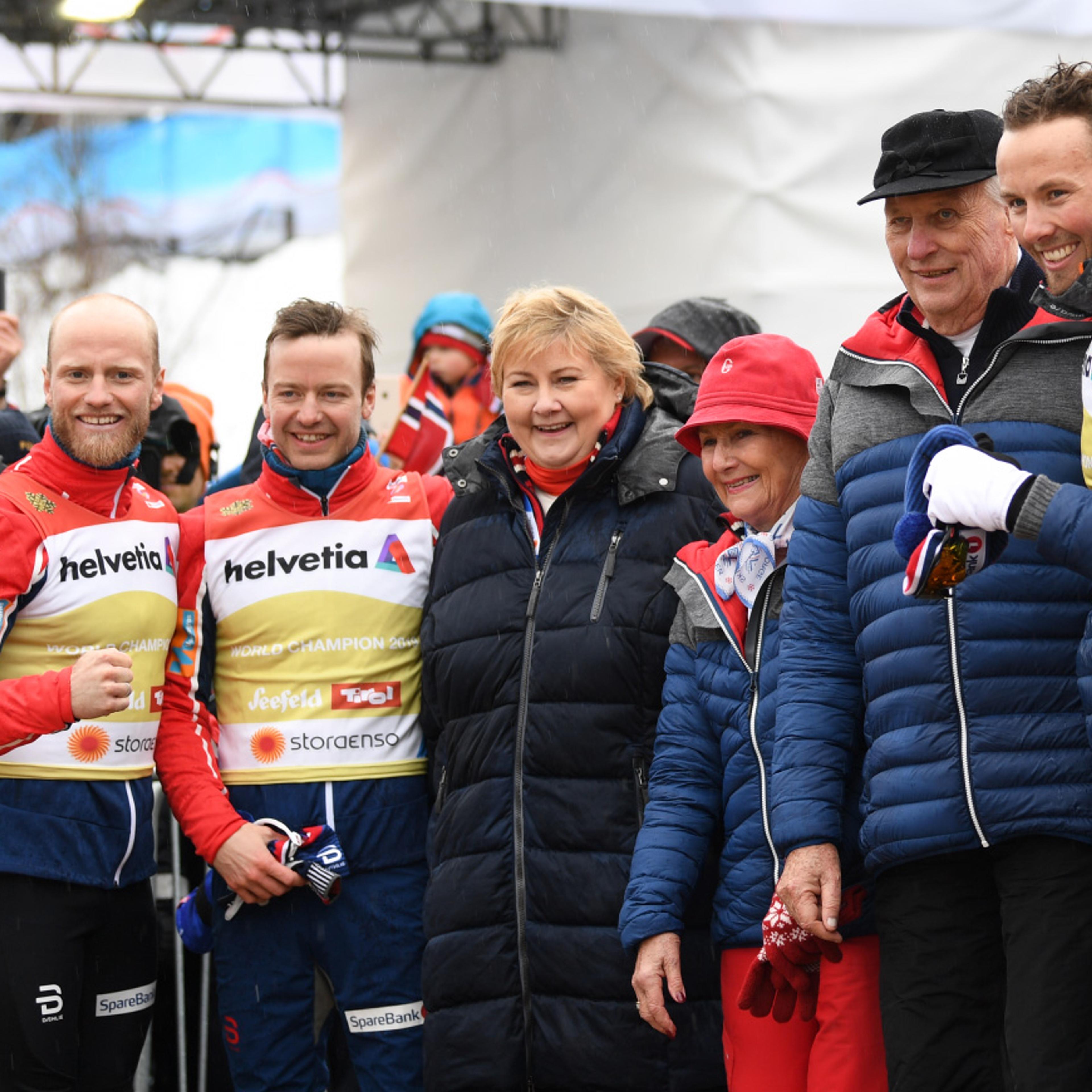 Kongeparet avslutta opphaldet sitt i Seefeld under VM på ski med å følgje herrestafetten i dag. Etter 17 av 22 øvingar leier Noreg medaljestatistikken med heile 19 medaljar totalt.
