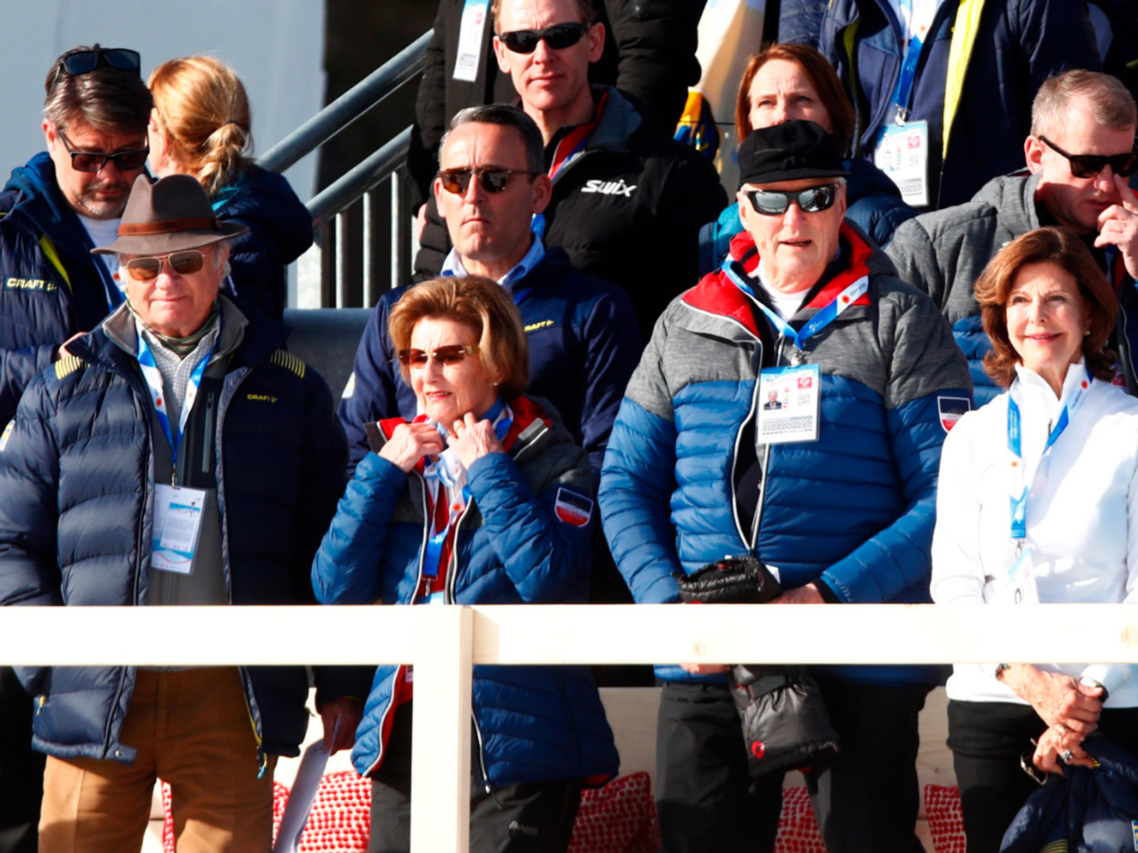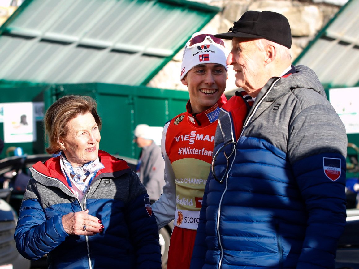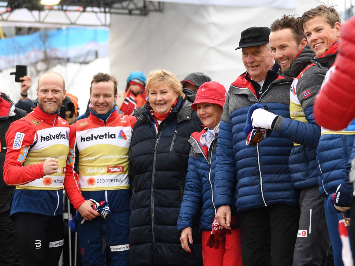 Kongeparet avslutta opphaldet sitt i Seefeld under VM på ski med å følgje herrestafetten i dag. Etter 17 av 22 øvingar leier Noreg medaljestatistikken med heile 19 medaljar totalt.