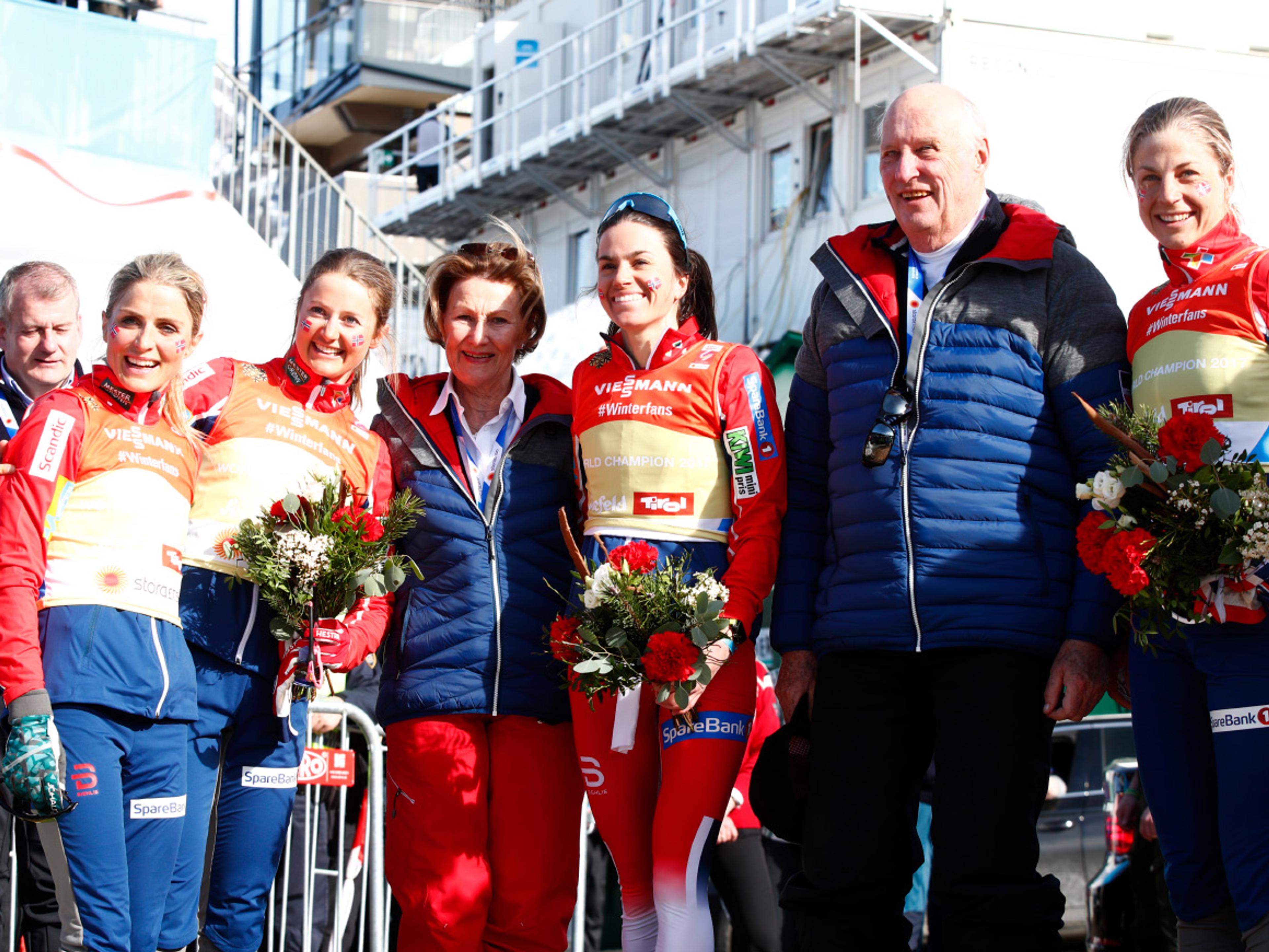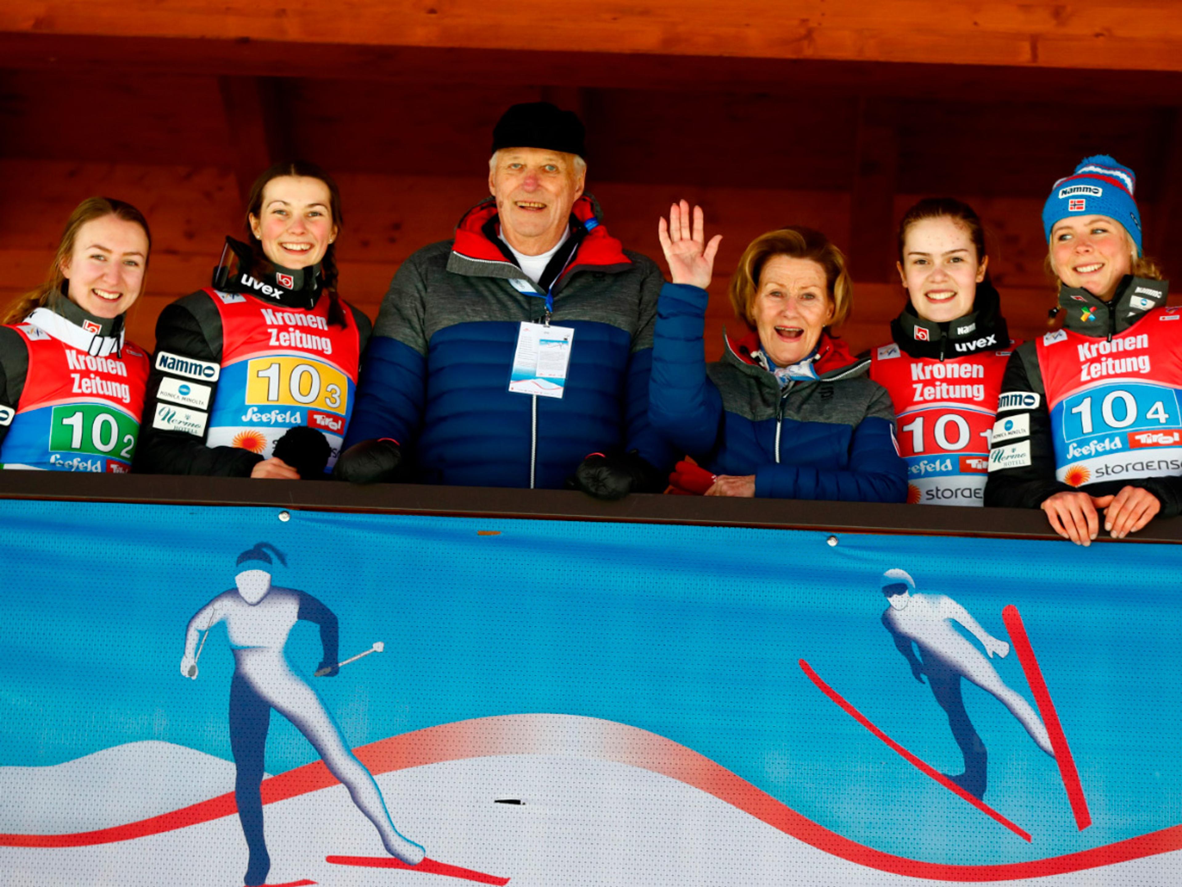 Silje Opseth, Ingebjørg Saglien Bråten, Anna Odine Strøm og Maren Lundby møtte Kongeparet etter prestasjonen i det historiske hopprennet. Tyskland og Austerrike tok gull og sølv.