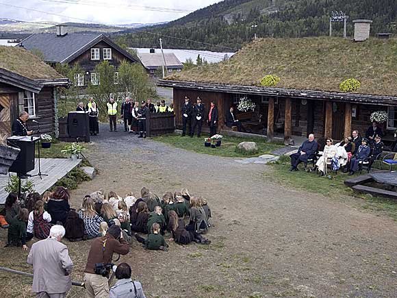 Med tunet på Vasetstølen som ramme, ble Kongeparet ønsket velkommen til Vestre Slidre. På veien dit, fikk Kongen og Dronningen se flere tablå med kjente skikkelser fra norske folkeeventyr. Det var elever fra den lokale kunstskolen som sto for eventyrtablåene, og som også underholdt på tunet senere. Kulturskolen er svært aktiv, og de aller fleste elevene i grunnskolen her deltar.