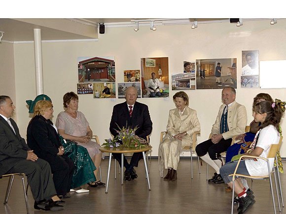 I biblioteket møtte Kong Harald og Dronning Sonja en flerkulturell gruppe og fikk høre om deres liv i Valdres. En fotoutstilling med Nils Rogn som fotograf viste Kongeparet glimt fra hverdagslivet i Vang.