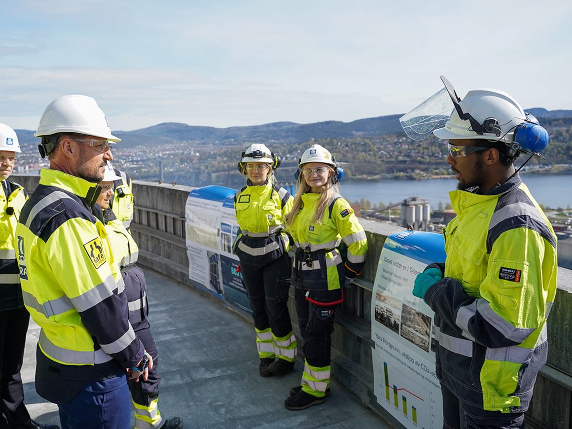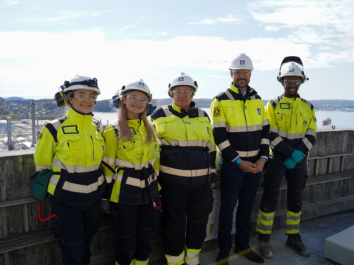 På toppen av Prilletårnet, 23 etasjer, opp ble Kronprinsen vist rundt av fabrikksjef Ole Jacob Siljan og lærlingene Hamza Hussein, Emma Sofie Steen og Sofie Hafredal. Kronprinsen fikk en orientering om Yaras røtter i Telemark, tiltak for reduksjon av klimagasser og planene for framtiden. Fra toppen fikk Kronprinsen en fantastisk utsikt over Herøya Industripark, Frierfjorden og det meste av ruta der Yara Birkeland skal gå.