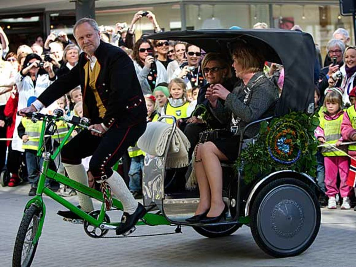 Reisa frå Vitenfabrikken til kulturhuset gjekk gjennom byen i sykkeldrosjen til Egil Øivind Ovesen, som hadde både Dronninga og Sandnes-ordførar Norunn Østråt som passasjerar.