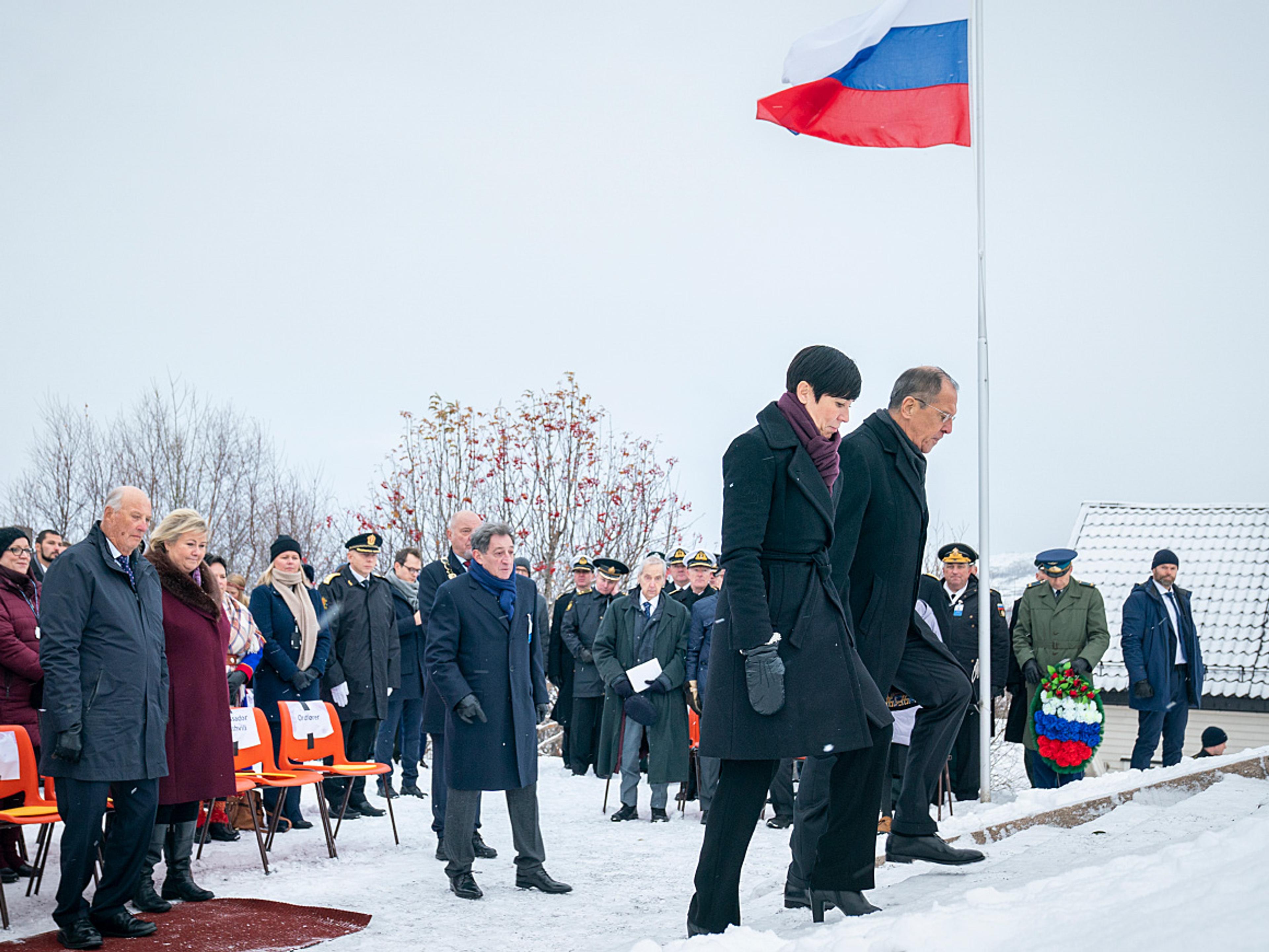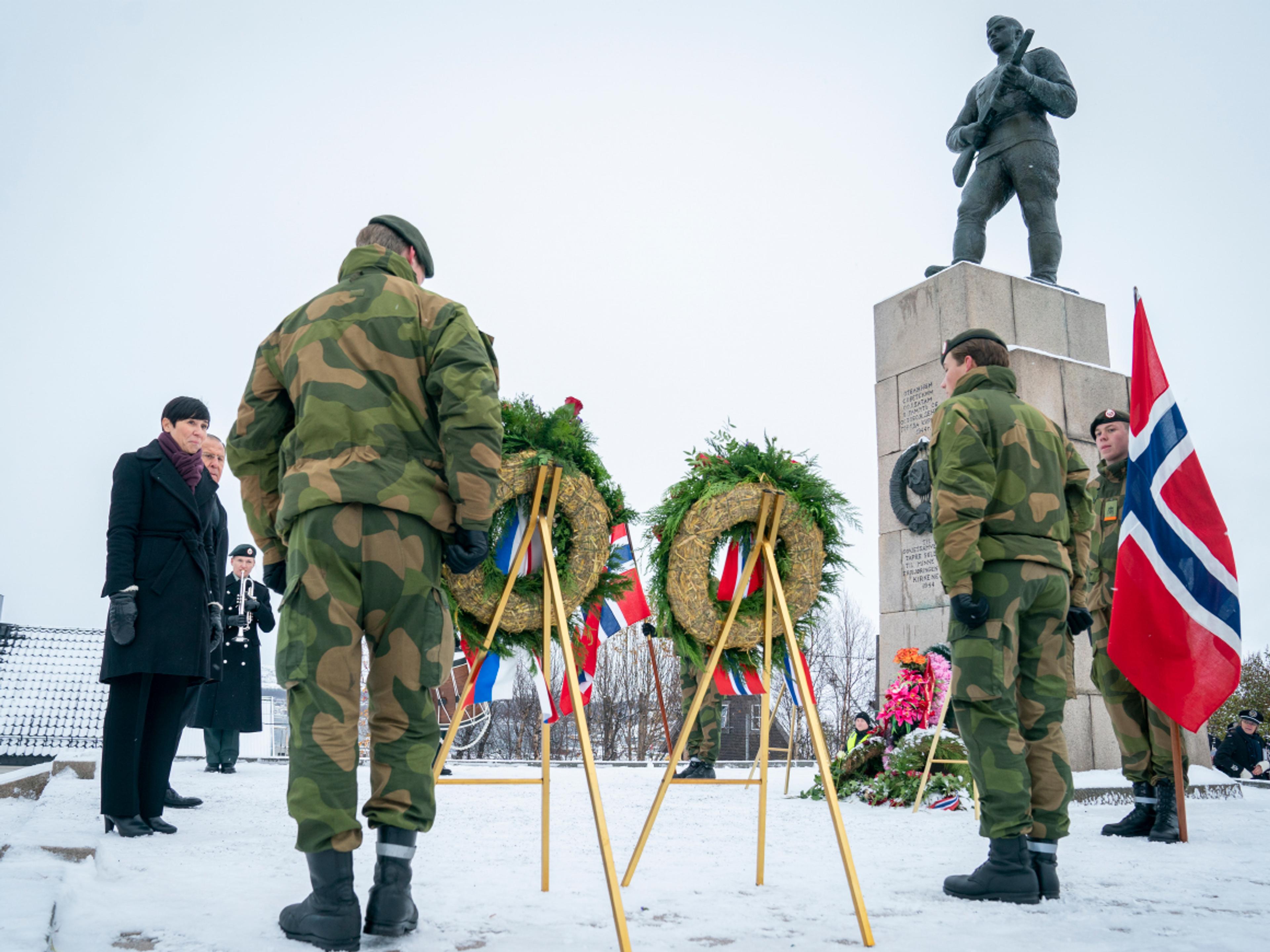 Senere la utenriksministrene Sergej Lavrov og Ine Eriksen Søreide krans ved minnesmerket over falne sovjetiske soldater.