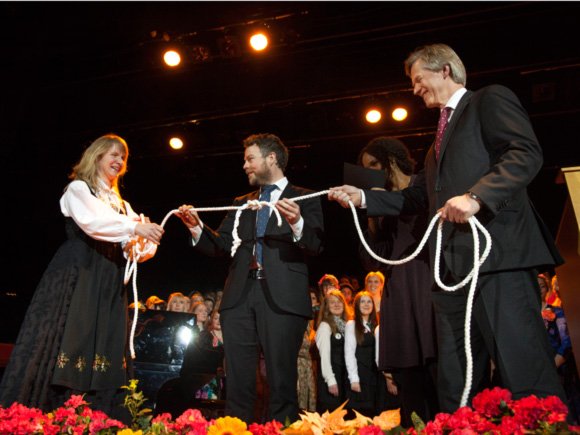 Etter en fanfare av Edvin Østergaard, kunne dagens konferansier, Haddy N'jie, ønske velkommen til åpningen. Styreleder Siri Hatlen, som siden 2012 har ledet arbeidet med fusjonen, overrakte rektor Tveit det nye rektorkjedet, før kunnskapsminister Torbjørn Røe Isaksen holdt tale.