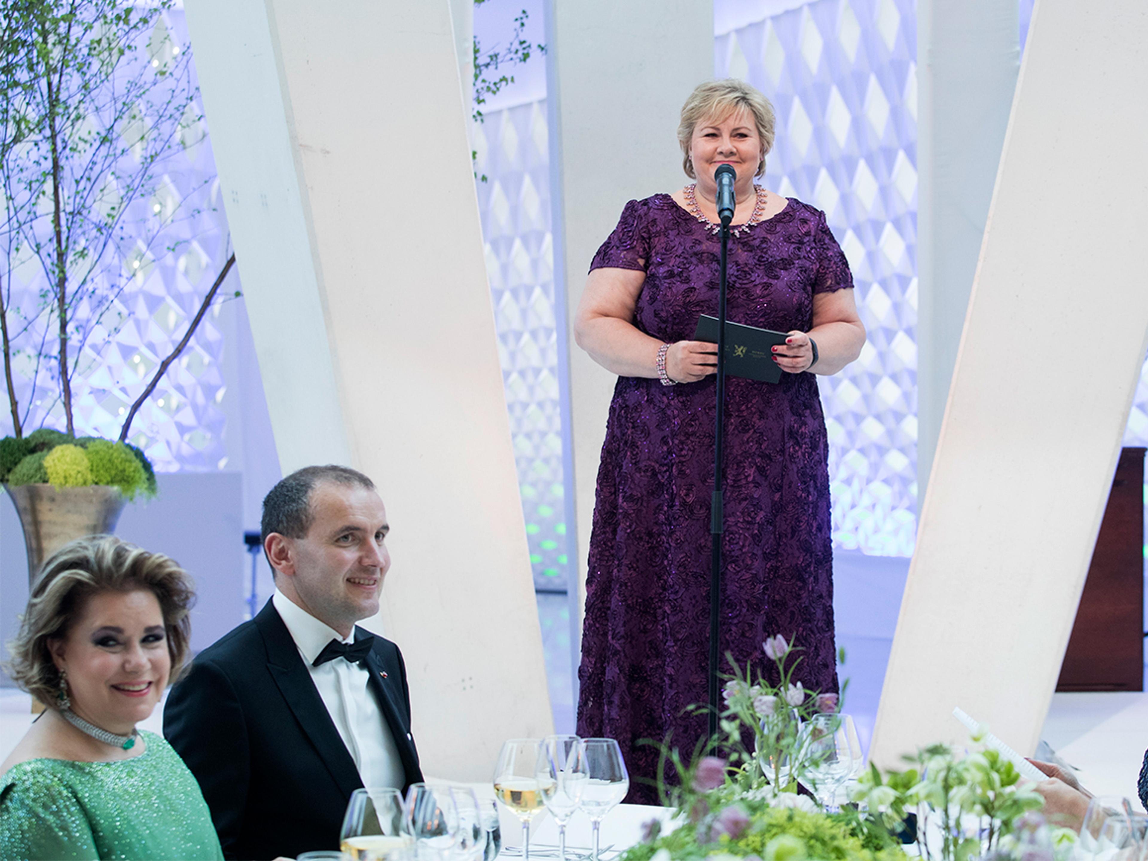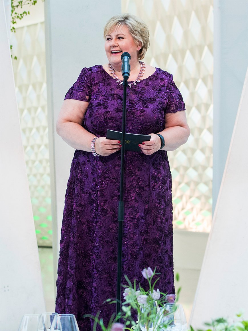 Taler hører med ved en slik anledning, og i kveld var det to. Kveldens vertinne, statsminister Erna Solberg var først ut.