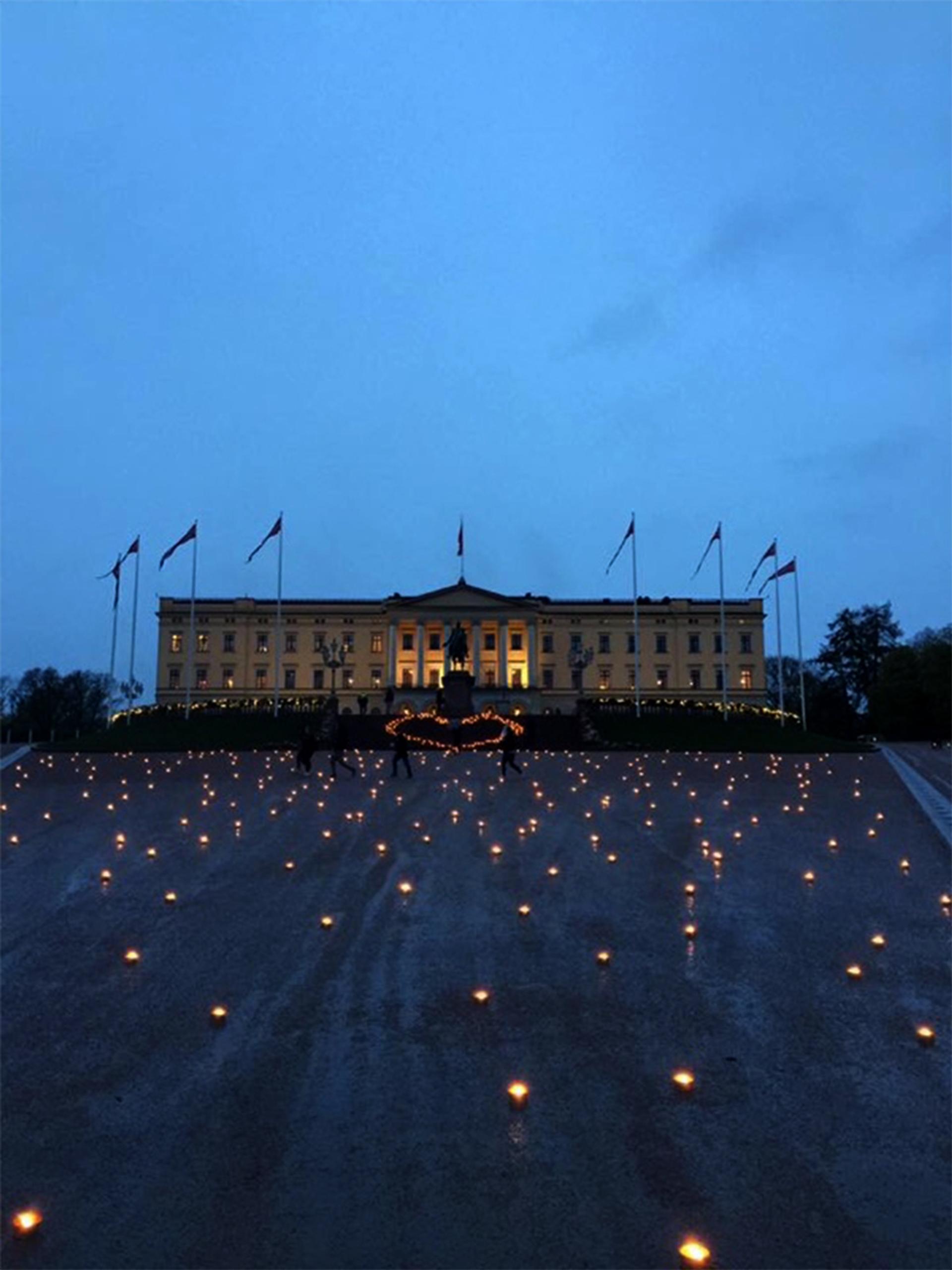 Også på Slottsplassen ble det tent lys som overraskelse for Kongefamilien når de vendte tilbake til Slottet.
