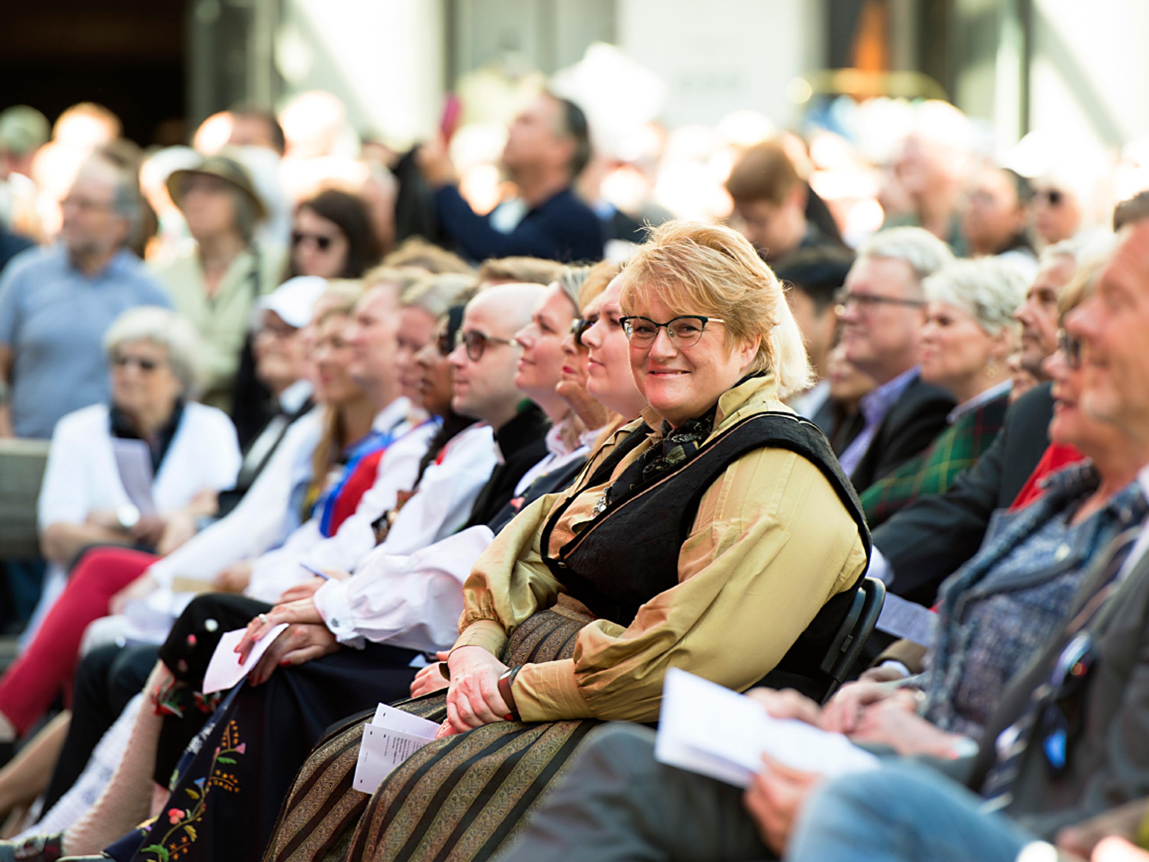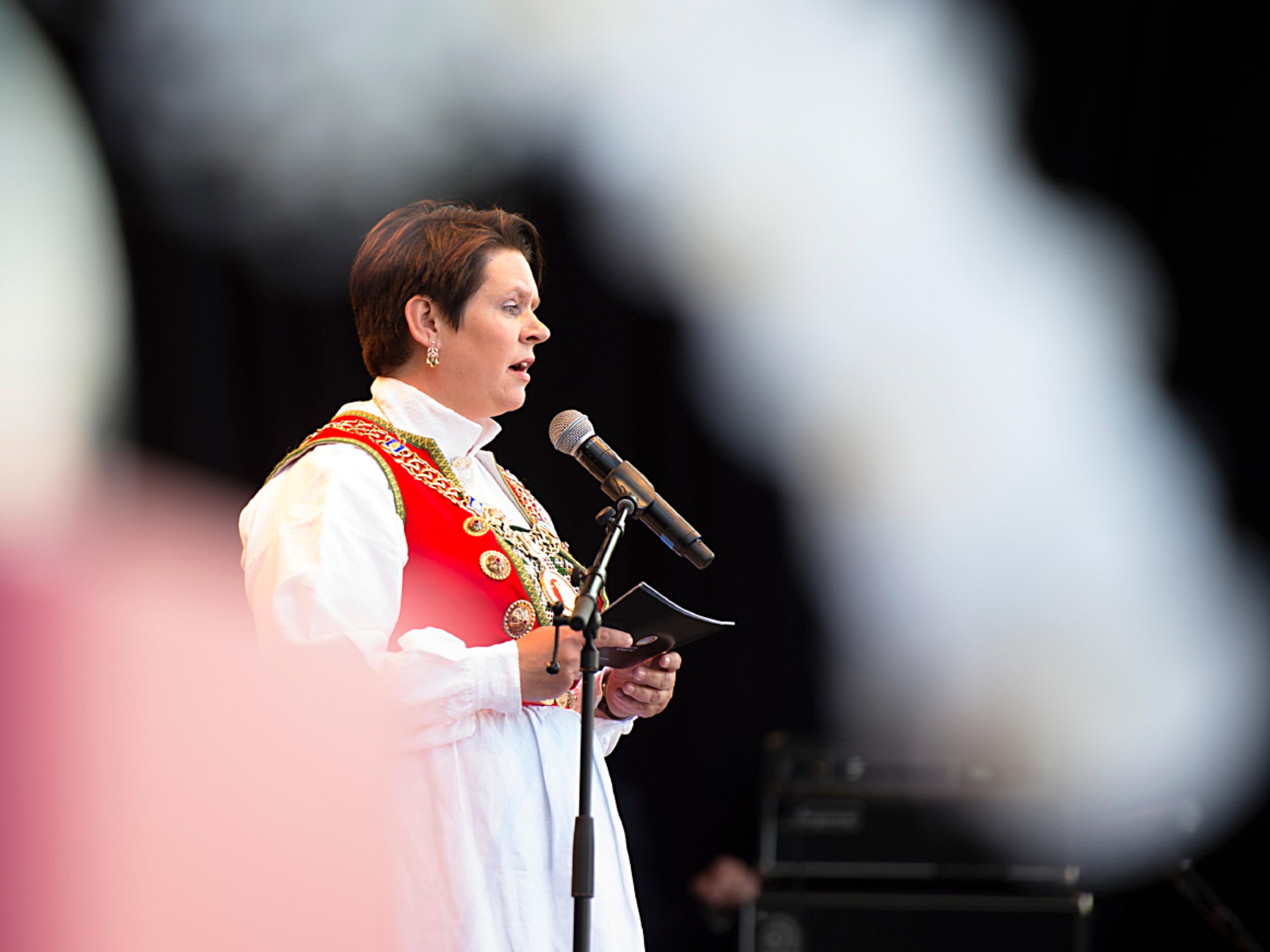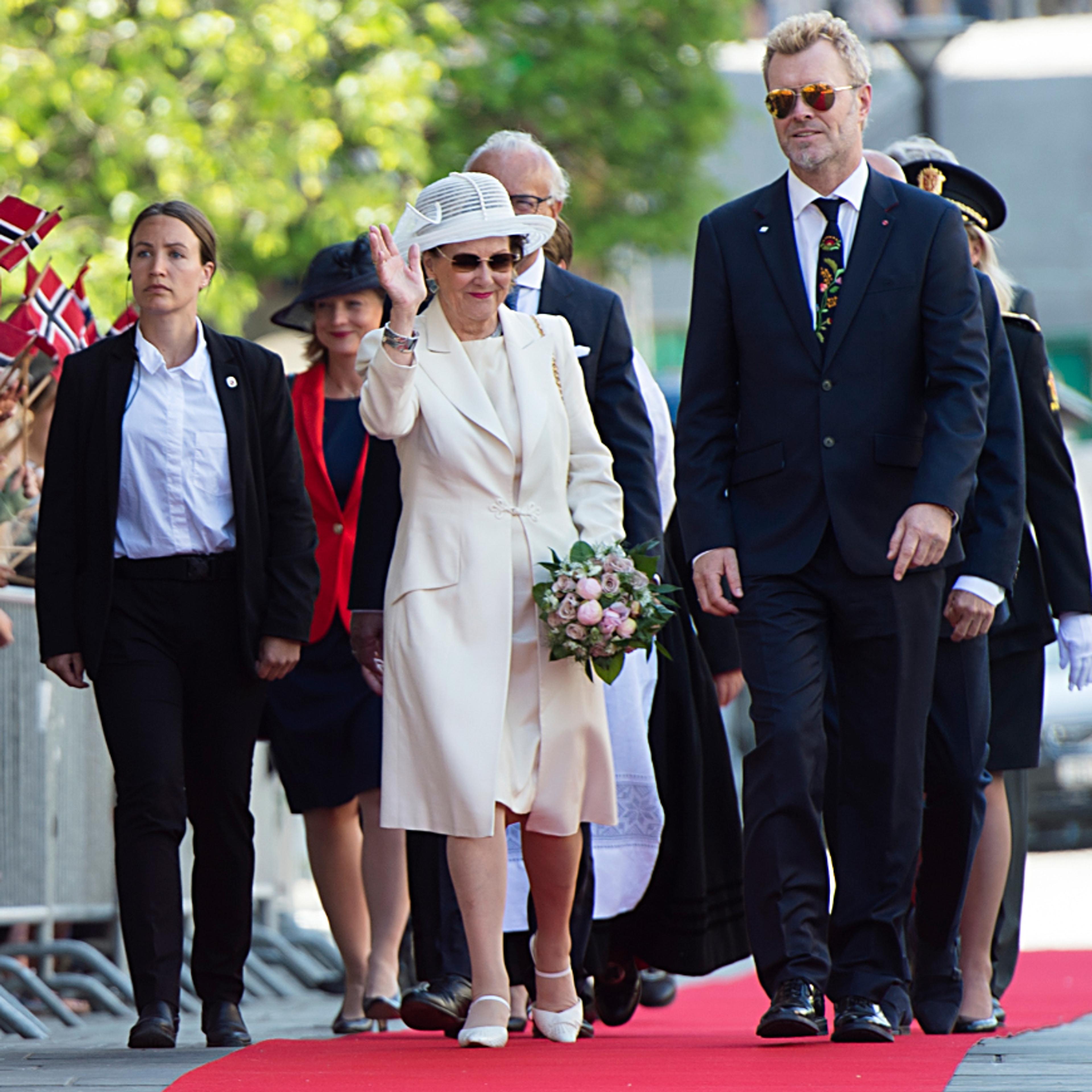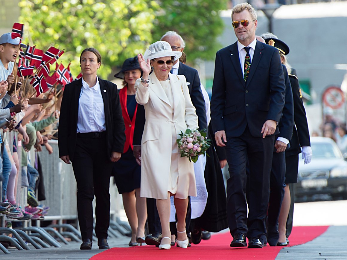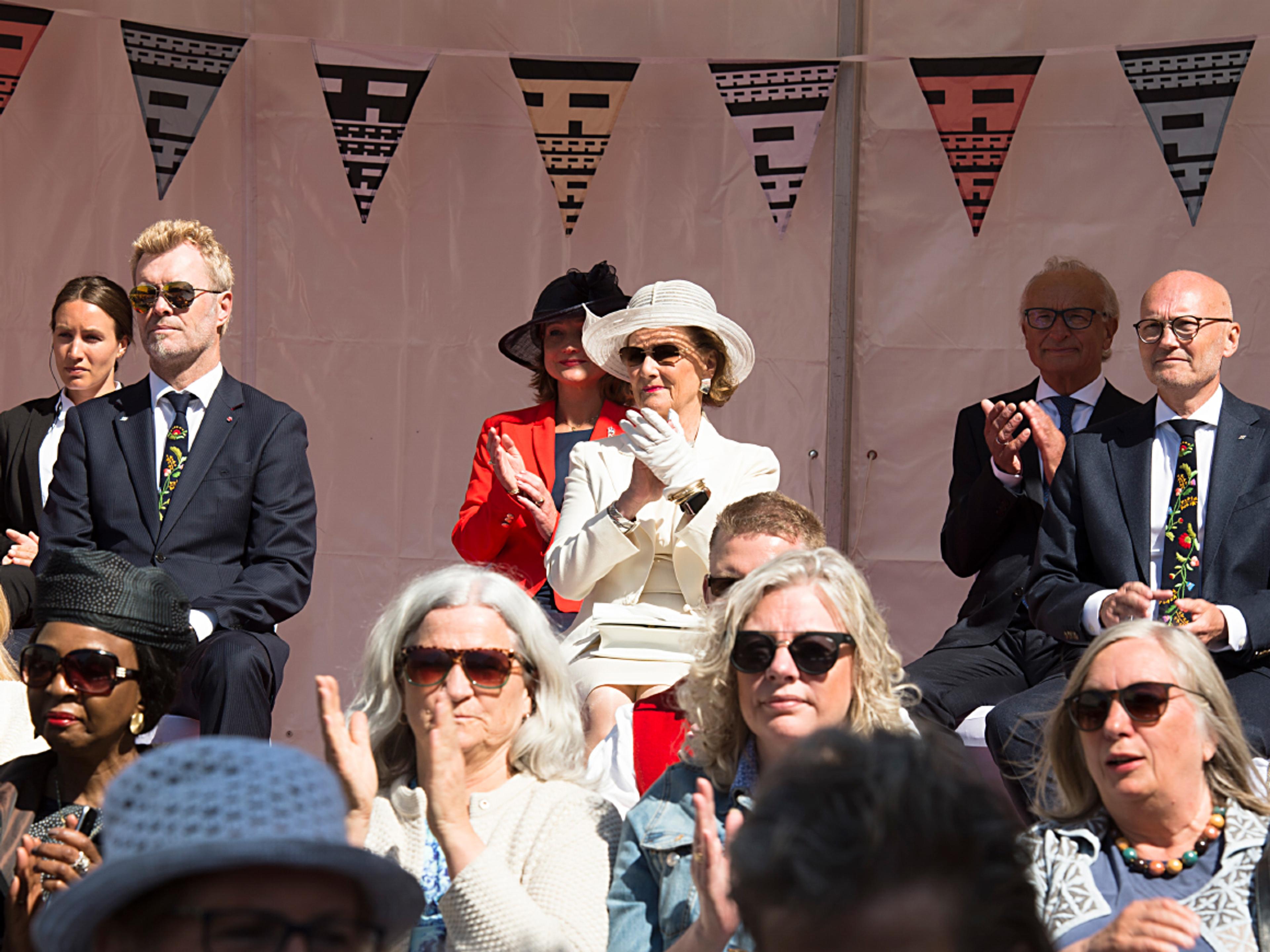 Deretter tok Dronninga plass på Kongetribunen på Torgallmenningen for sjølve opningsseremonien.