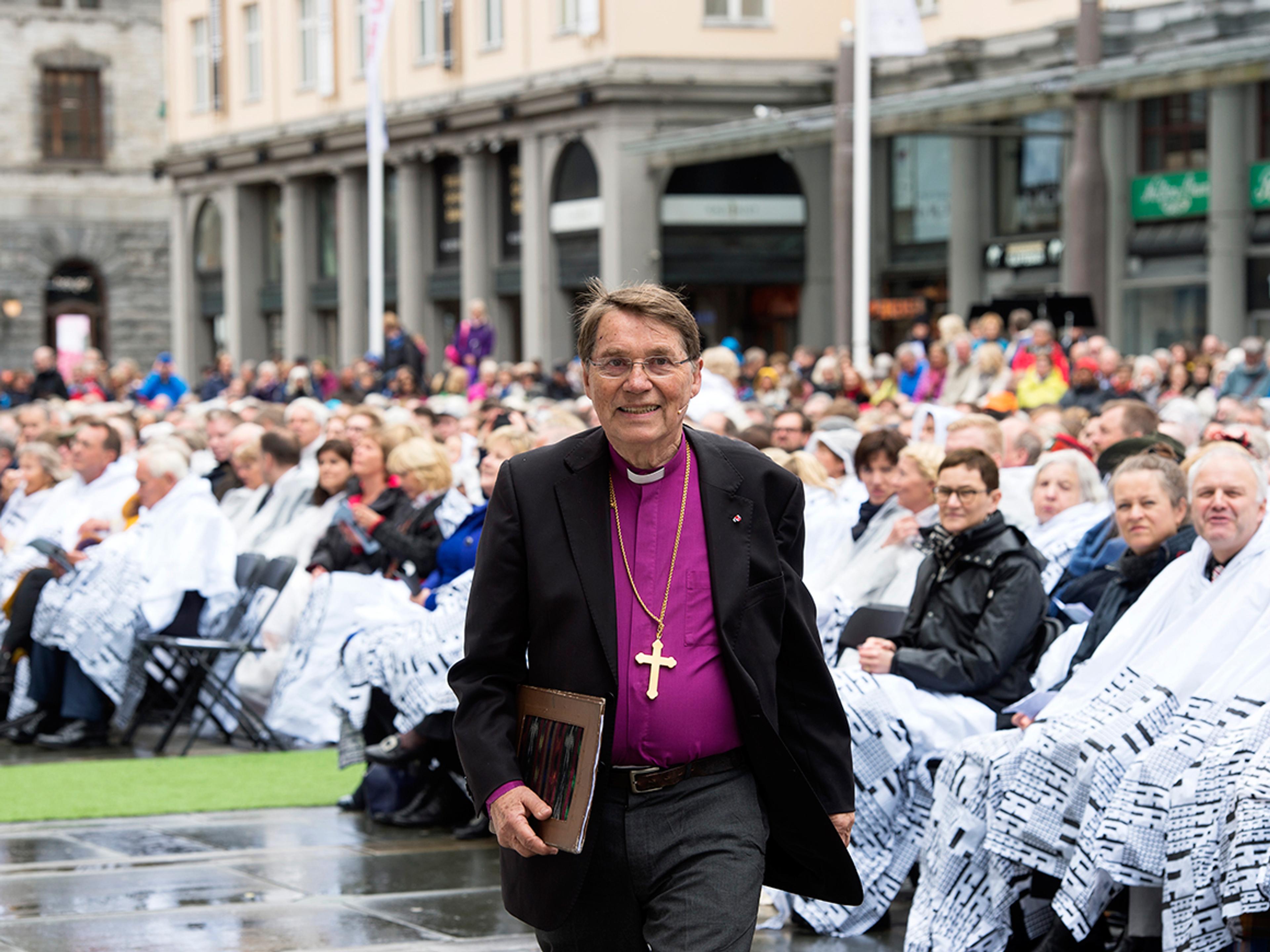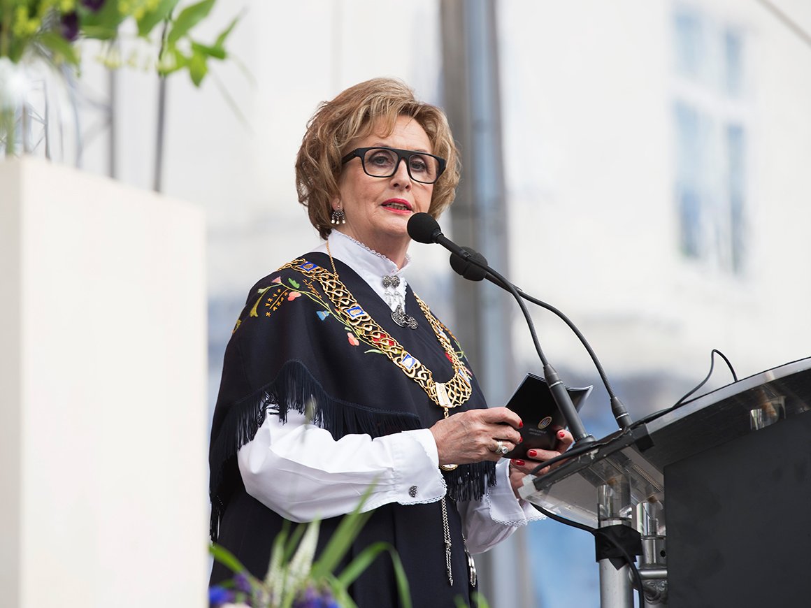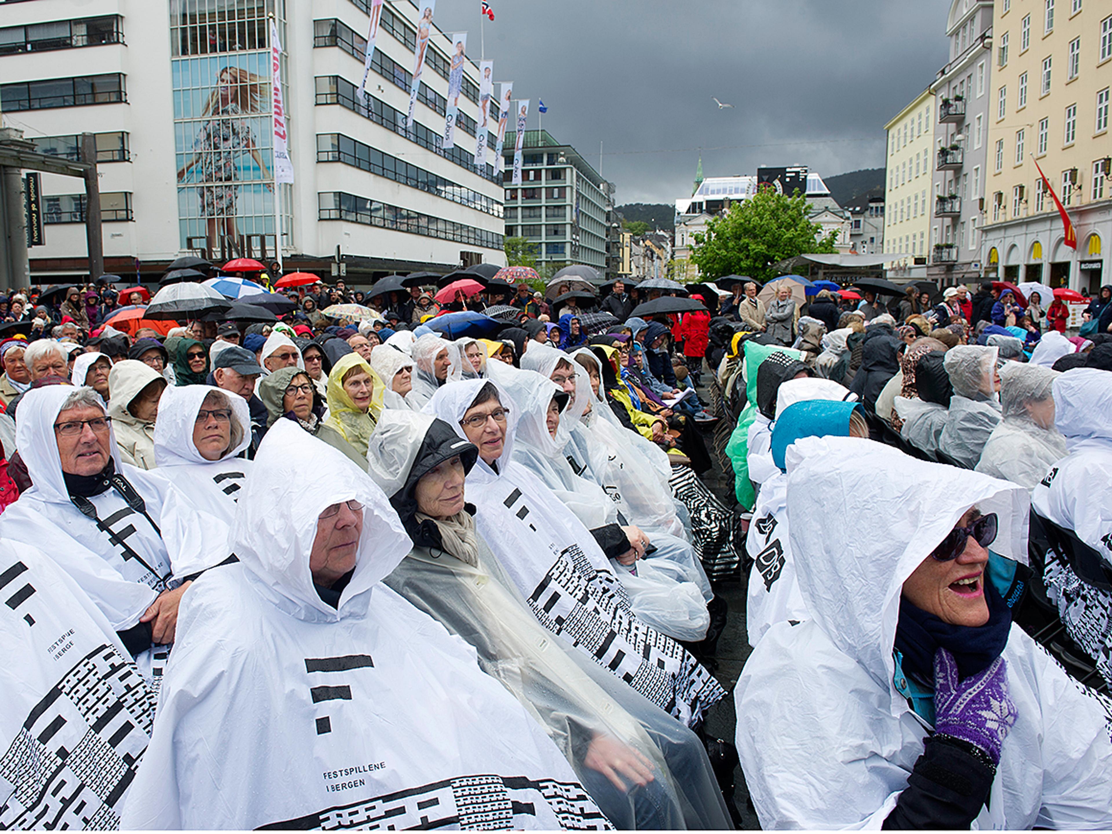 I Bergen har man nettopp gått bil bords i Håkonshallen, der Bergen kommune inviterer til lunsj i anledning festspillåpningen. Ordfører Trude Drevland er vert, og Dronningen er til stede sammen med blant annet statsminister Erna Solberg. Sjøforsvarets musikkorps står for det musikalske under måltidet, og Festspillenes styreleder, Åse Kleveland, vil holde tale.