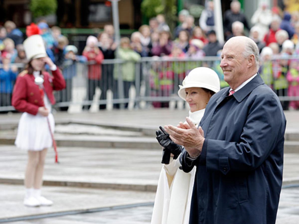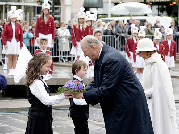 Tradisjonen tro møtte Kongeparet innbyggere og skolekorps ved det kjente møtestedet Den blå steinen på Kong Olav Vs plass i Bergen.