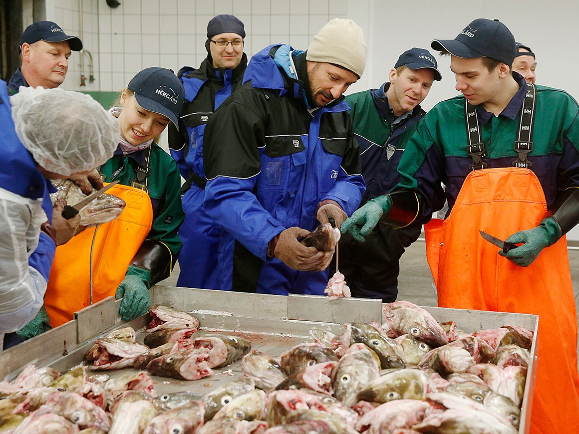Klokken 08.00 i dag morges kom Kronprins Haakon til fiskemottaket i Gryllefjord. Etter en orientering om mottaket, fikk Kronprinsen demonstrert hvordan man skjærer torsketunger. Dette er en vanlig bijobb for skoleungdom i fiskeværene, og de tjener gode penger i sesongen. I dag hadde nok ungdommene et klart overtak da Kronprinsen også fikk prøve seg.