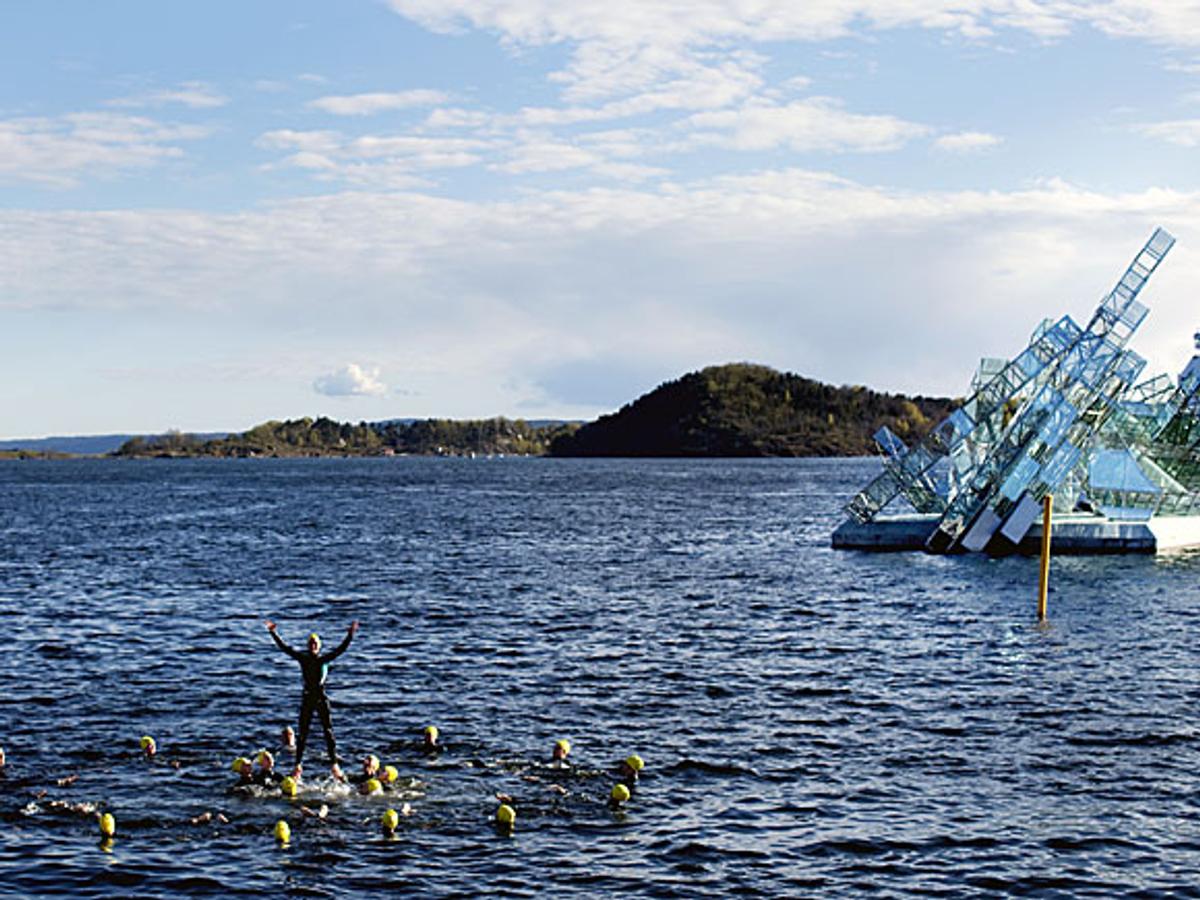 Den italienske kunstneren Monica Bonvicini vant den internasjonale utsmykkingskonkurransen i 2007 foran 152 andre med sitt verk ”She lies”. Vannskulpturen er i hovedsak laget av Hortensfirmaet Sias og er en tredimensjonal tolkning av Caspar David Friedrichs maleri ”Das Eismeer” (Ishavet).