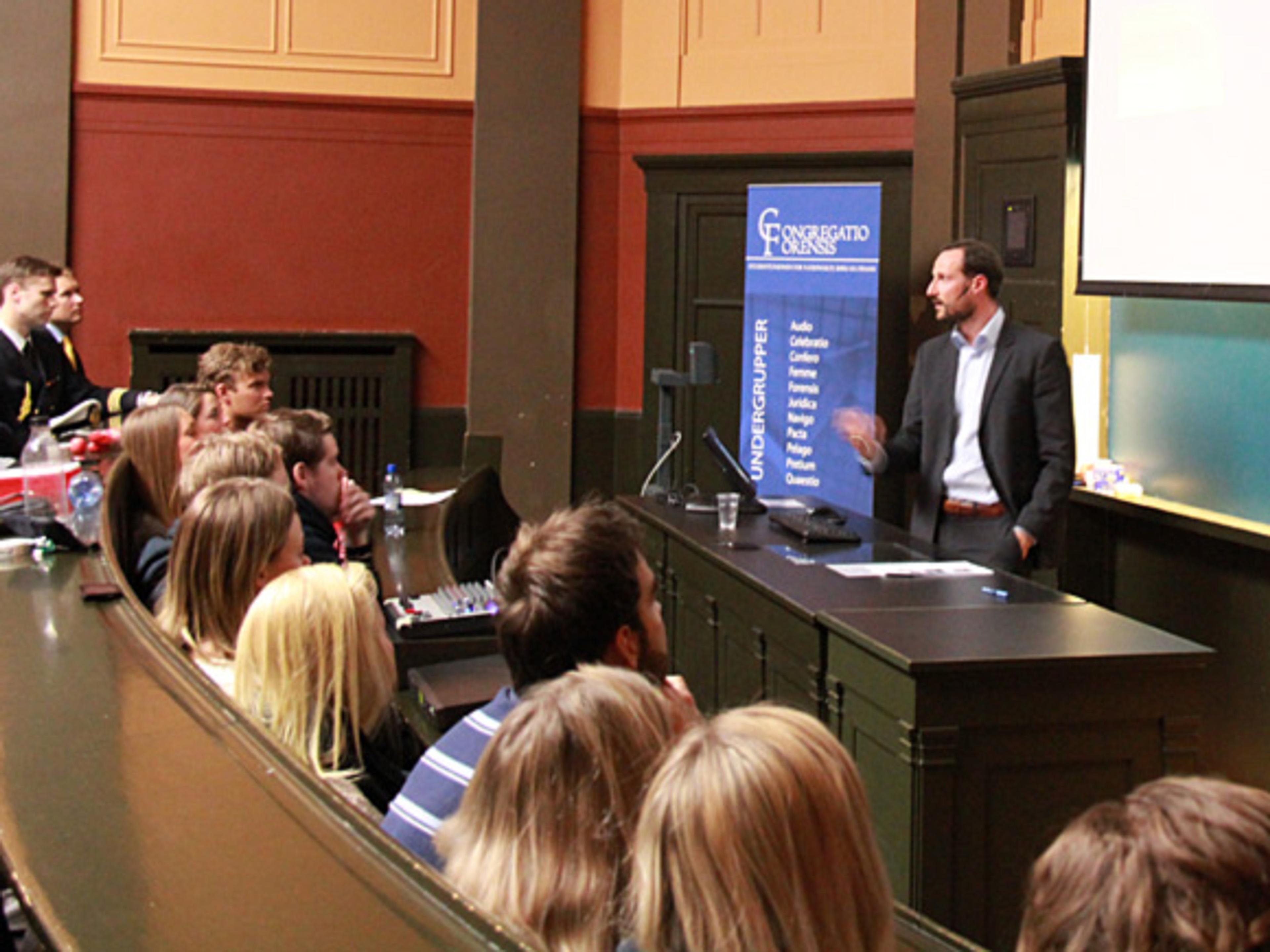 Kronprins Haakon fortalte engasjerte jusstudenter om sine egne opplevelser, blant annet som goodwillambassadør for FNs utviklingsprogram, UNDP. I sitt arbeid for UNDP har Kronprinsen engasjert seg spesielt i tusenårsmålene, der det overordnede målet er å utrydde ekstrem fattigdom og sult: