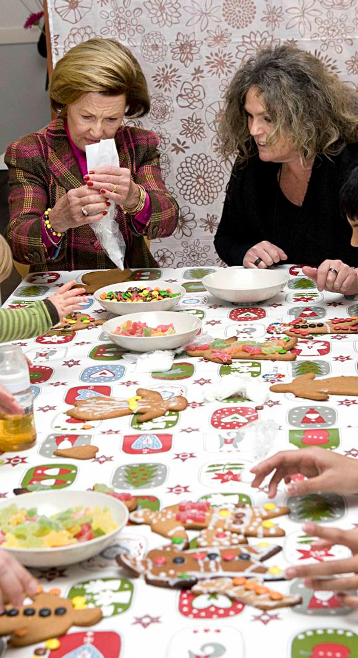Inne i storstua hadde 25 kvinner og barn samlet seg rundt et bord for å pynte pepperkaker. Dronningen overrakte en stor julekurv med småpakker før en gutt på fem år ledsaget Dronningen til sin plass ved bordet.