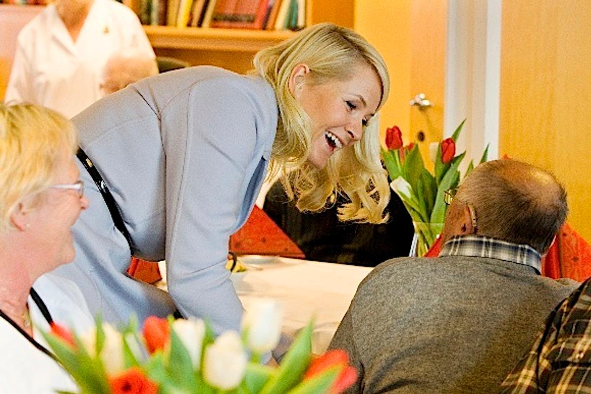 Inne i dagligstuen var de eldre samlet rundt småbord. Alle fikk hilse på Kronprins Haakon og Kronprinsesse Mette-Marit, før det ble servert julegløgg, rømmebrød og lefsekling.