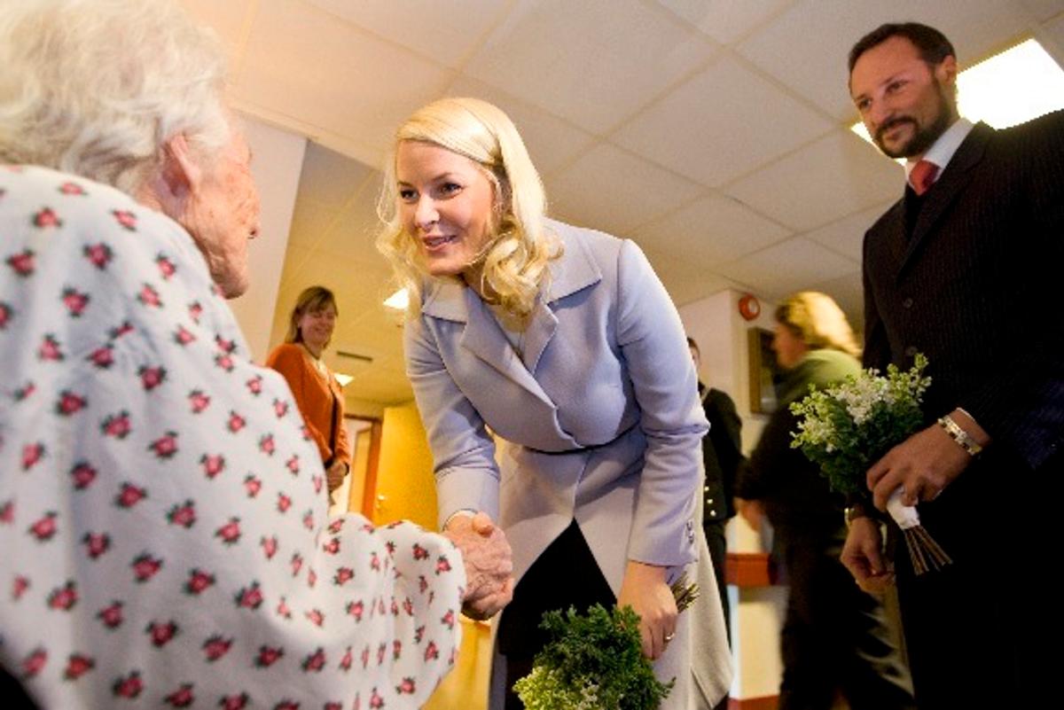 Etter å ha pratet litt med barna, ble Kronprinsparet overrakt blomster og ønsket velkommen av to av Geilotuns beboere, Haldis Haugen (83) og Alf Dyrekolbotn (95).