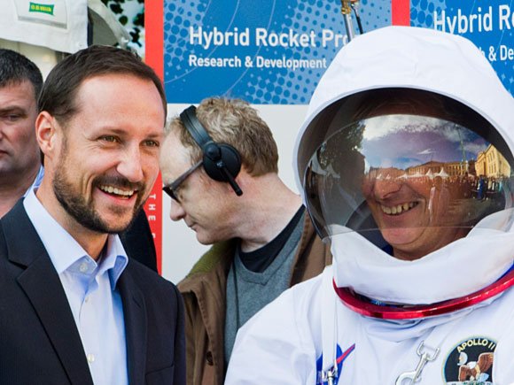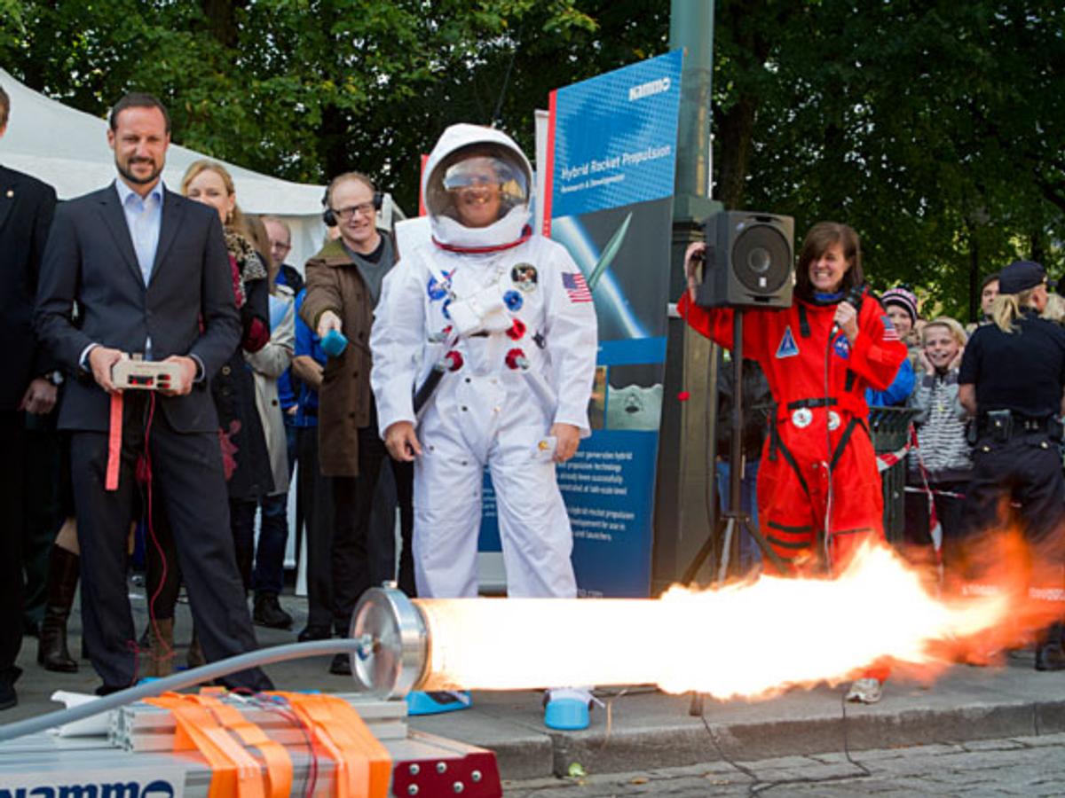 Norsk Romsenter tar for seg drivstoff og energityper, og her her demonstrerer Nammo Raufoss hybridmotorer for oppskyting av romraketter. Det spesielle med disse, er at de kan slås av og på - i steden for å måtte brenne seg ut når de først er satt i gang. Kronprinsen fikk selv prøve å skru en hybridmotor av og på - hver gang med et kraftig smell, til stor begeistring for barna på rundt boden.