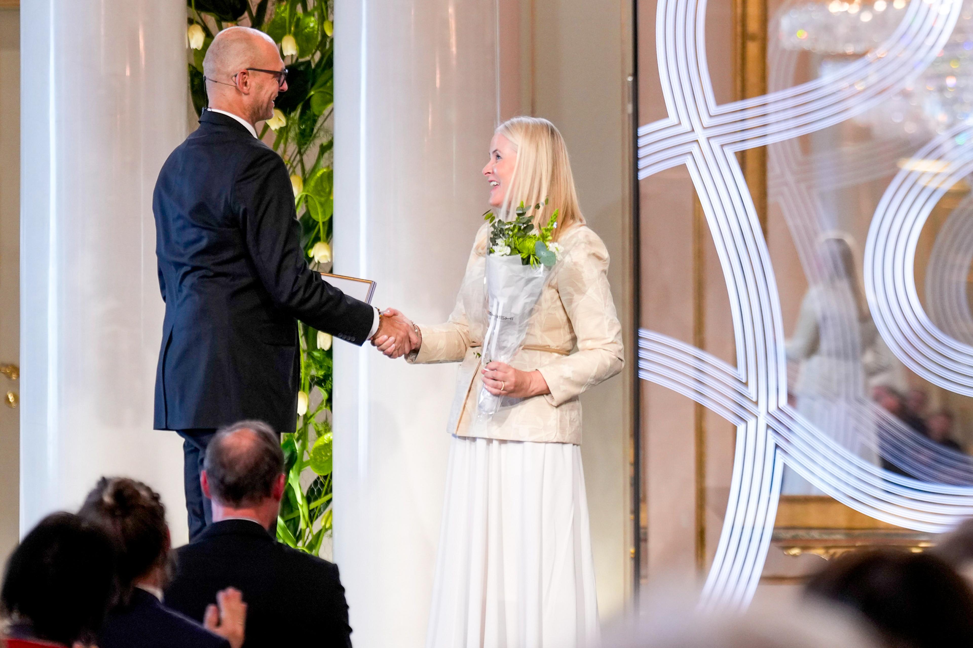 - I dag er vi så heldige å være sammen med Marilynne Robinson. Hun er en av vår tids mest anerkjente forfattere, og en av USAs fremste intellektuelle, sa Kronprinsessa. - I tillegg hedrer vi årets Fosseprisvinner, Paula Stevens, som har oversatt nærmere 90 bøker fra norsk til nederlandsk. Et stort livsverk.