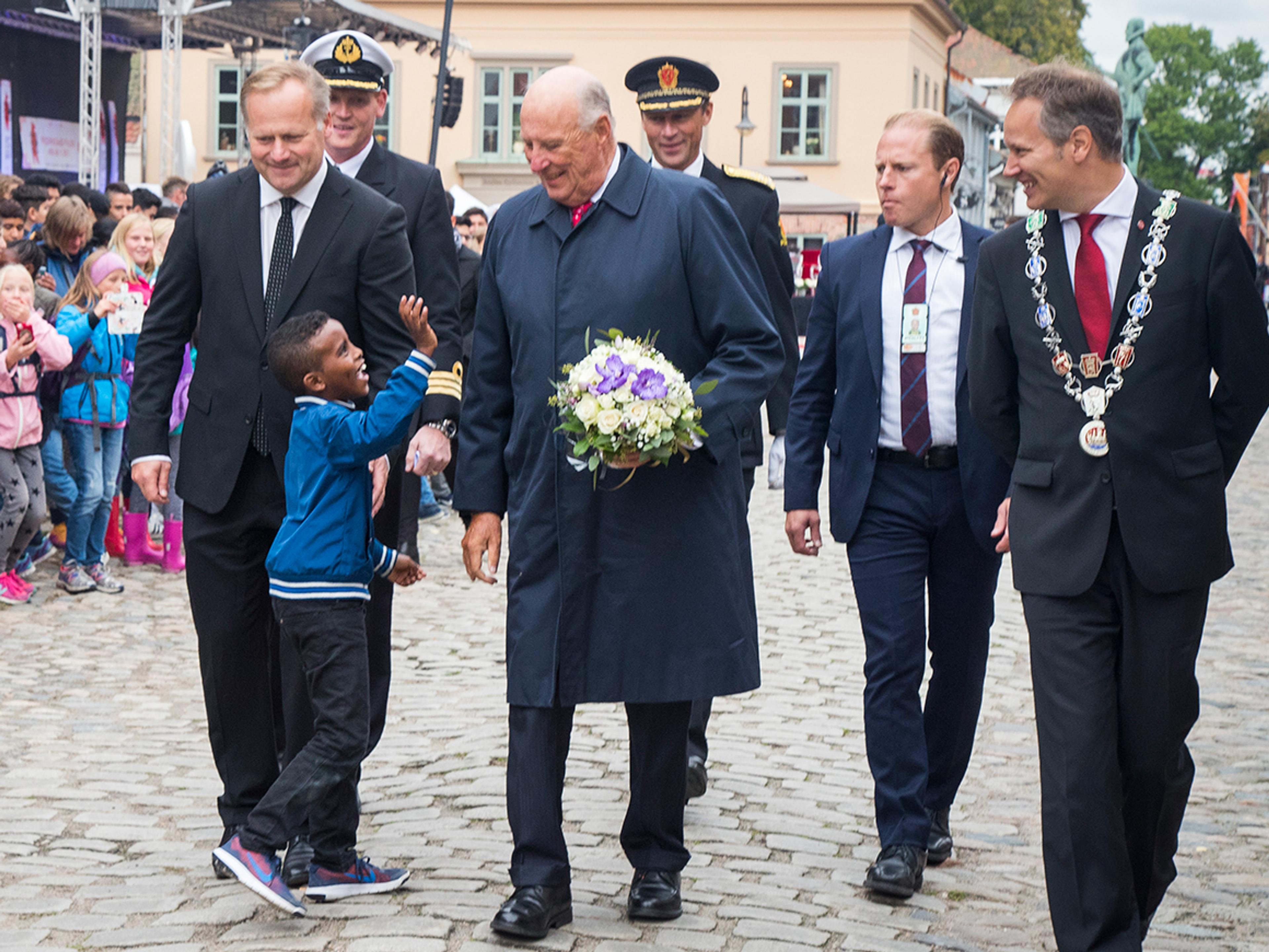 På torget i Gamlebyen ventet Oscar Maktabi og Ellinor Grotle Odenbratt, elever ved Cicignon skole, med blomster til Kongen.