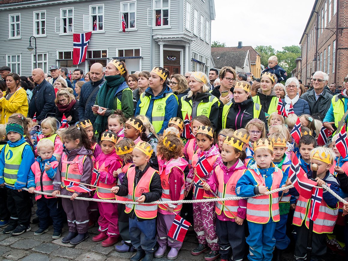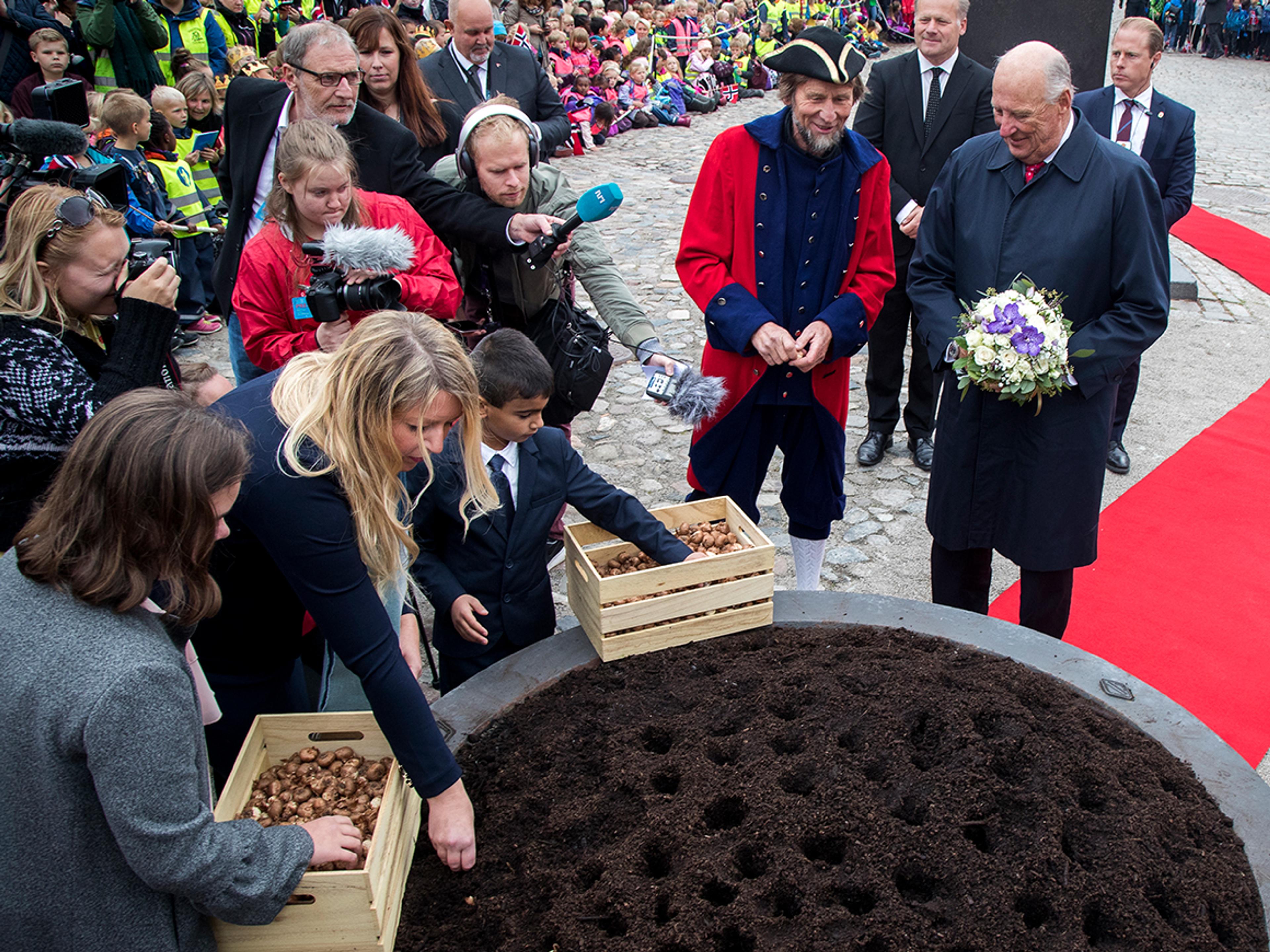 Det bor 80 000 mennesker i Fredrikstad, og hvert år settes like mange krokusløker som antall innbyggere. Etter blomsternedleggelsen ledsaget ordføreren Kongen bort til barna som så utførte denne symbolske og tradisjonelle handlingen.