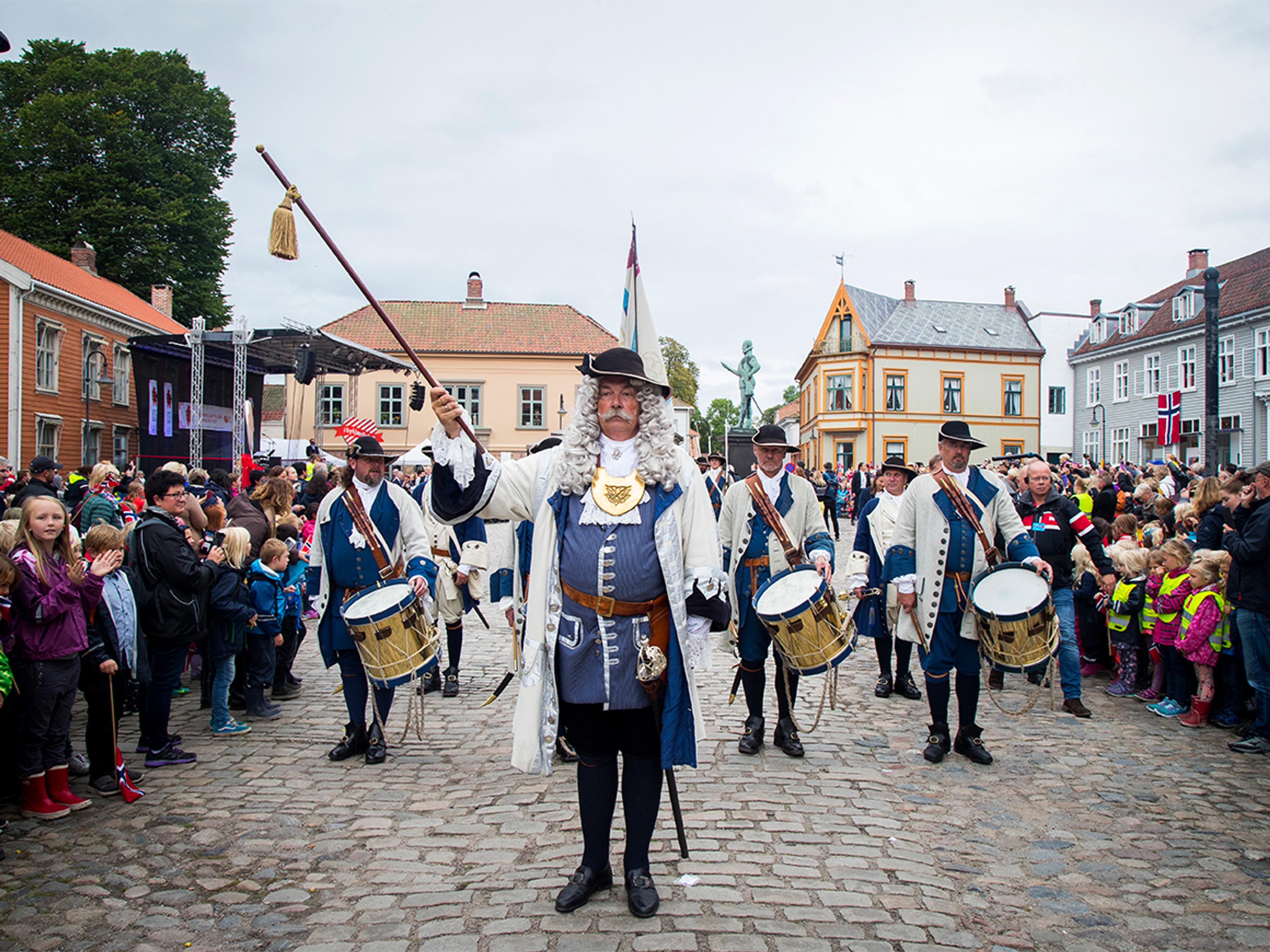 Flere hundre mennesker hadde møtt opp på torget for å feire byen sin og åpningen av Frederikfesten. Gamlebyen i Fredrikstad er ikke bare godt bevart. Det er et levende gatemiljø langs brosteinene med kafeer, gallerier og butikker.